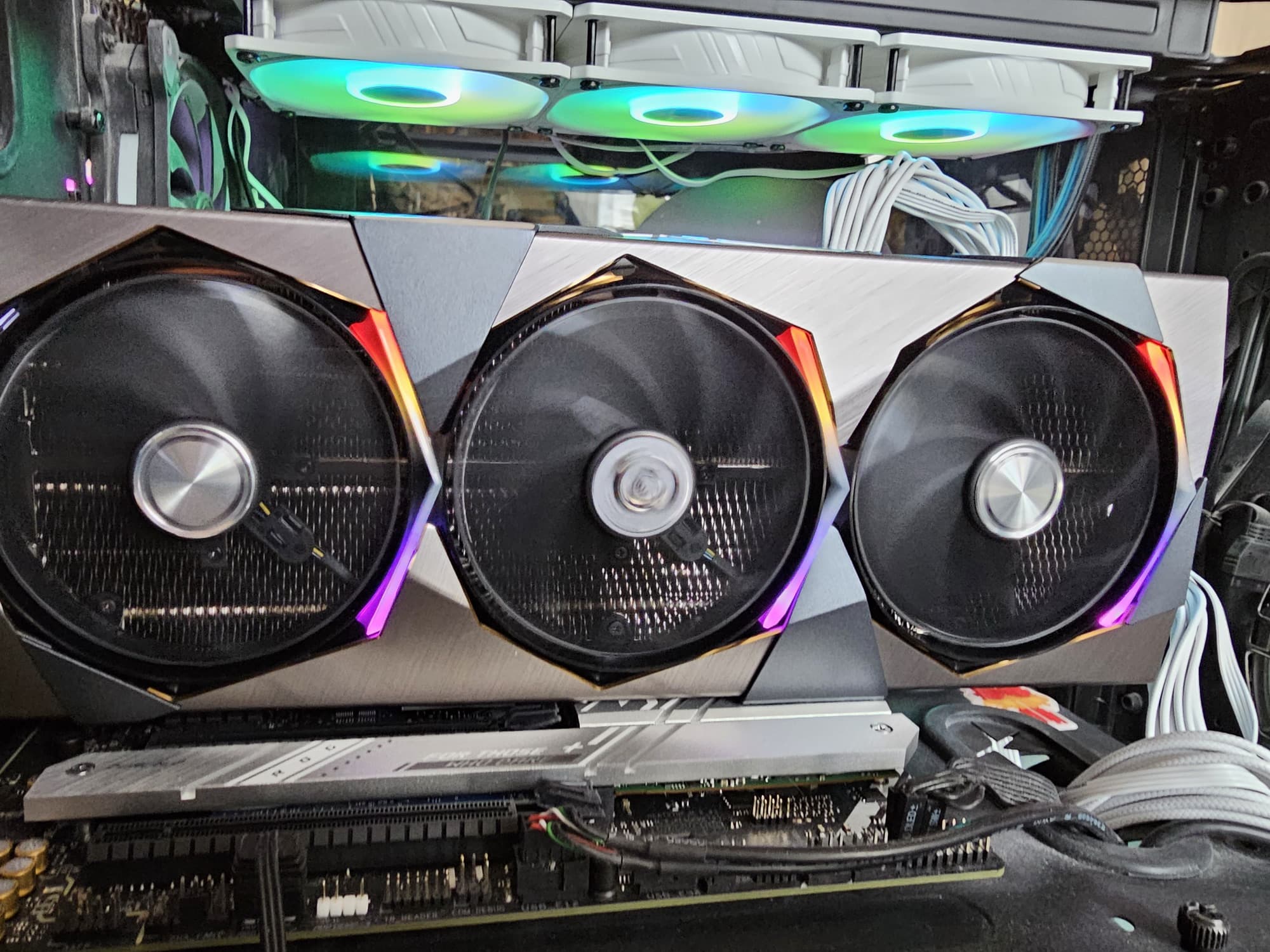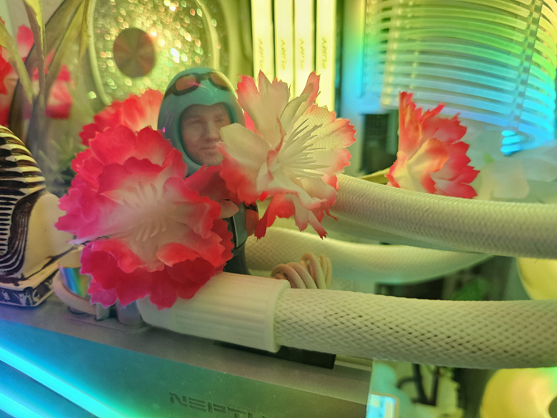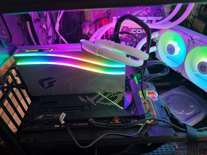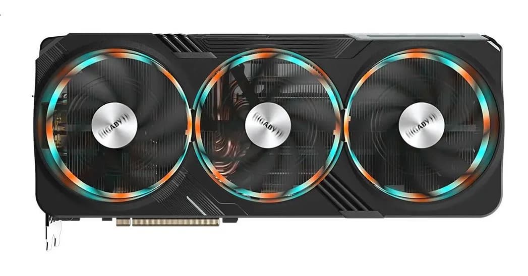 Выбранная карта Gigabyte имеет весьма приличные размеры: 35,5 см в длину и 16,5 см в высоту, а по ширине видеокарта занимает 4 слота в корпусе. При этом она потребляет не более 310-320 Вт, система охлаждения тихая, температурные параметры с запасом в пределах нормы. Карта Gigabyte имеет 16-контактный разъем питания версии PCIe 5.0 (в комплекте поставки имеется адаптер-переходник для подключения 3 разъемов питания типа PCIe 2.0). Изюминкой этой карты является оригинальная и стильная подсветка вентиляторов. Также стоит отметить наличие в комплекте поставки надежного (хоть и без изысков) кронштейна, с помощью которого хвостовая часть ускорителя жестко крепится к корпусу ПК, что гарантирует отсутствие провисания тяжелой карты.