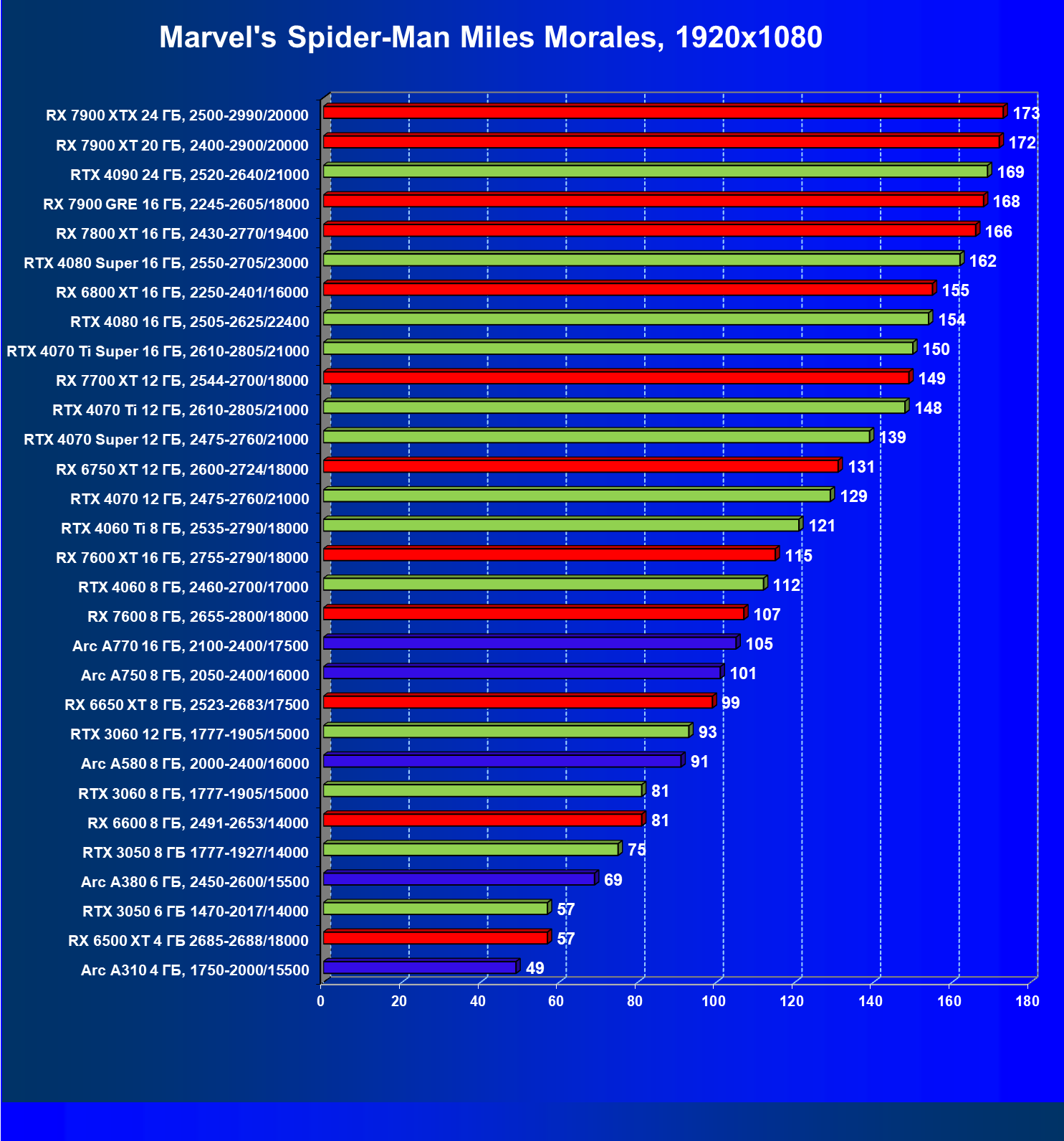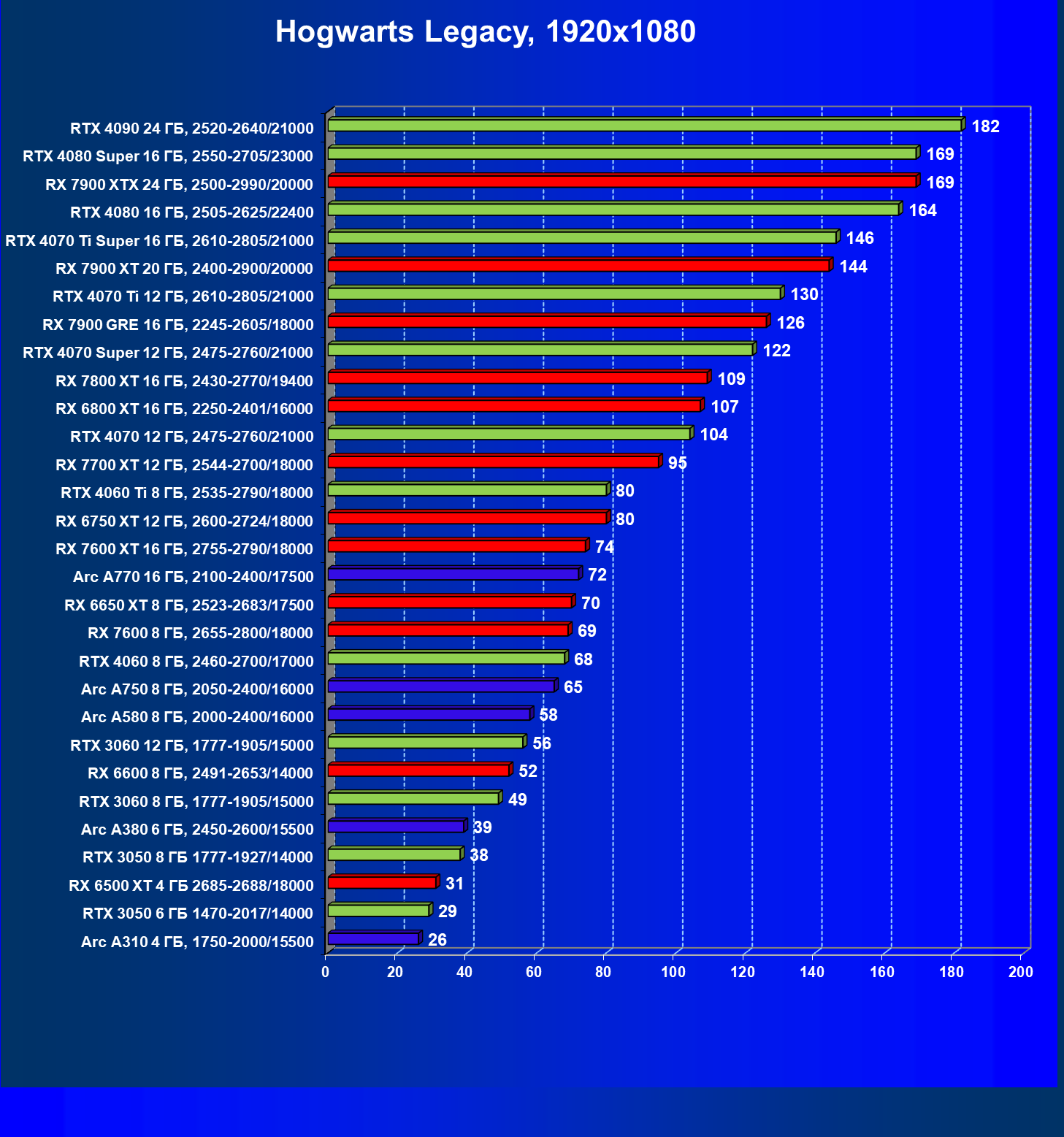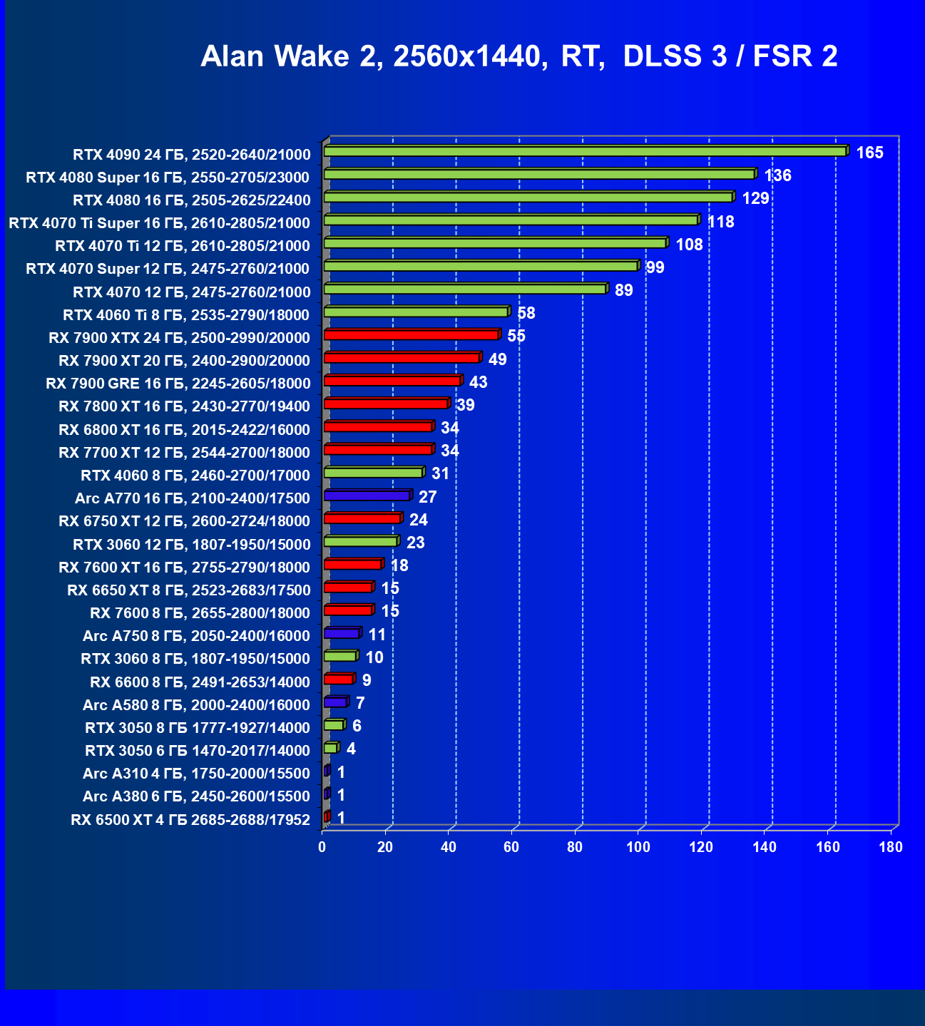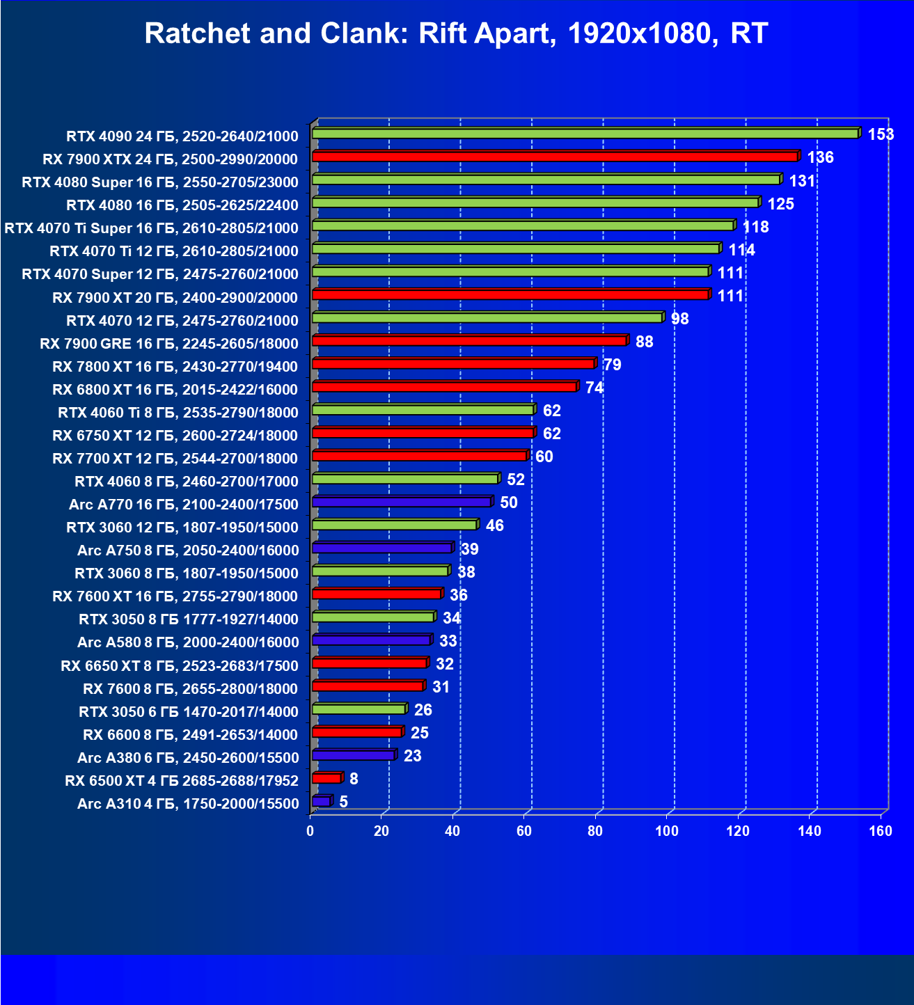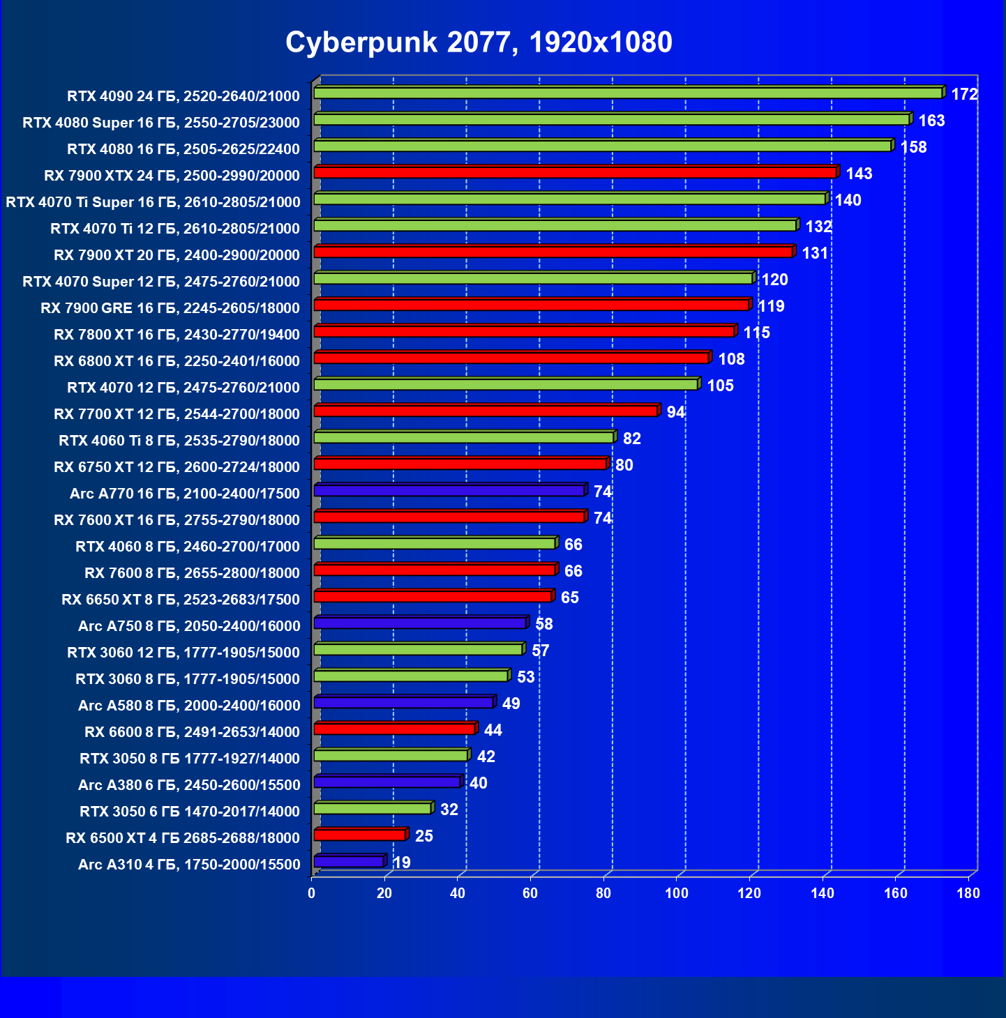 В разрешении Full HD отлично себя показывают Arc A750, Arc A580, GeForce RTX 3060 и Radeon RX 6600. GeForce RTX 3050 8 ГБ также обеспечивает приличный комфорт (но иногда придется снижать настройки графики). В ряде случаев в очень сложных по графике играх придется подбирать ускорители на уровень выше (либо понижать настройки графики).