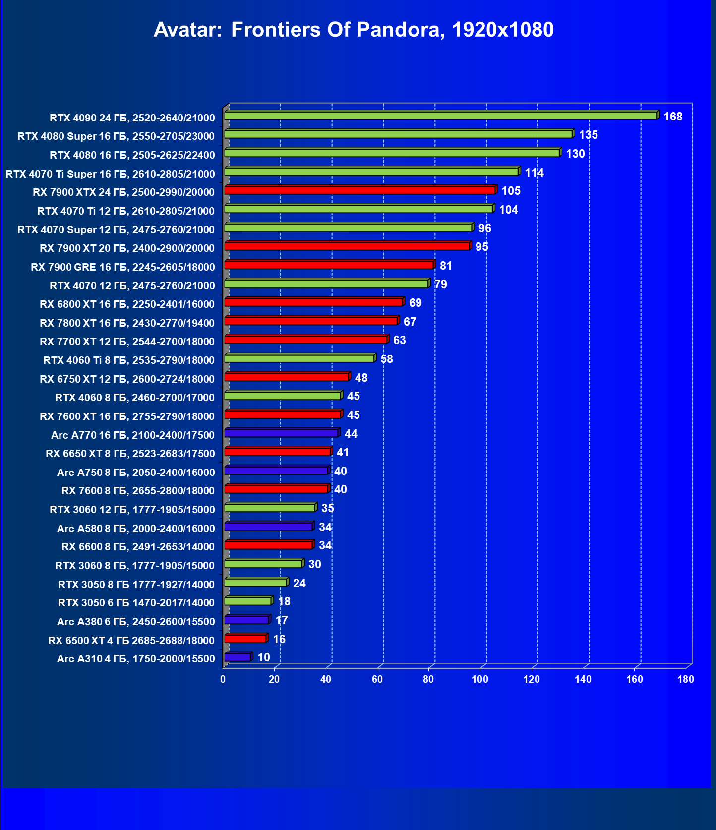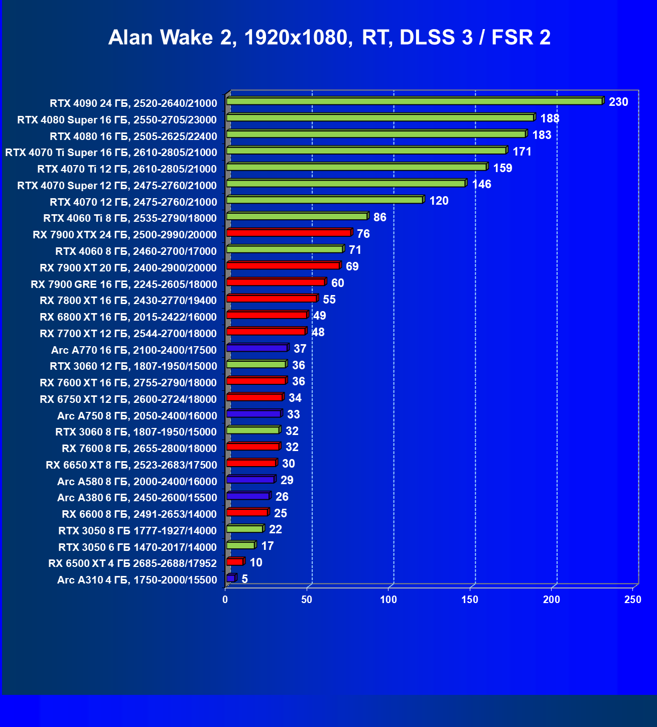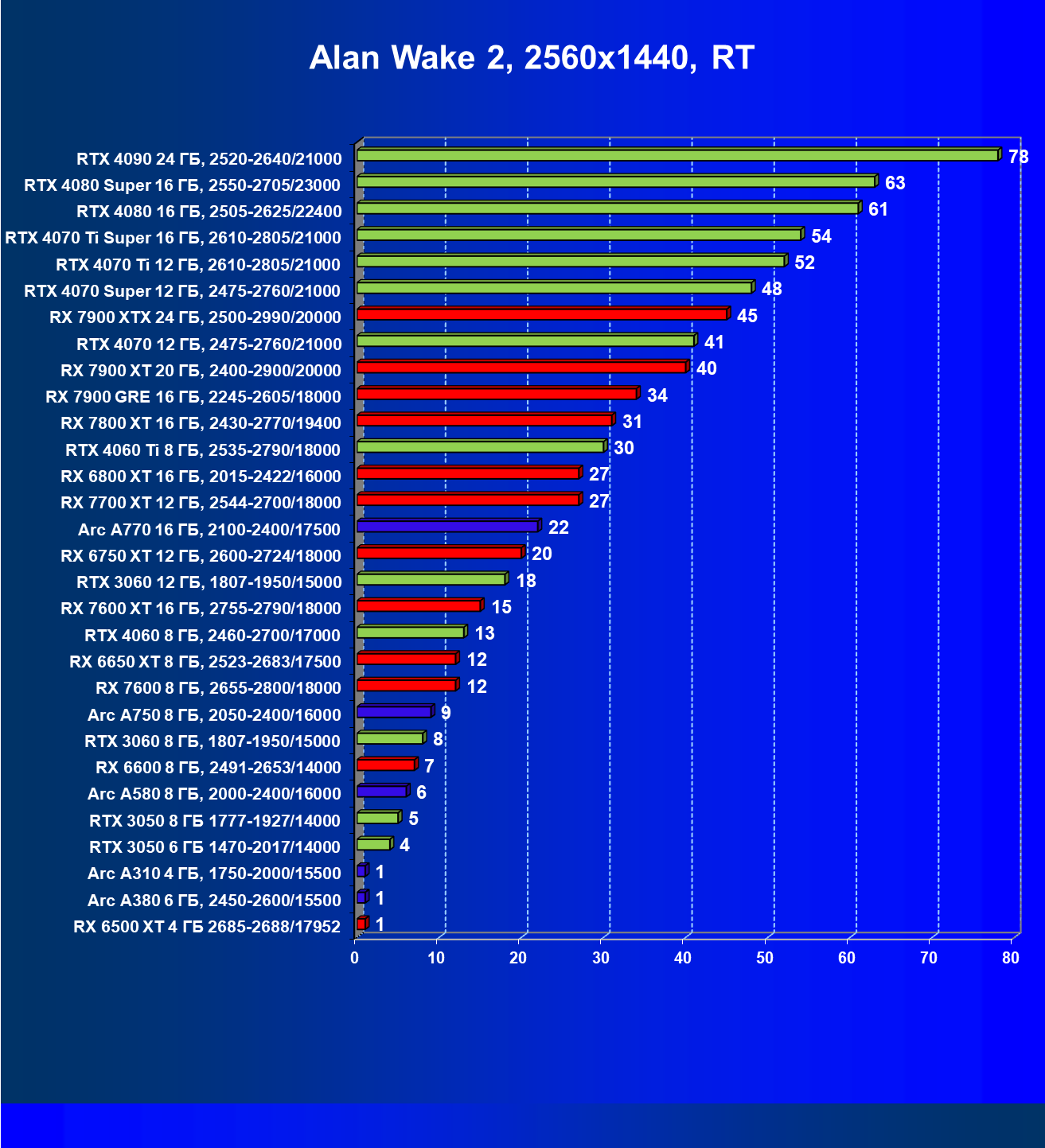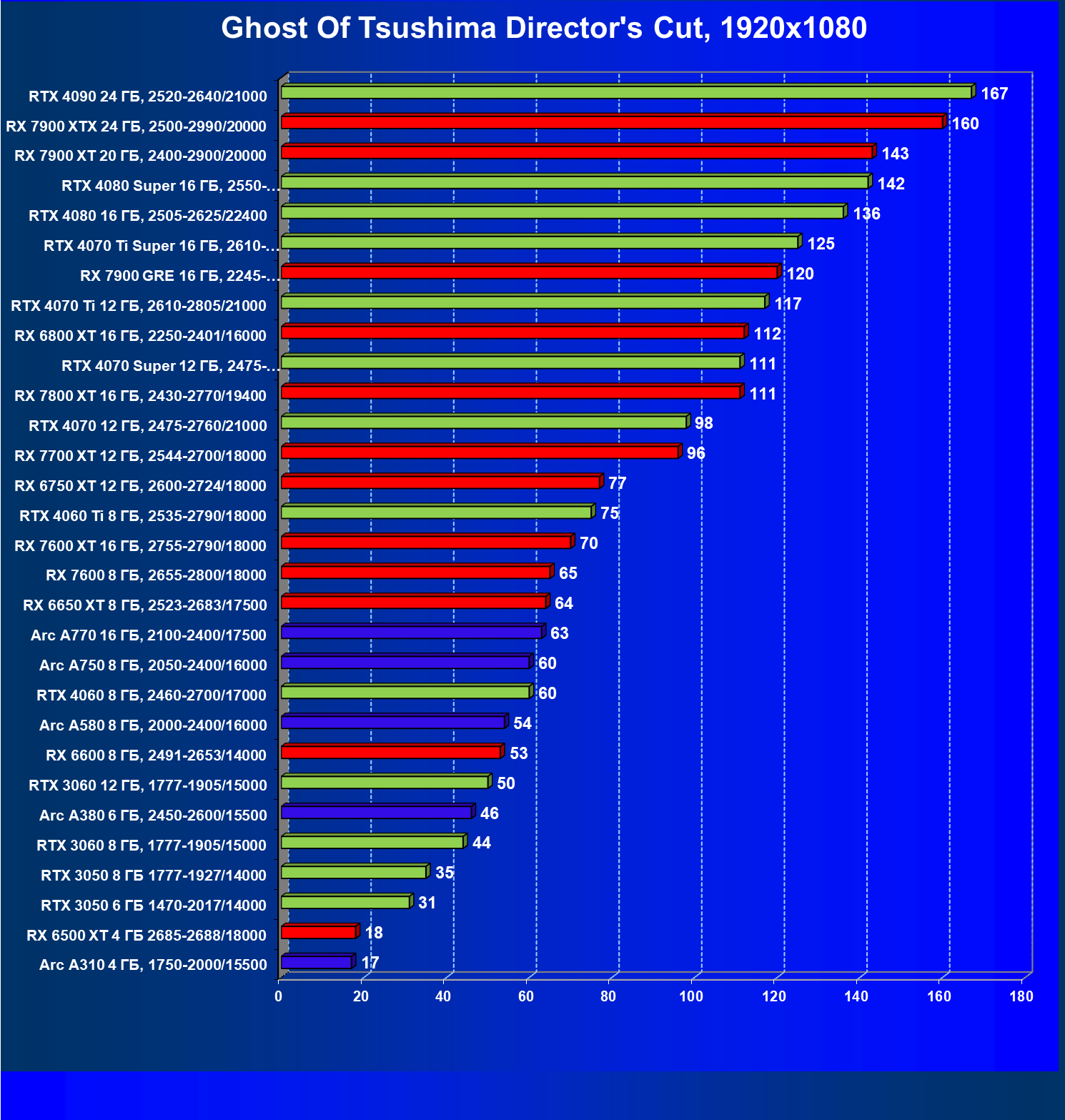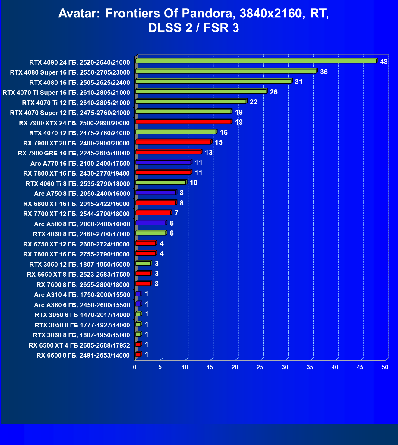 В разрешении Full HD отлично себя показывают Arc A750, Arc A580, GeForce RTX 3060 и Radeon RX 6600. GeForce RTX 3050 8 ГБ также обеспечивает приличный комфорт (но иногда придется снижать настройки графики). В ряде случаев в очень сложных по графике играх придется подбирать ускорители на уровень выше (либо понижать настройки графики).