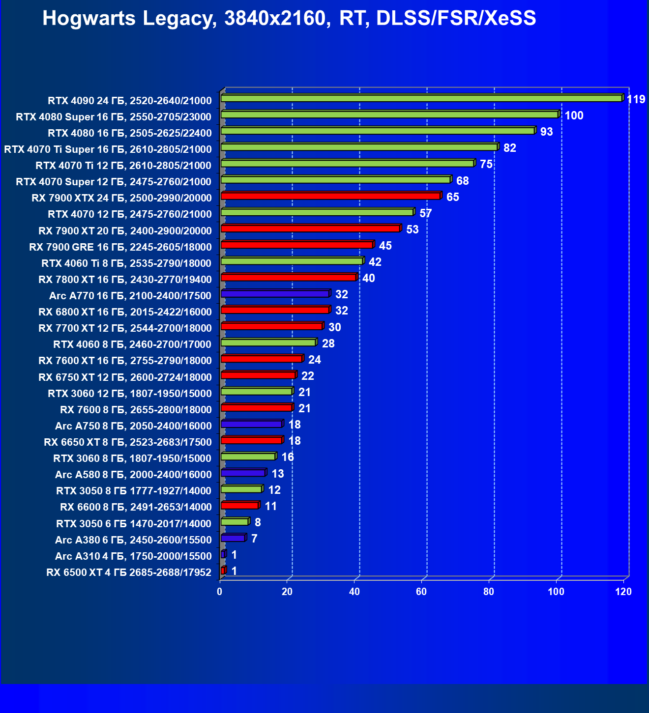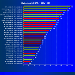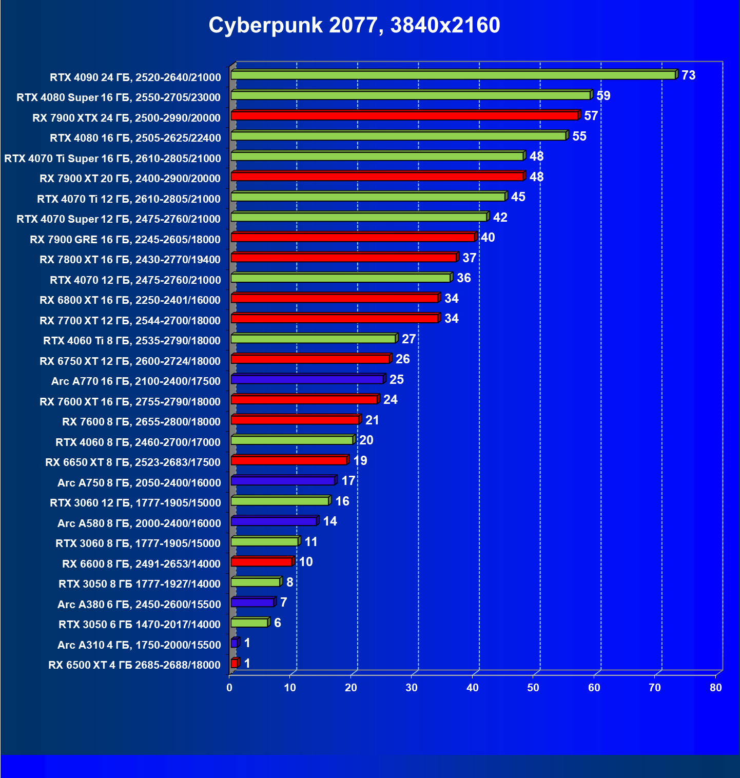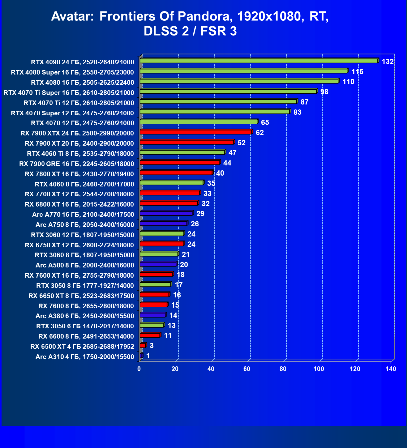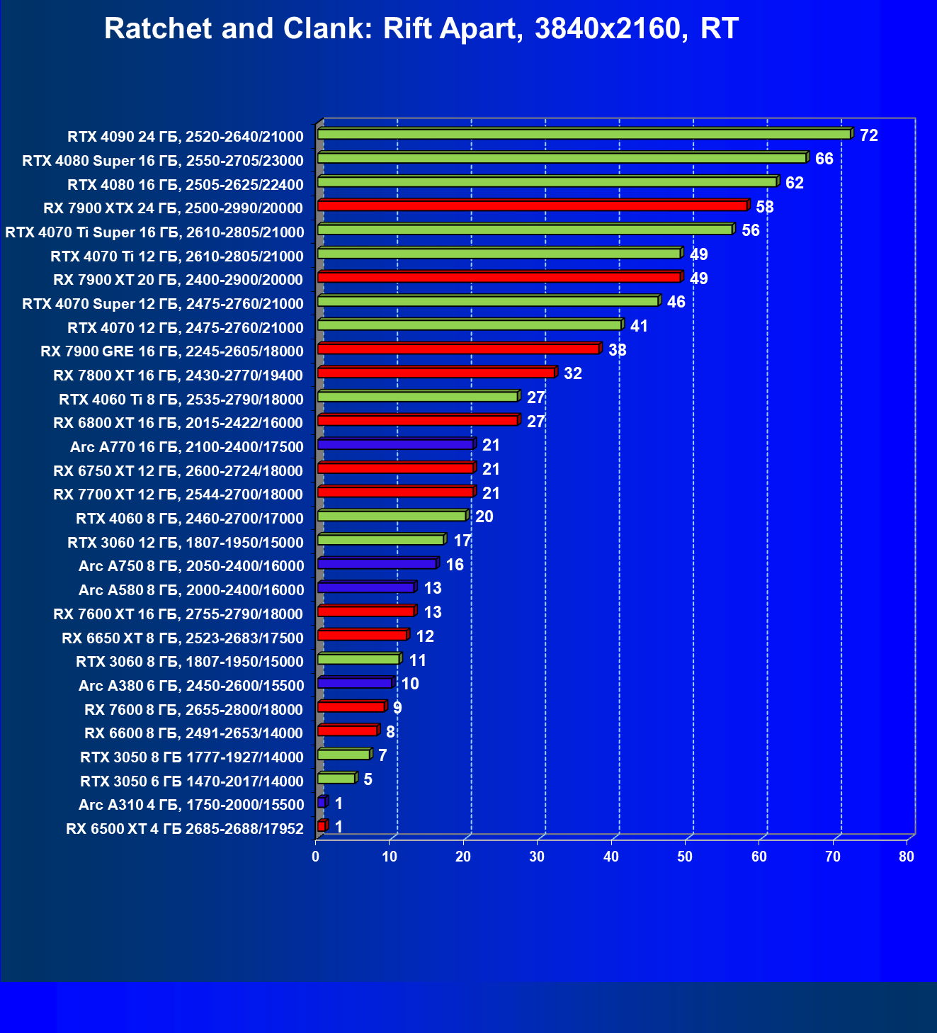 В разрешении Full HD отлично себя показывают Arc A750, Arc A580, GeForce RTX 3060 и Radeon RX 6600. GeForce RTX 3050 8 ГБ также обеспечивает приличный комфорт (но иногда придется снижать настройки графики). В ряде случаев в очень сложных по графике играх придется подбирать ускорители на уровень выше (либо понижать настройки графики).
