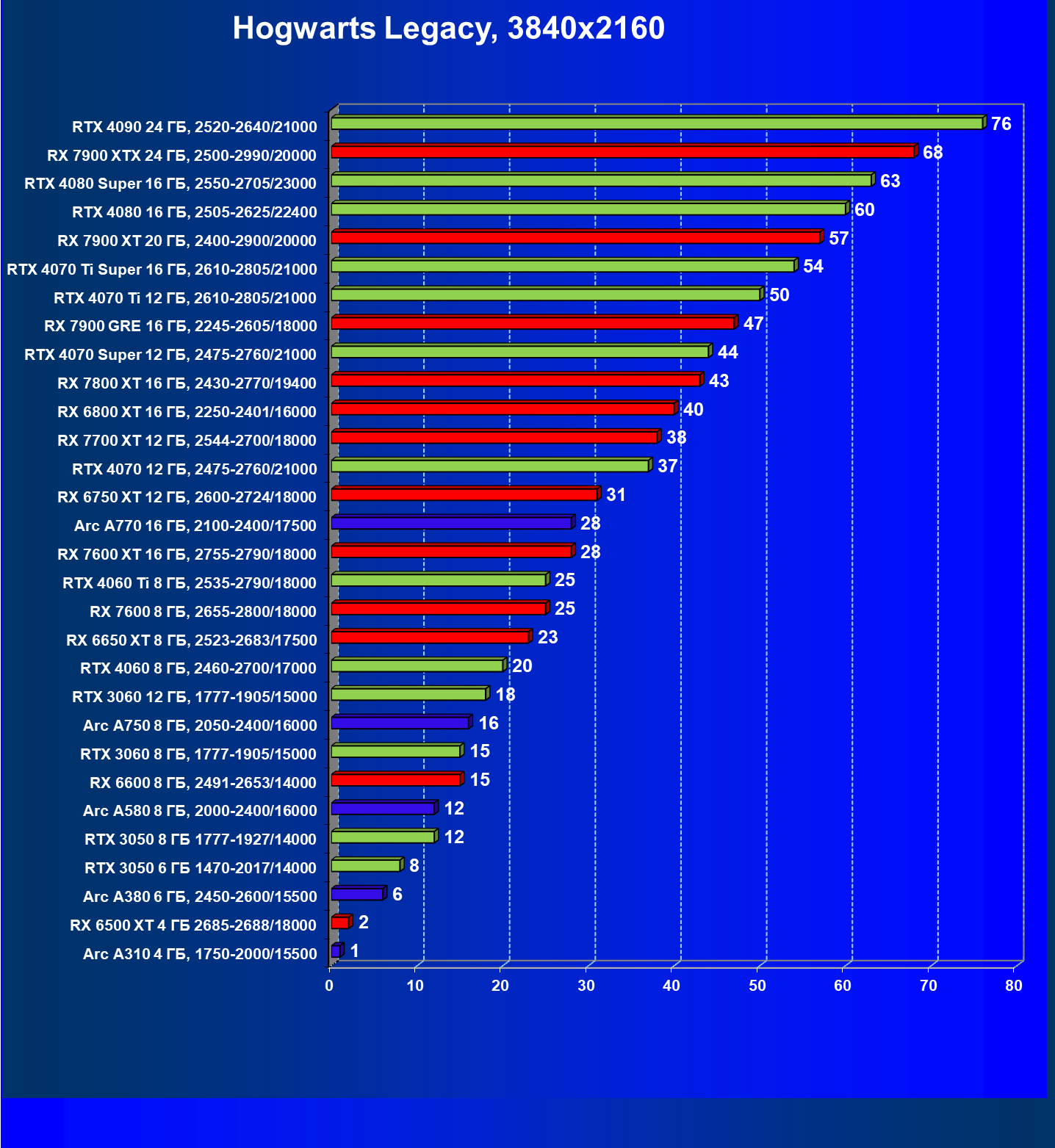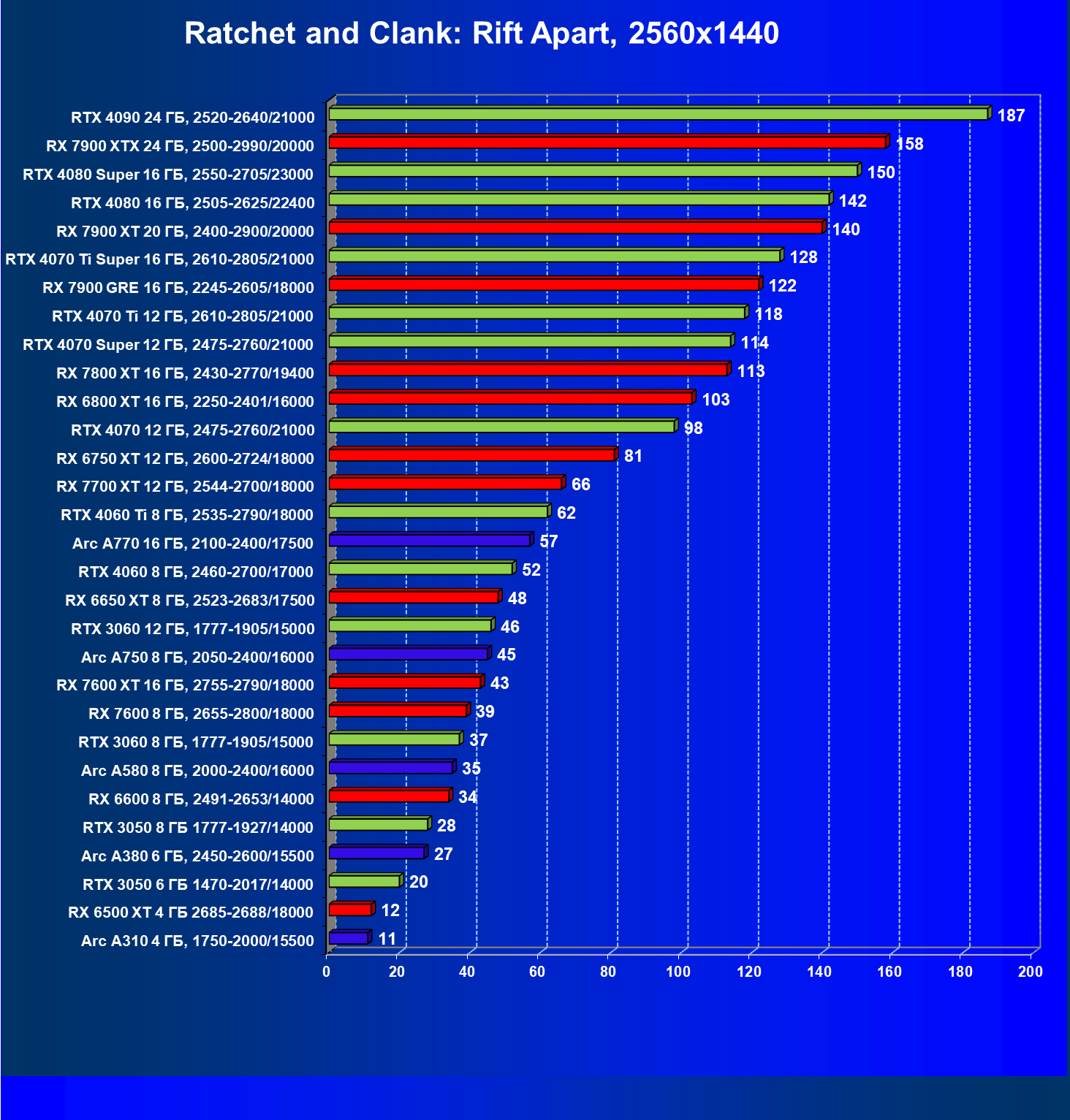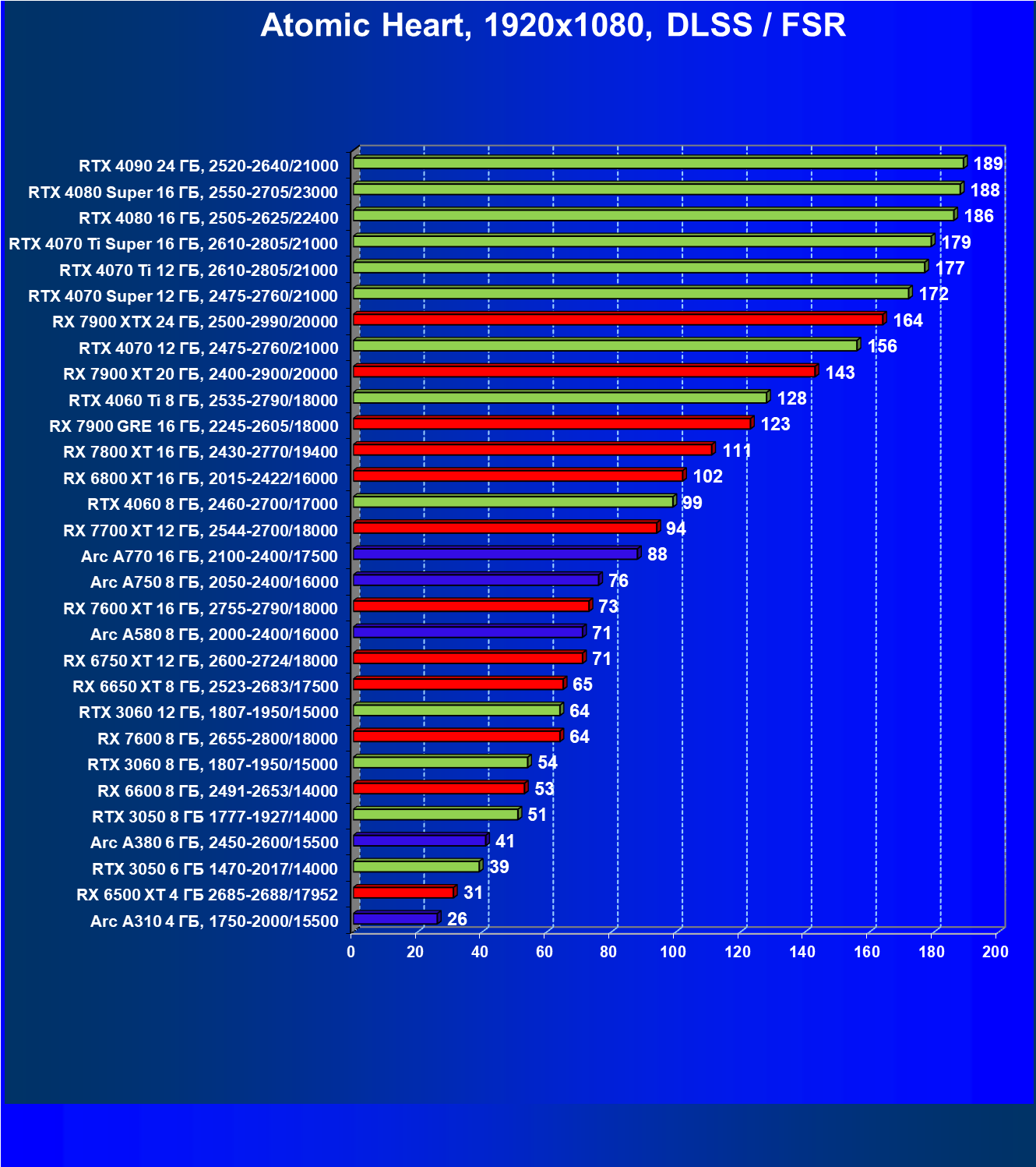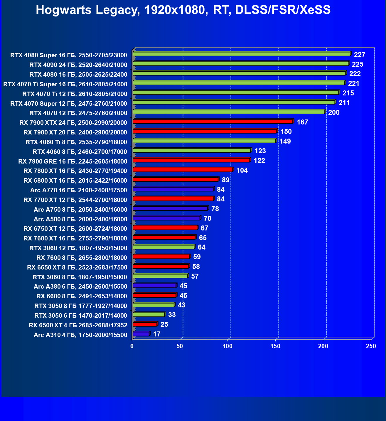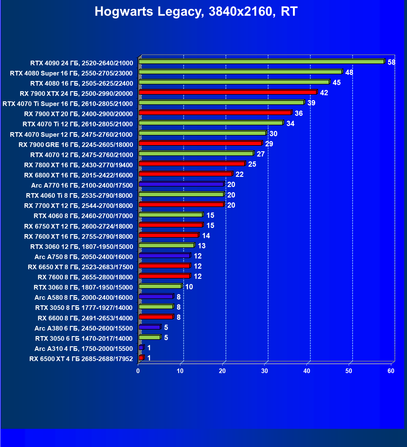 В разрешении Full HD отлично себя показывают Arc A750, Arc A580, GeForce RTX 3060 и Radeon RX 6600. GeForce RTX 3050 8 ГБ также обеспечивает приличный комфорт (но иногда придется снижать настройки графики). В ряде случаев в очень сложных по графике играх придется подбирать ускорители на уровень выше (либо понижать настройки графики).
