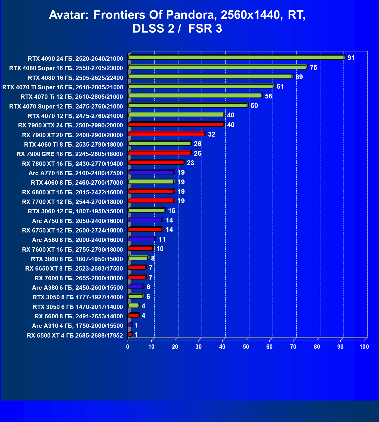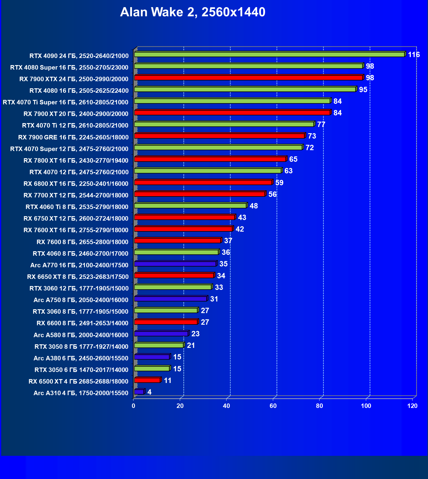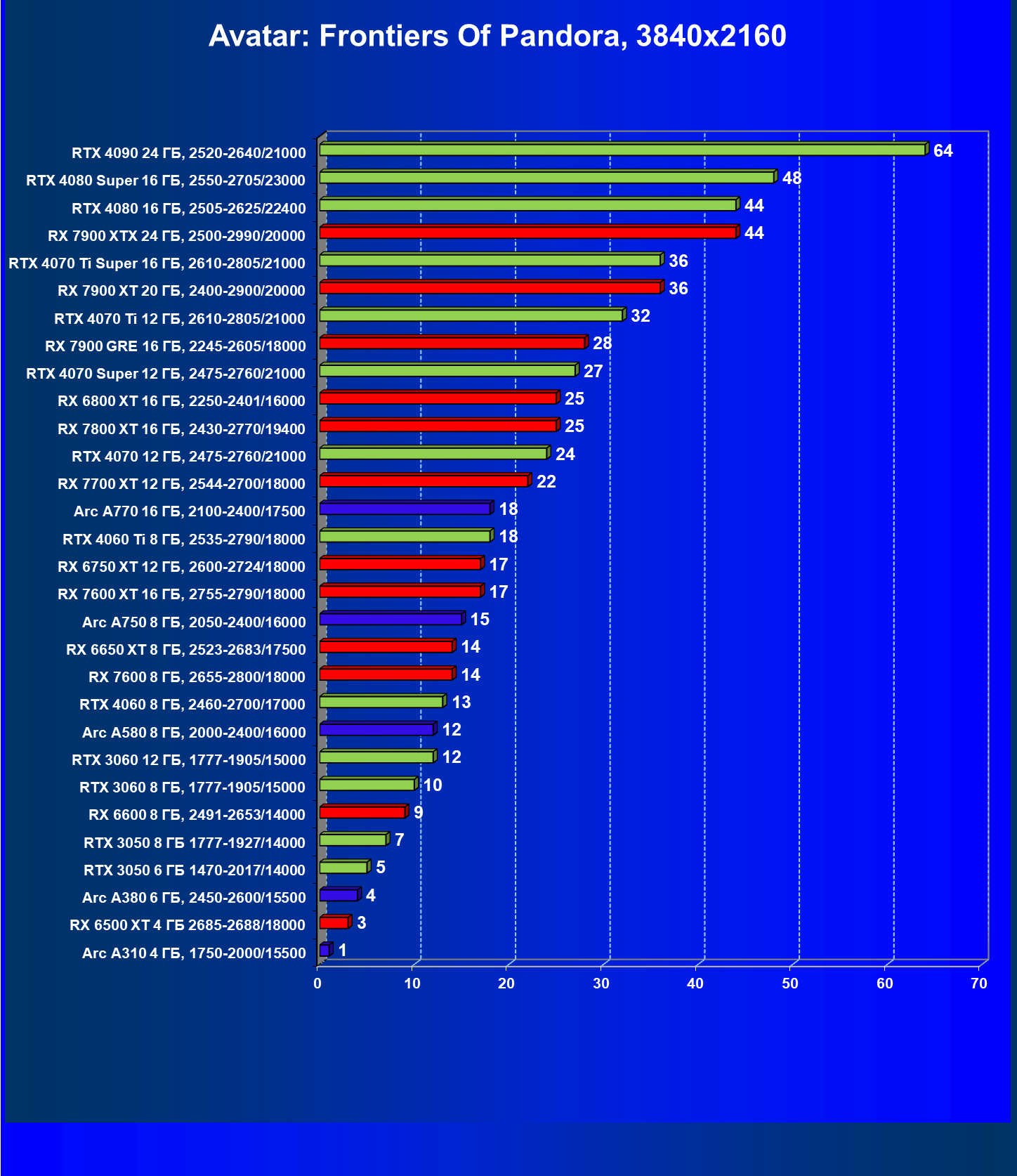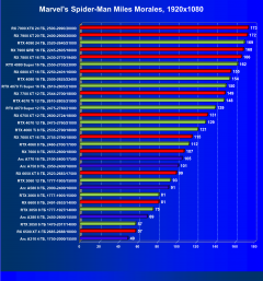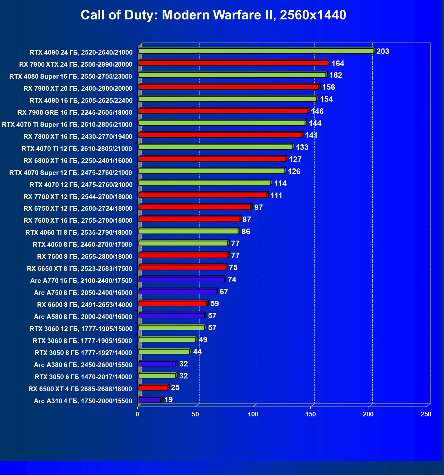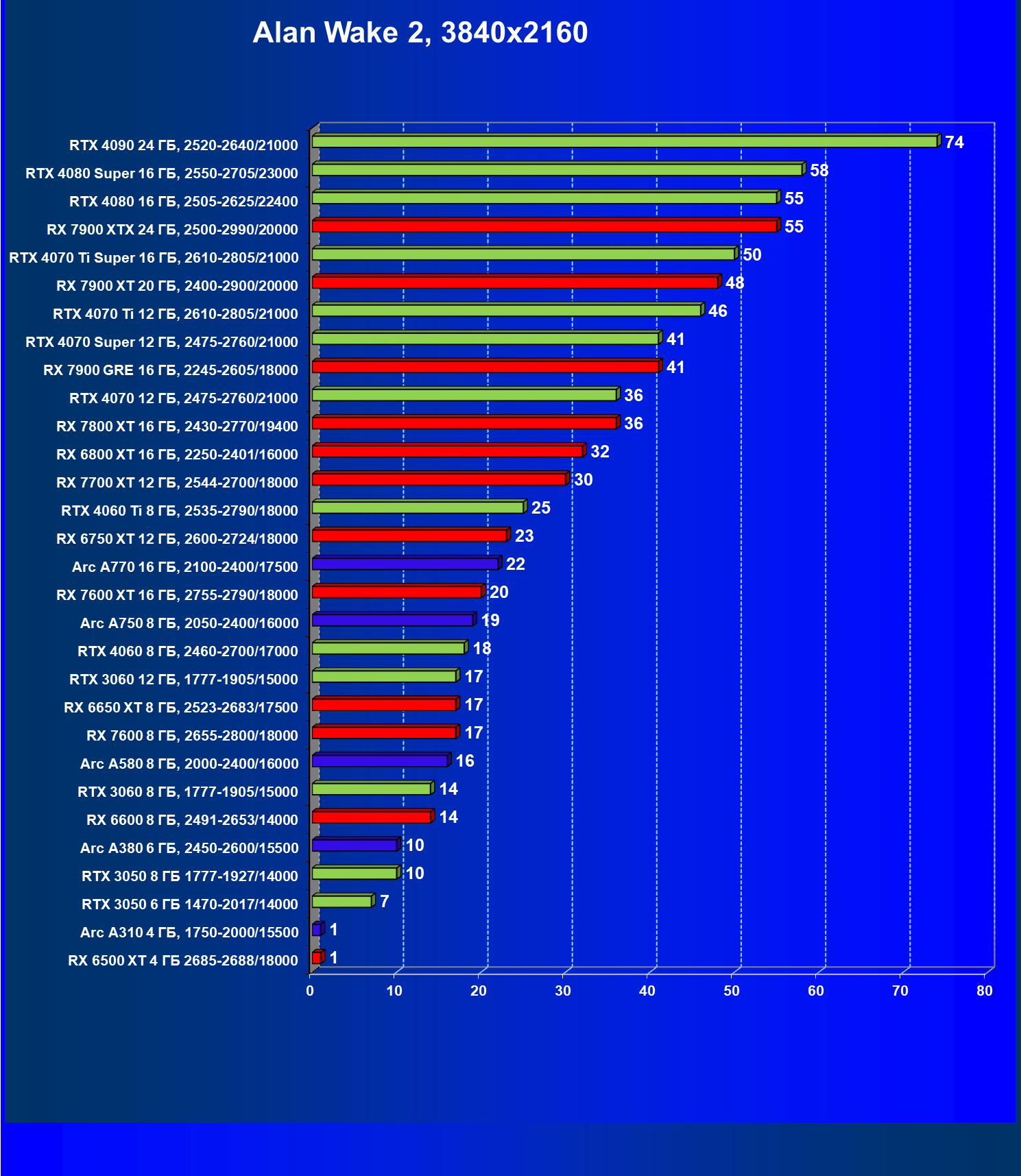 В разрешении Full HD отлично себя показывают Arc A750, Arc A580, GeForce RTX 3060 и Radeon RX 6600. GeForce RTX 3050 8 ГБ также обеспечивает приличный комфорт (но иногда придется снижать настройки графики). В ряде случаев в очень сложных по графике играх придется подбирать ускорители на уровень выше (либо понижать настройки графики).