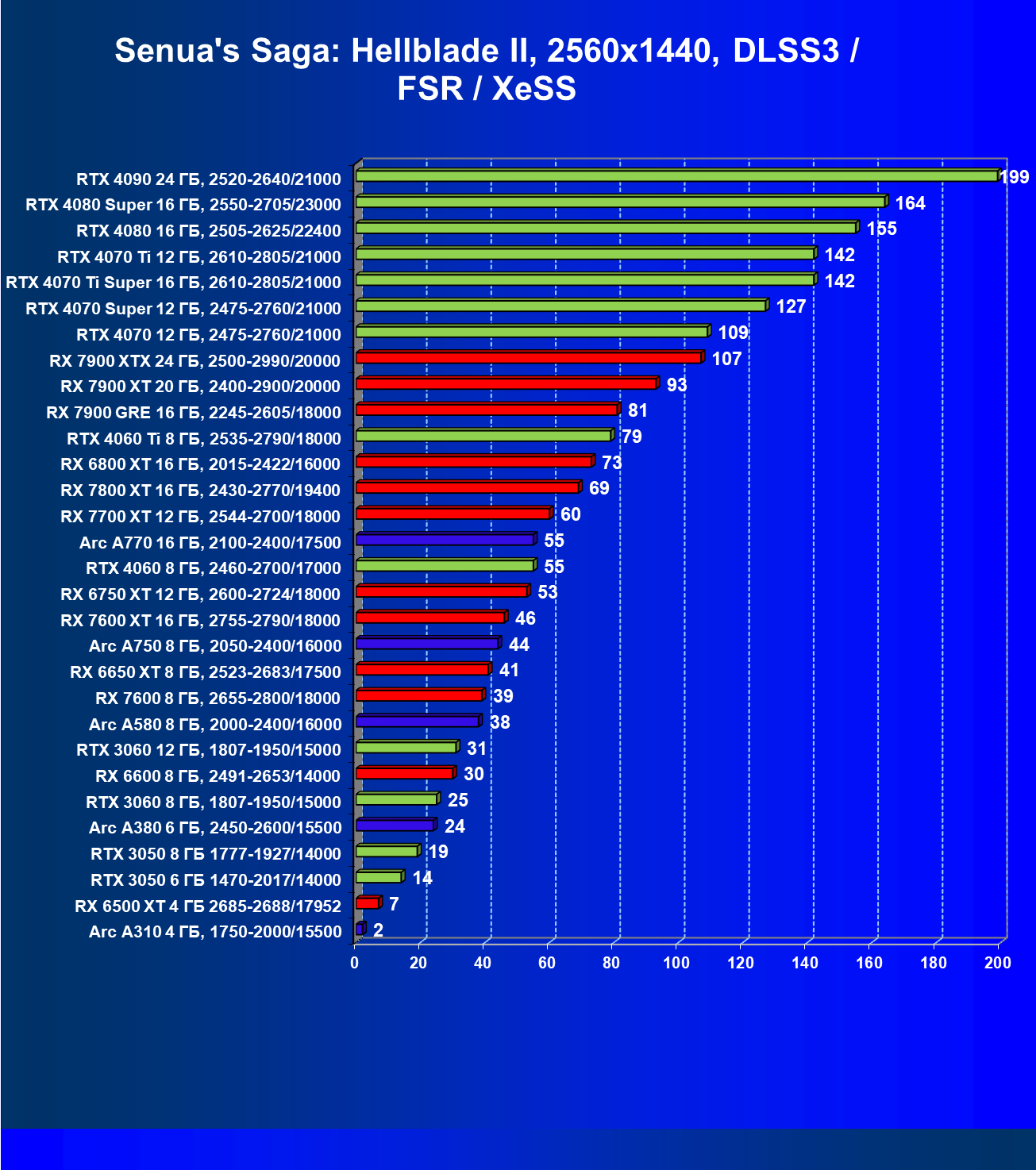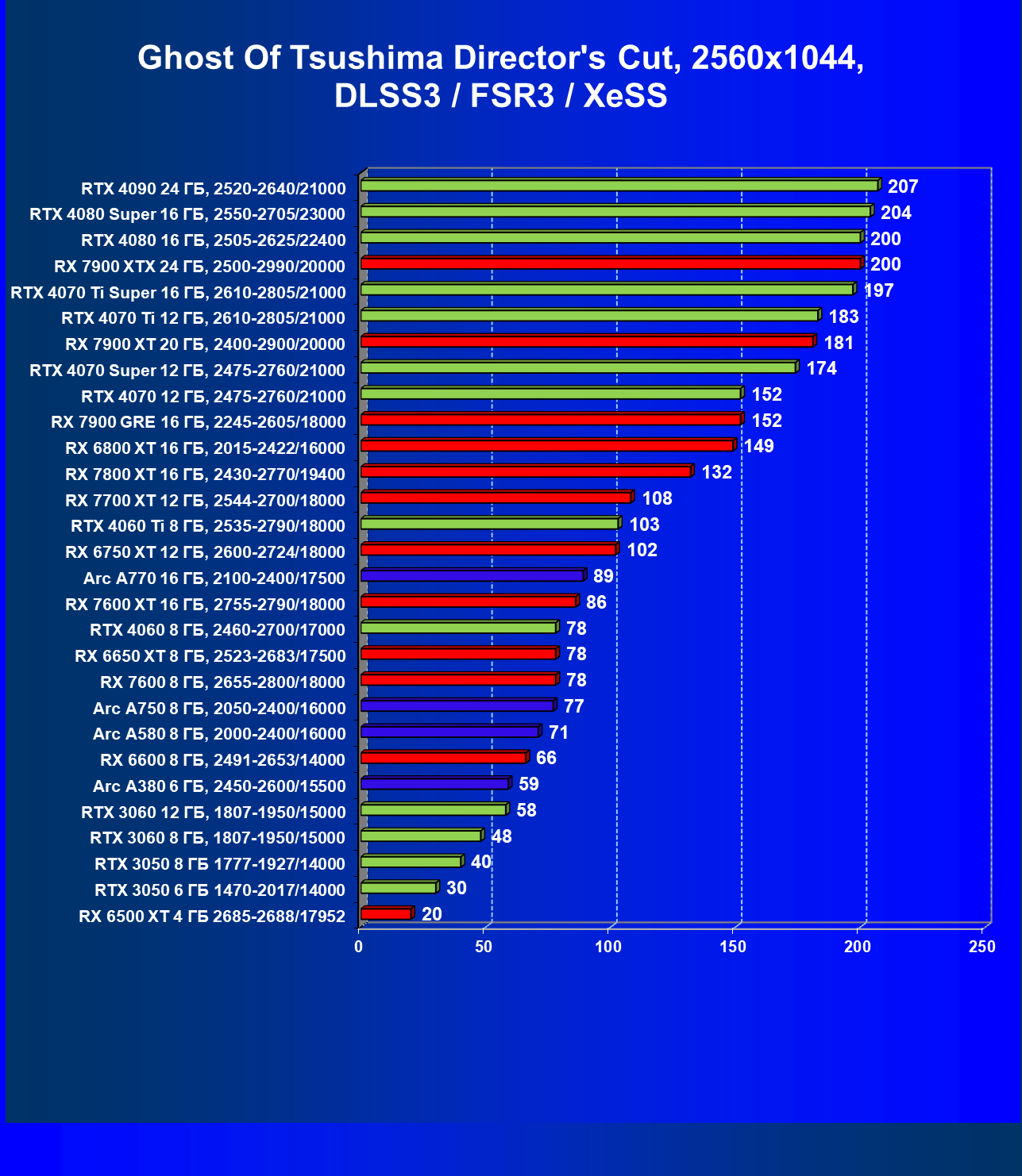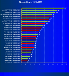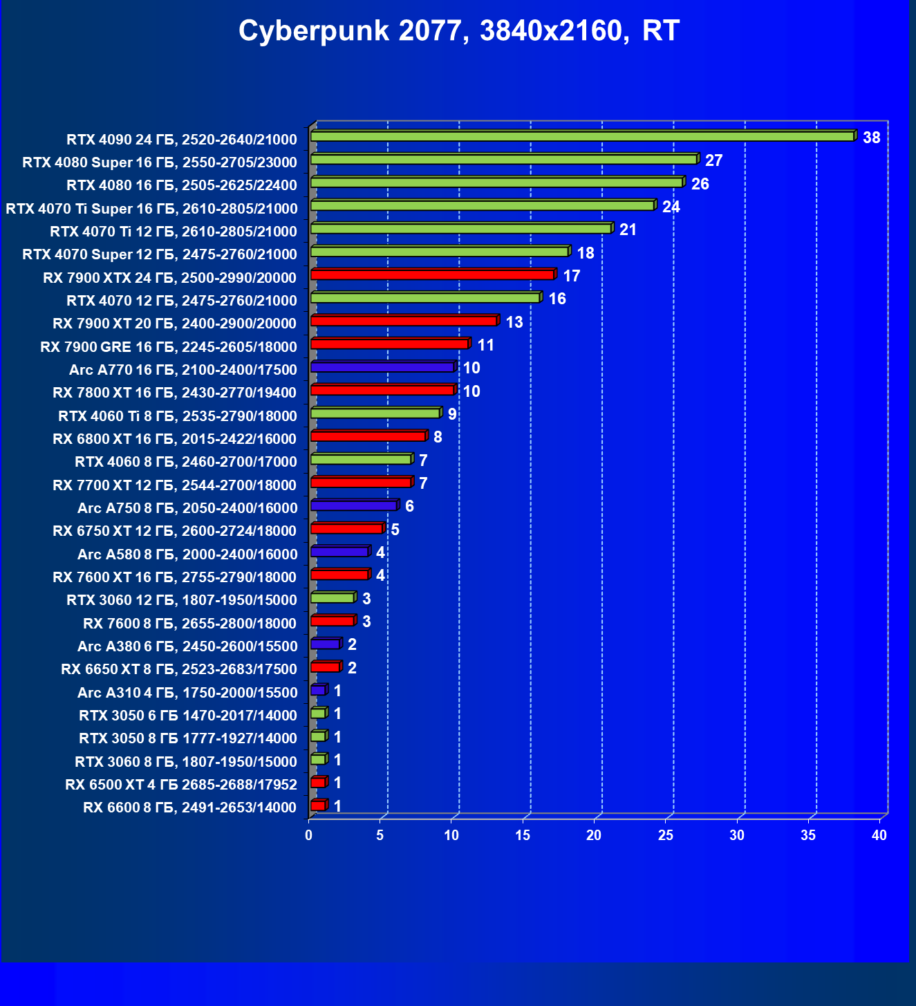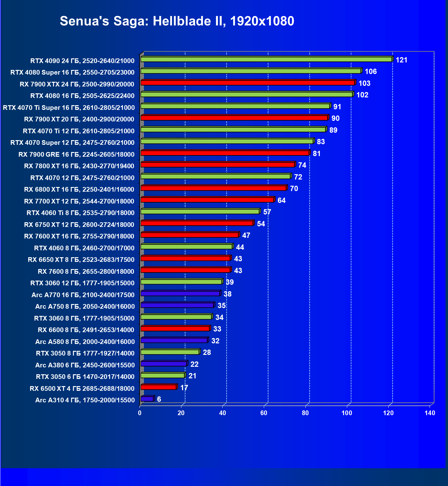 В разрешении Full HD отлично себя показывают Arc A750, Arc A580, GeForce RTX 3060 и Radeon RX 6600. GeForce RTX 3050 8 ГБ также обеспечивает приличный комфорт (но иногда придется снижать настройки графики). В ряде случаев в очень сложных по графике играх придется подбирать ускорители на уровень выше (либо понижать настройки графики).