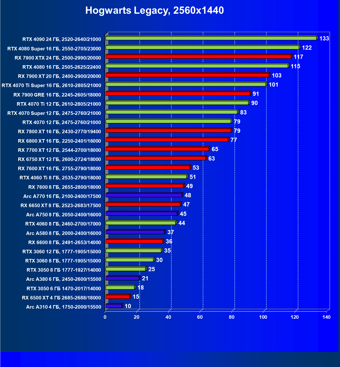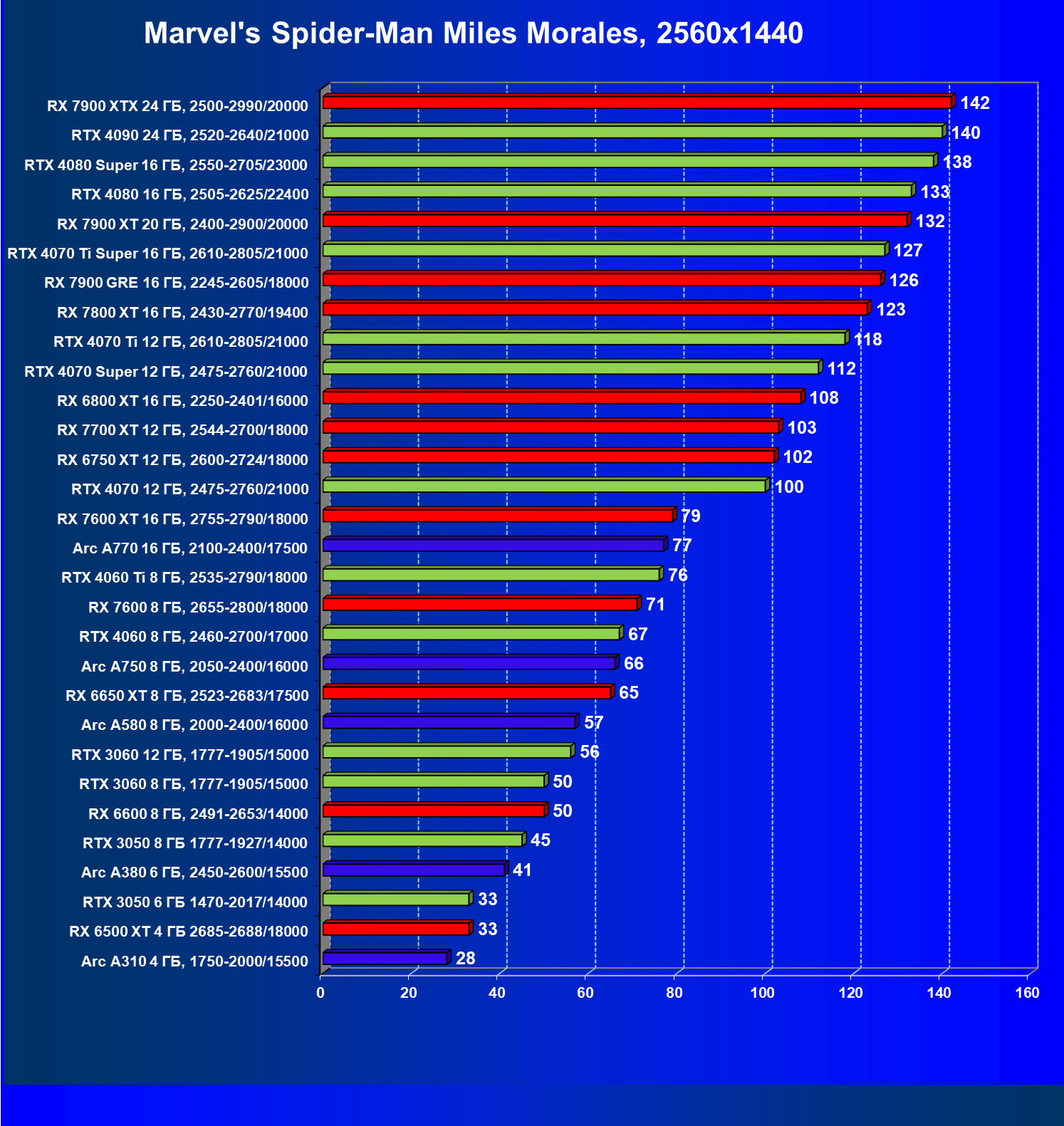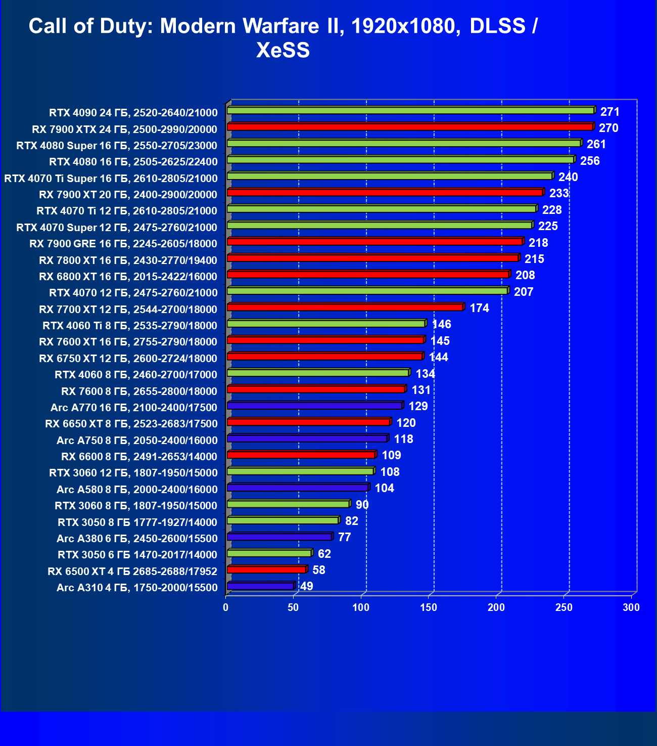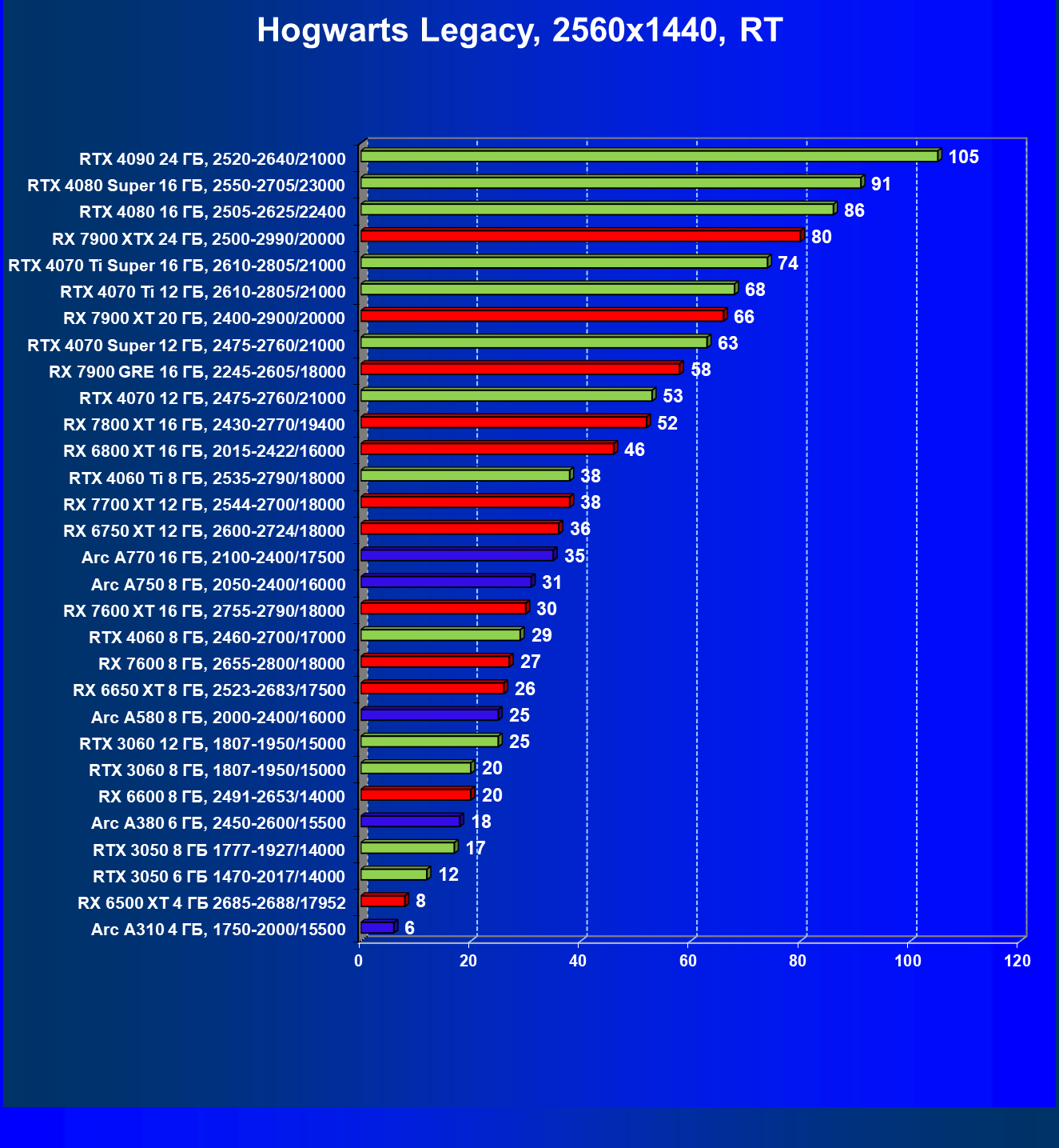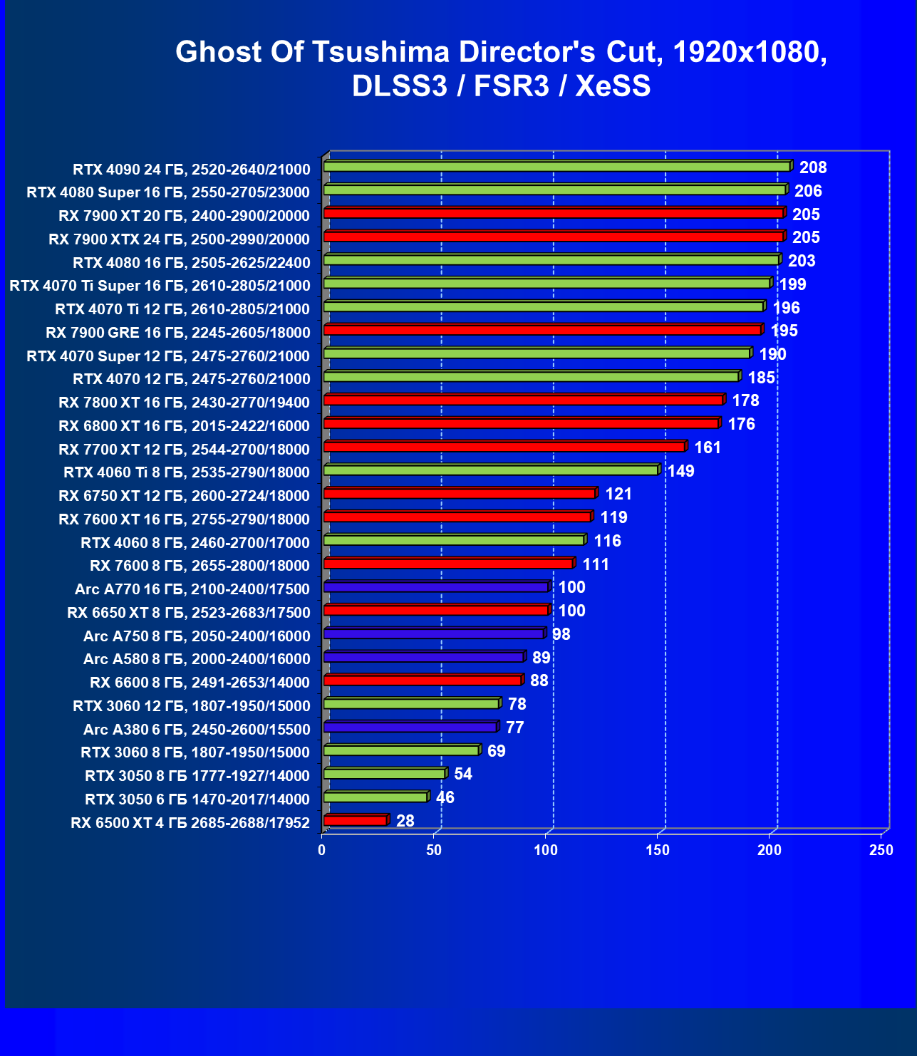 В разрешении Full HD отлично себя показывают Arc A750, Arc A580, GeForce RTX 3060 и Radeon RX 6600. GeForce RTX 3050 8 ГБ также обеспечивает приличный комфорт (но иногда придется снижать настройки графики). В ряде случаев в очень сложных по графике играх придется подбирать ускорители на уровень выше (либо понижать настройки графики).