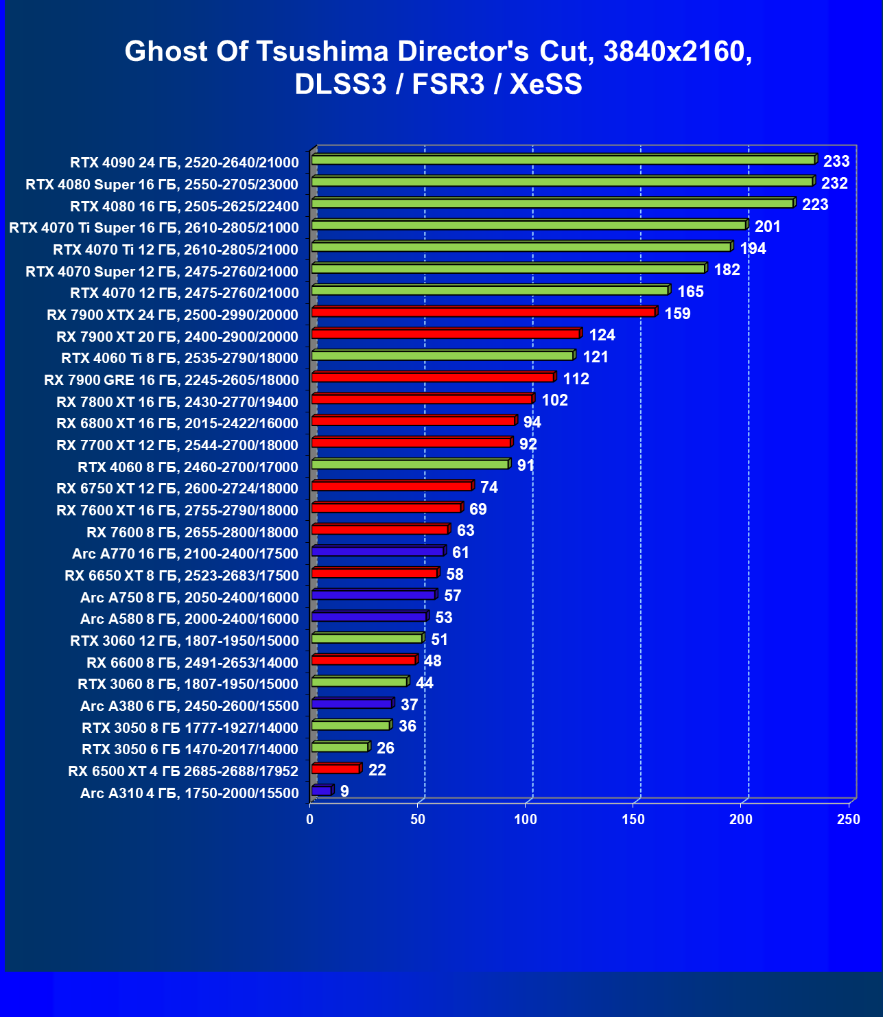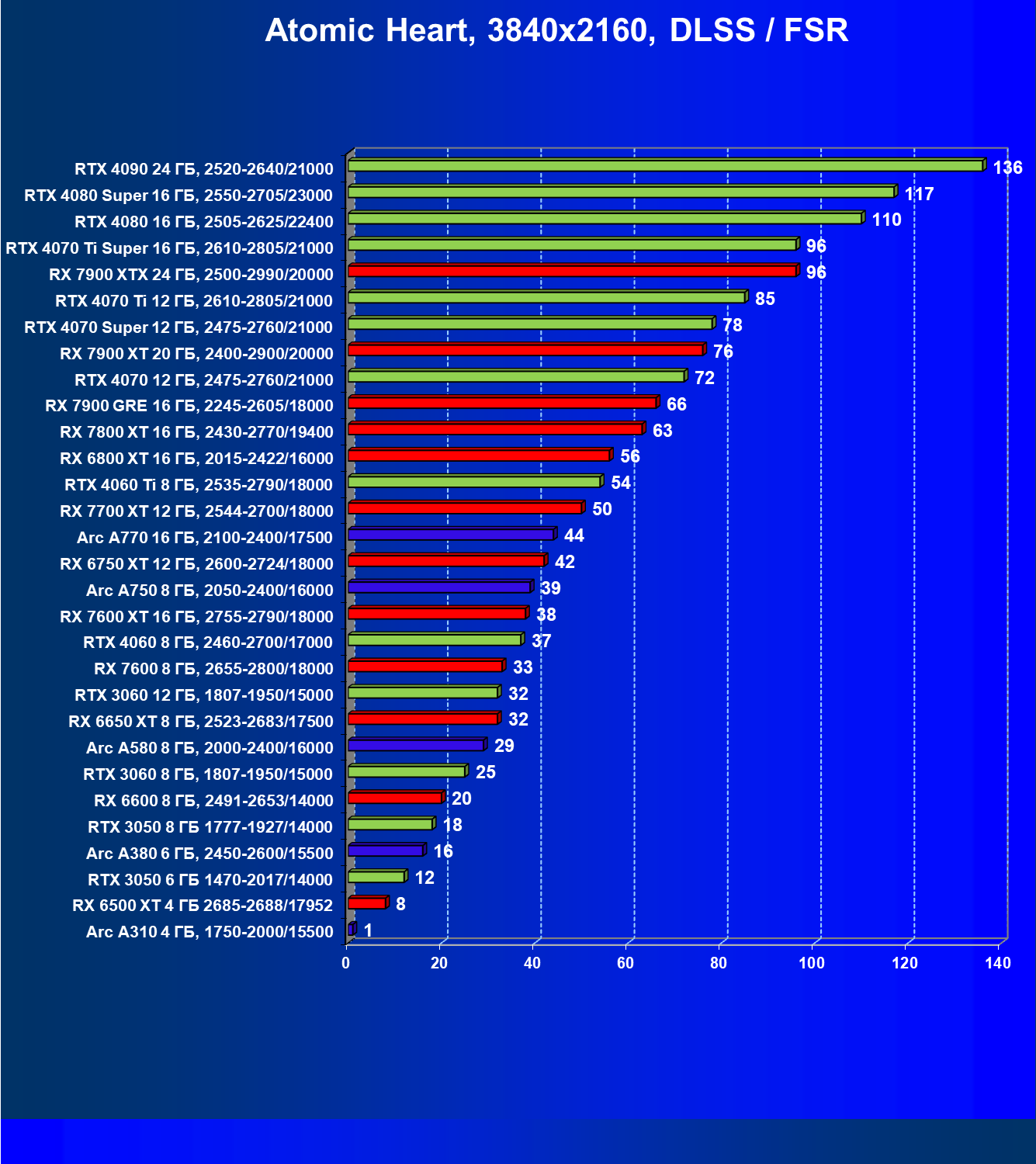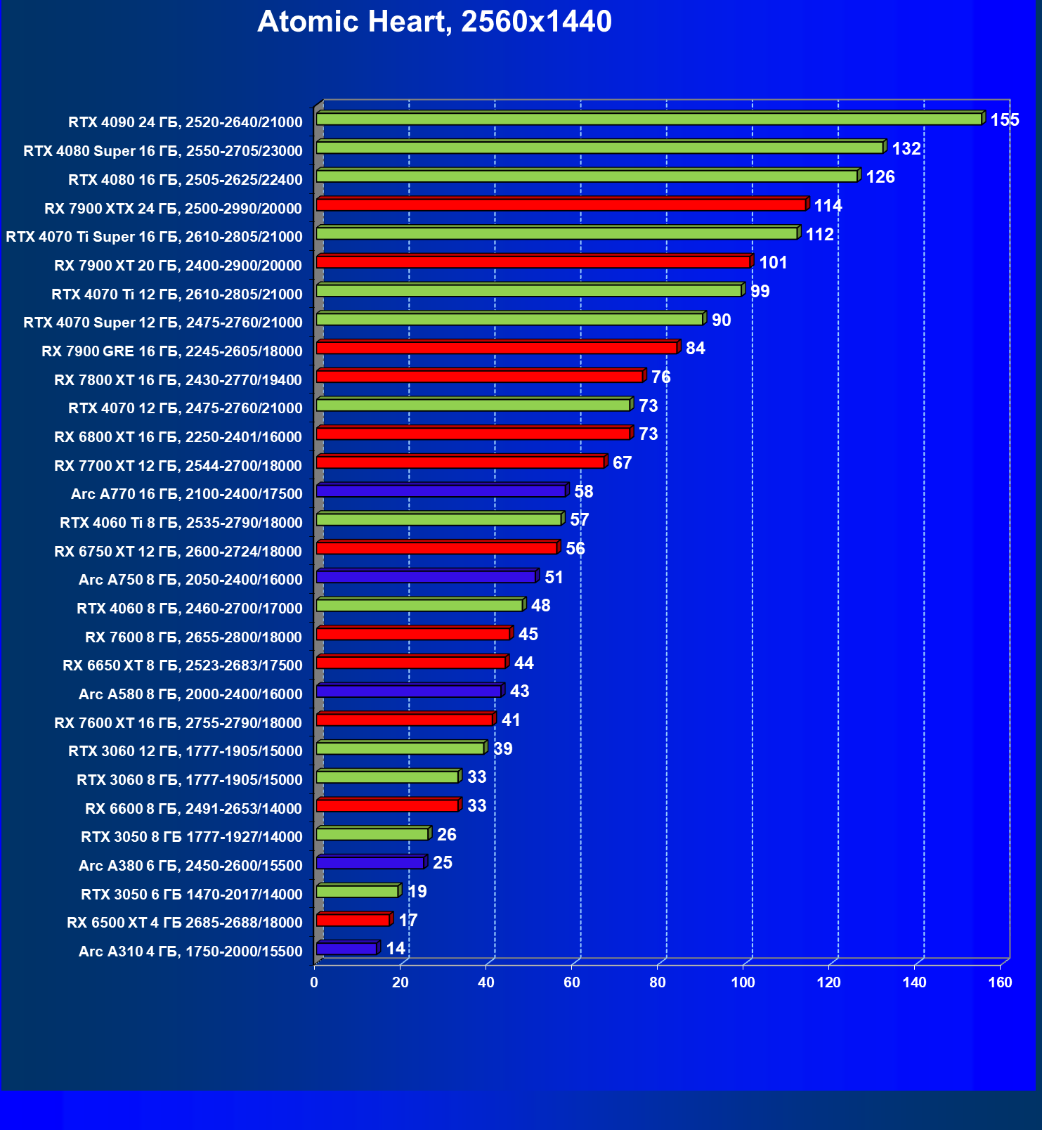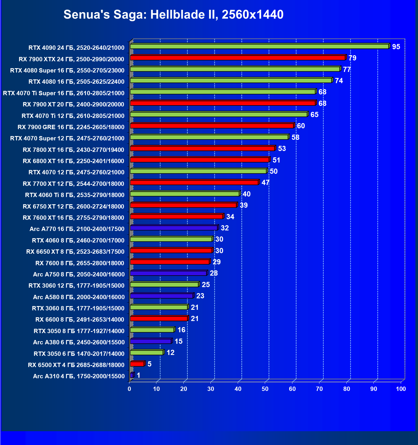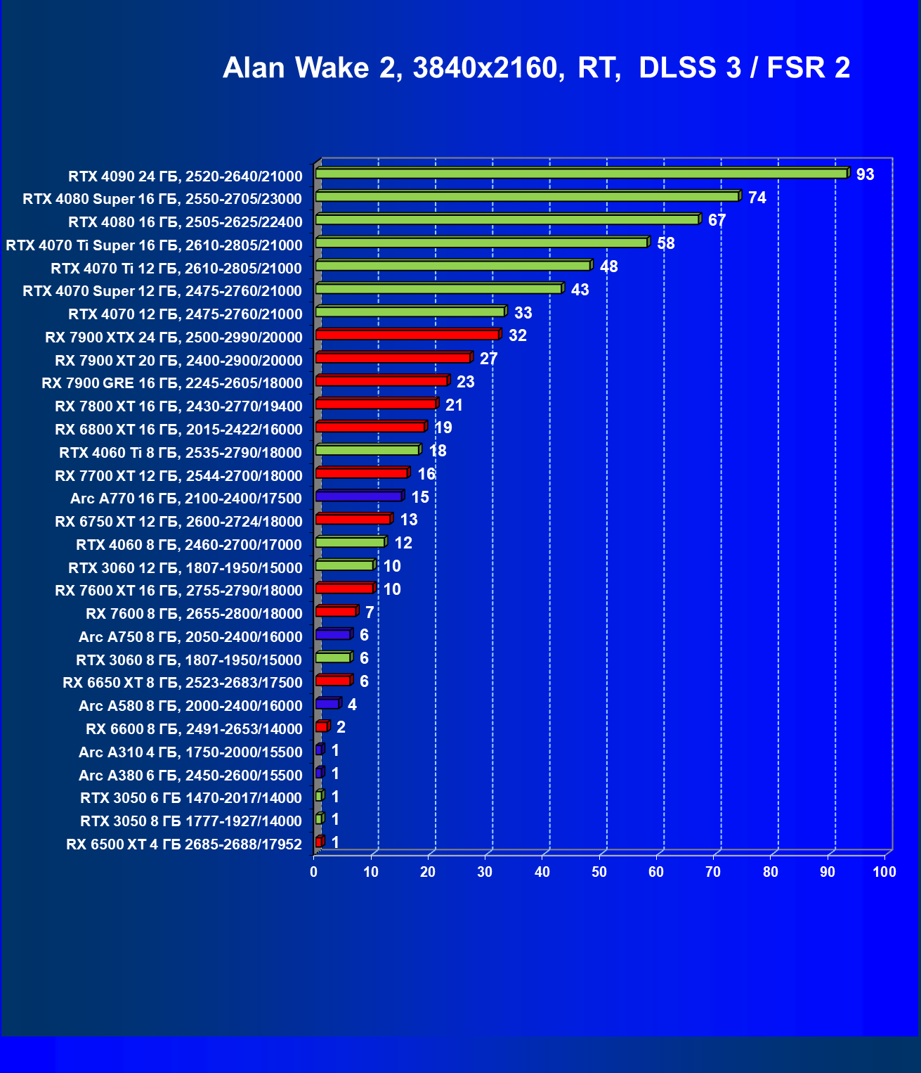 В разрешении Full HD отлично себя показывают Arc A750, Arc A580, GeForce RTX 3060 и Radeon RX 6600. GeForce RTX 3050 8 ГБ также обеспечивает приличный комфорт (но иногда придется снижать настройки графики). В ряде случаев в очень сложных по графике играх придется подбирать ускорители на уровень выше (либо понижать настройки графики).