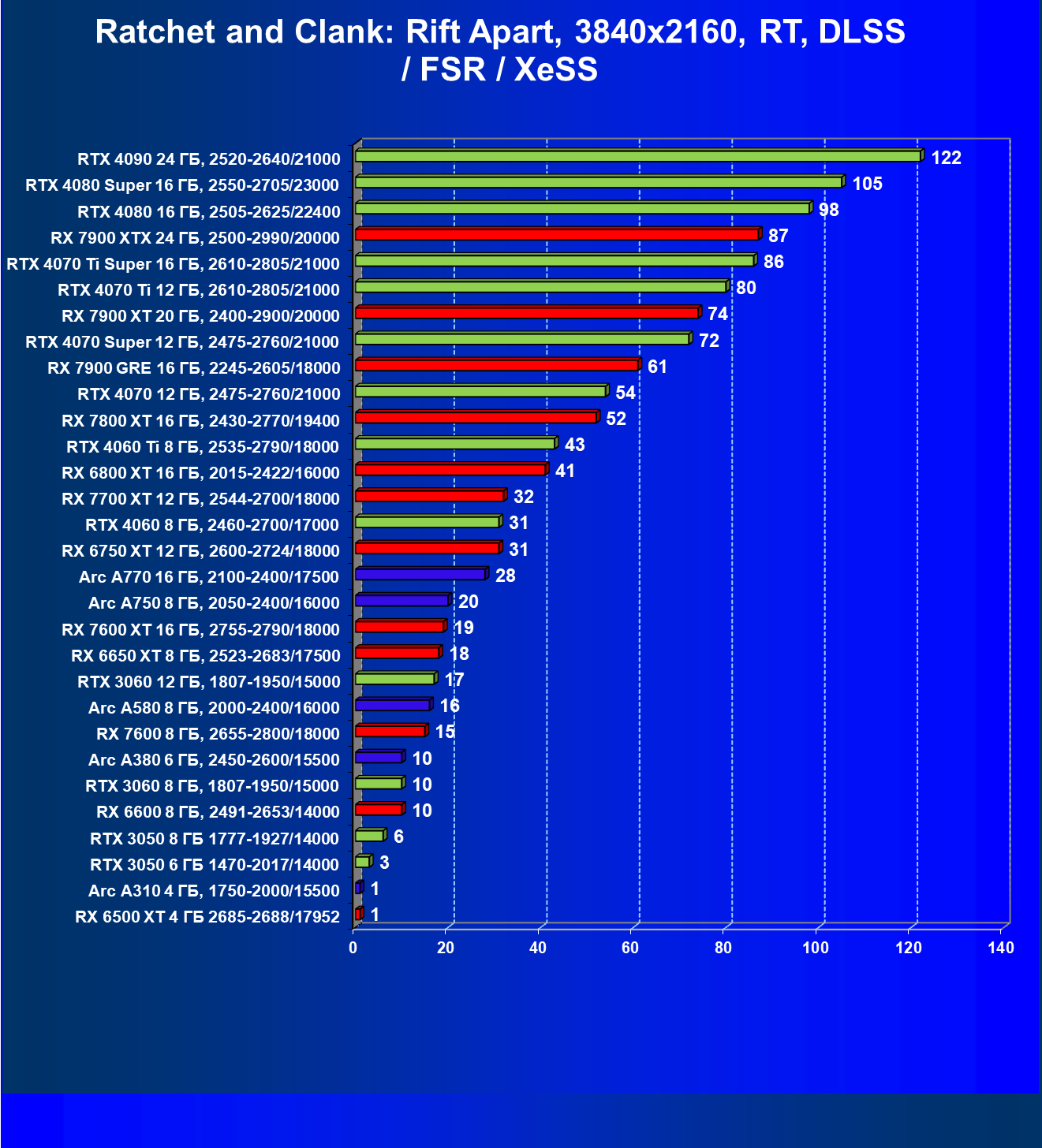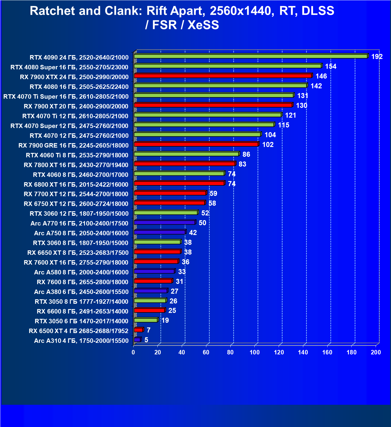 В играх без RT первое место занял ускоритель на базе Intel Arc A580 (8 ГБ), а Intel Arc A750 (8 ГБ) занимает первое место в нашем рейтинге полезности и в играх с RT (при задействовании технологий динамического масштабирования). С учетом перспективности мы выбрали семейство Intel Arc A750. Карты на базе Arc A750 позволяют играть с полным комфортом при максимальном качестве графики без RT в разрешении Full HD, а иногда даже в разрешении 2.5K (но редко). При использовании трассировки лучей в Full HD с максимальным качеством графики обязательно потребуется включить FSR или собственную технологию масштабирования изображения Intel — XeSS.