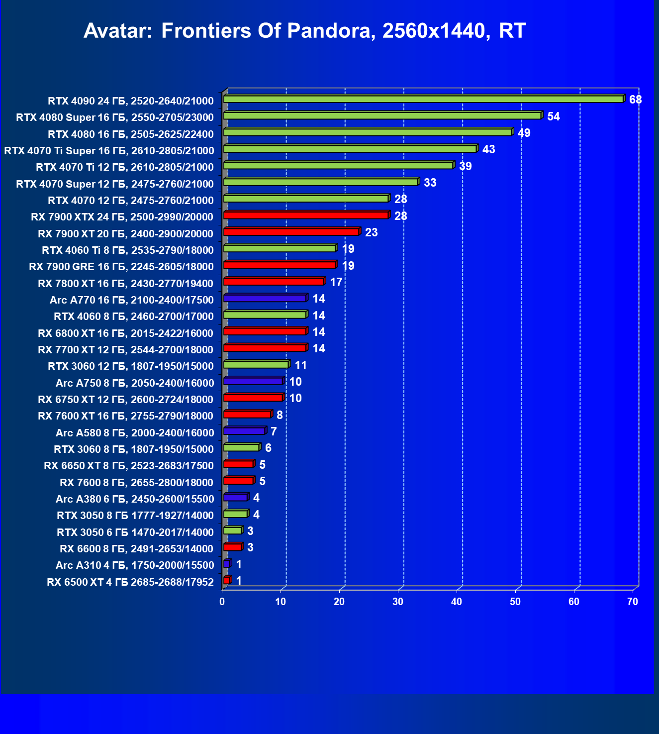 Карты уровня Radeon RX 7600, Radeon RX 6650 XT, Radeon RX 6600, Arc A580, GeForce RTX 3060 8 ГБ, GeForce RTX 3050 8 ГБ могут обеспечить приемлемый комфорт в играх при использовании RT совместно с технологиями масштабирования. А вот Radeon RX 6500 XT, Arc A310 и GeForce RTX 3050 6 ГБ включение RT не вытягивают, у них поддержка трассировки лучей лишь номинальная.