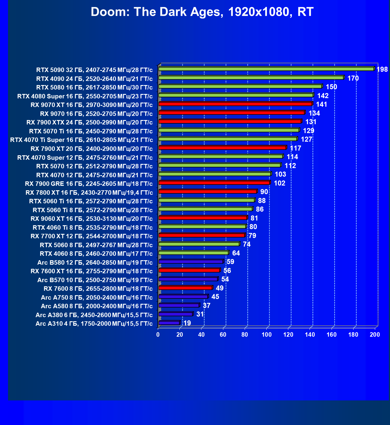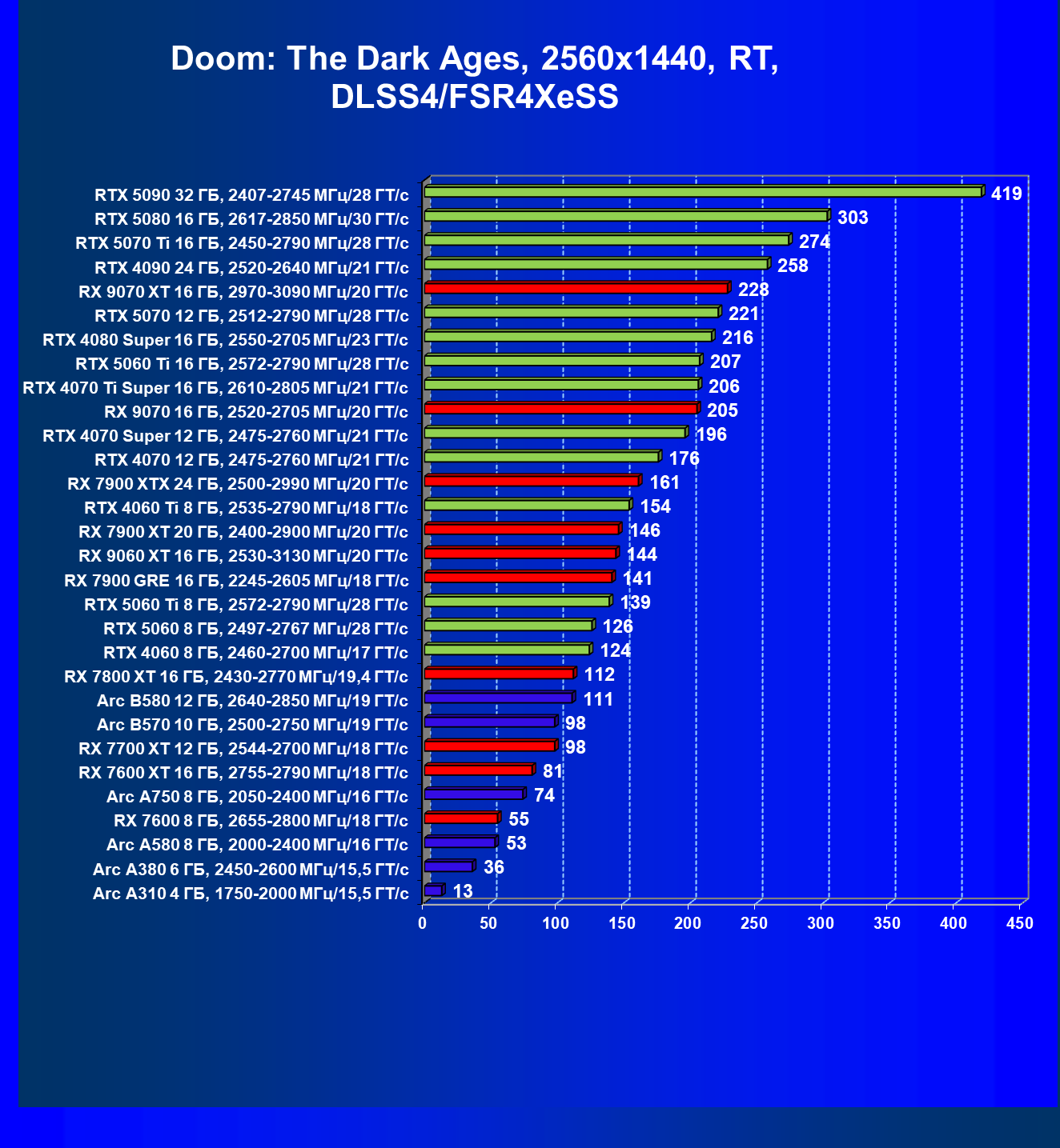 В наборе тестовых игр произошли изменения: добавились результаты из игры Doom: The Dark Ages (тестирование без трассировки лучей невозможно, поэтому только с RT и DLSS/FSR/XeSS).