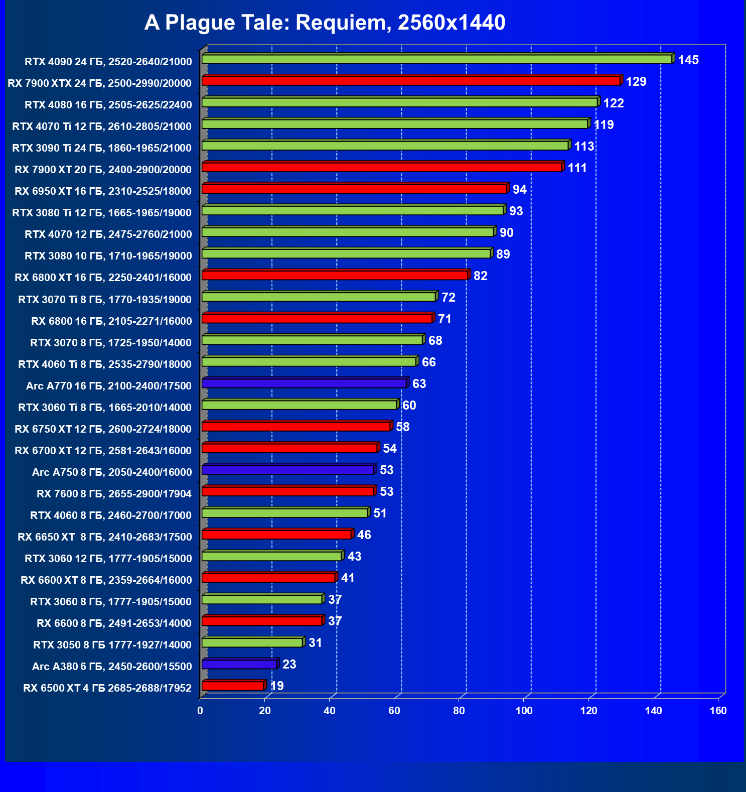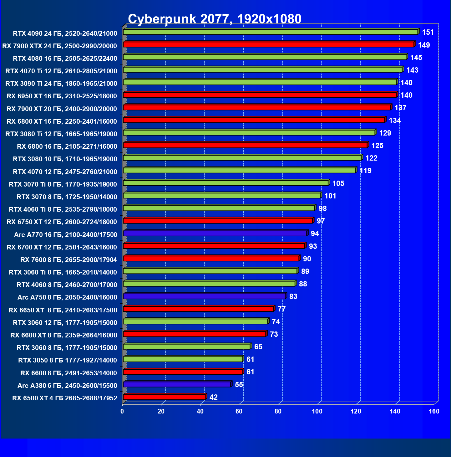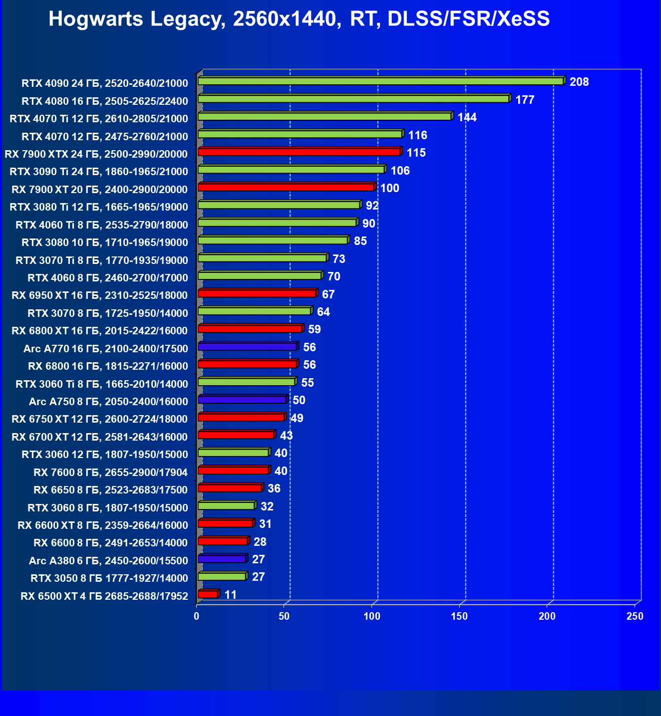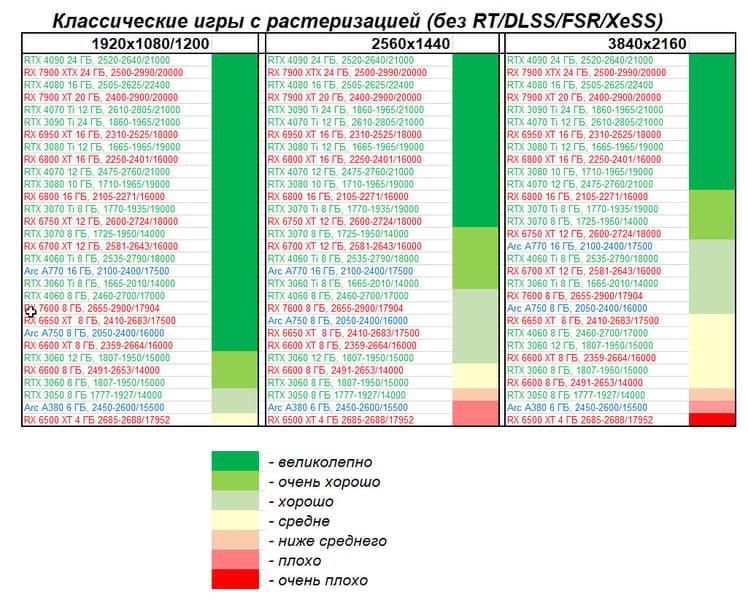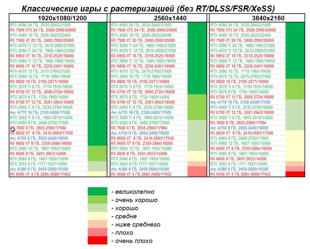 Перечисленные выше видеокарты логично справятся с более низким разрешением даже при включении трассировки лучей и уже не потребуют включения DLSS/FSR/XeSS. Для игр без RT, но с максимальным качеством графики в современных играх в таком разрешении хорошо подойдут GeForce RTX 3070, GeForce RTX 4060 Ti, GeForce RTX 3060 Ti, GeForce RTX 4060, Radeon RX 6750 XT, Radeon RX 6700 XT, Radeon RX 6650 XT, Radeon RX 7600 и Intel Arc A770.