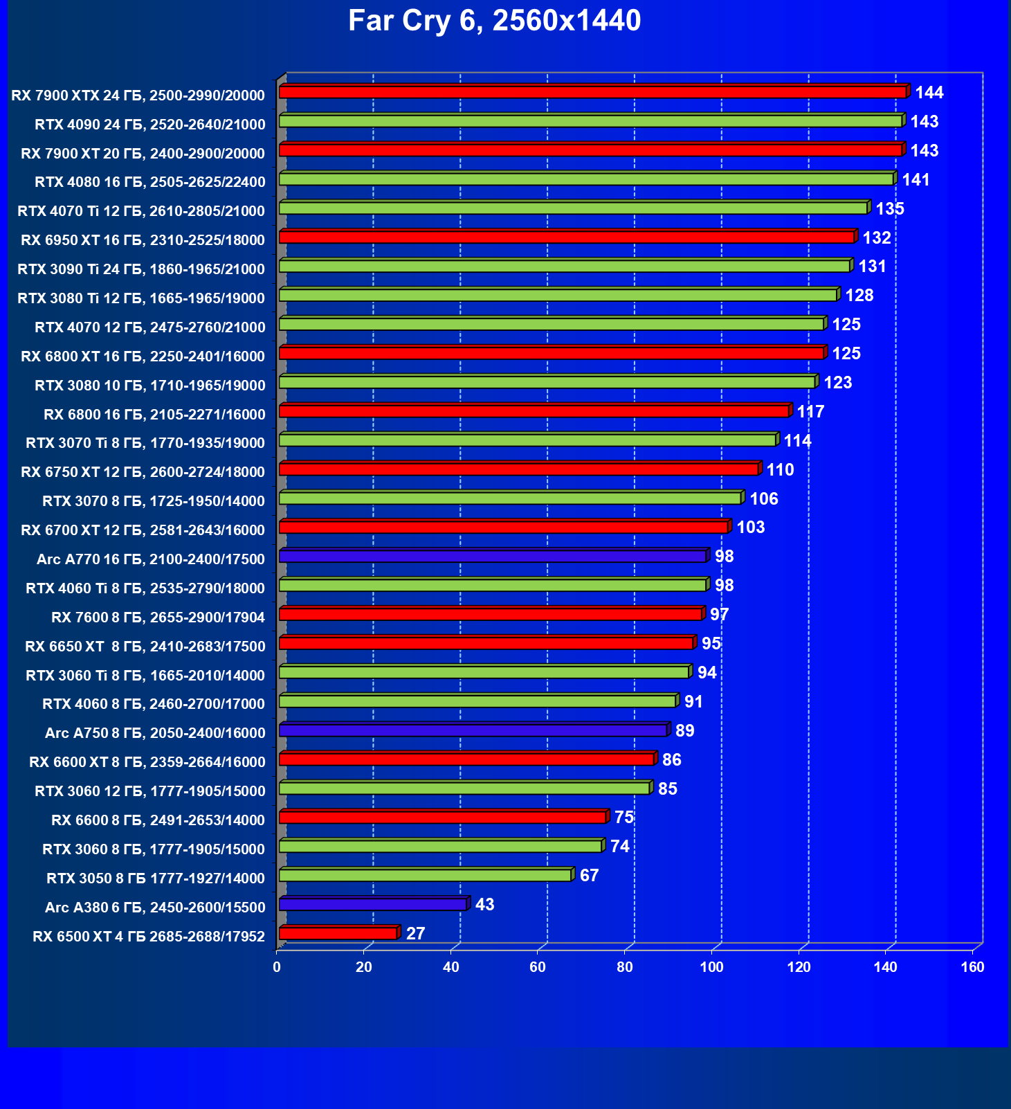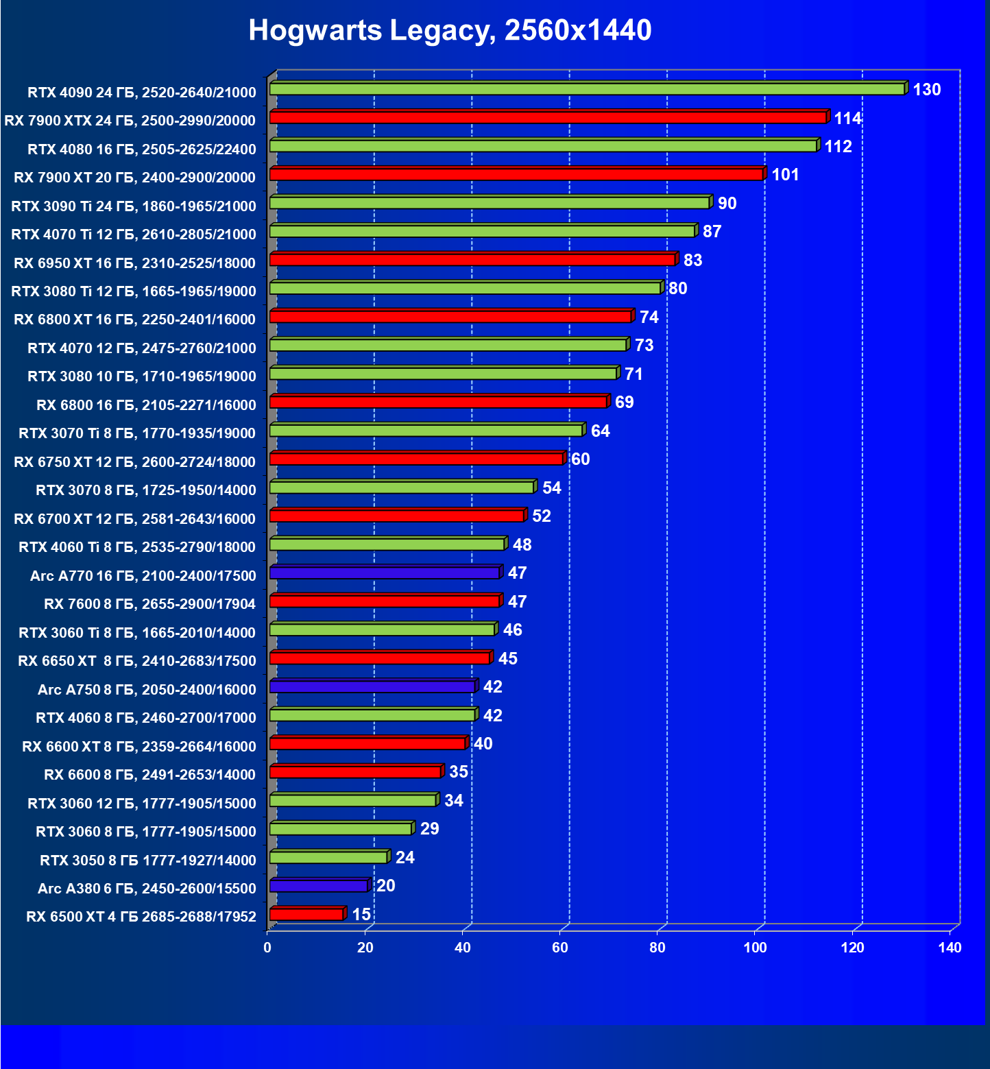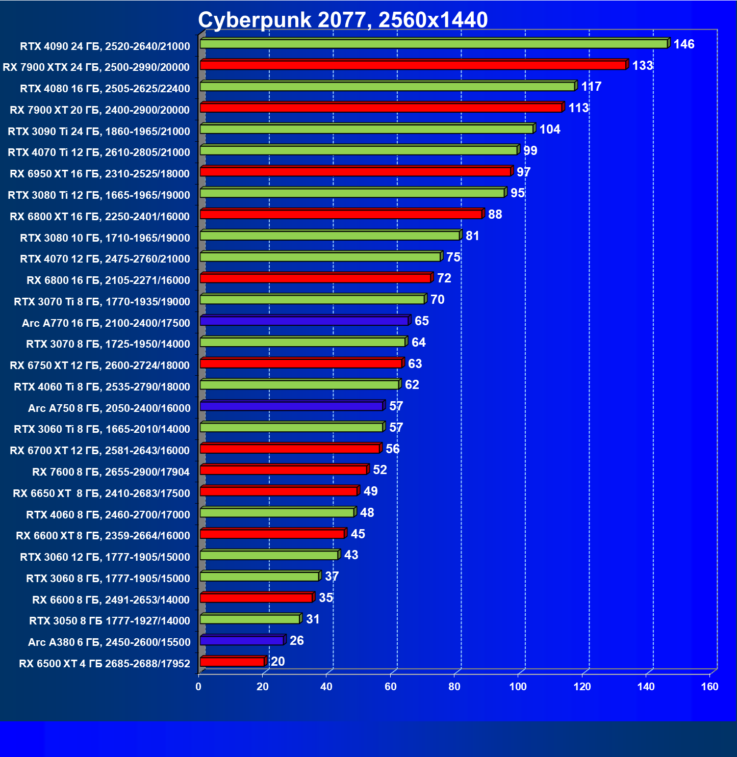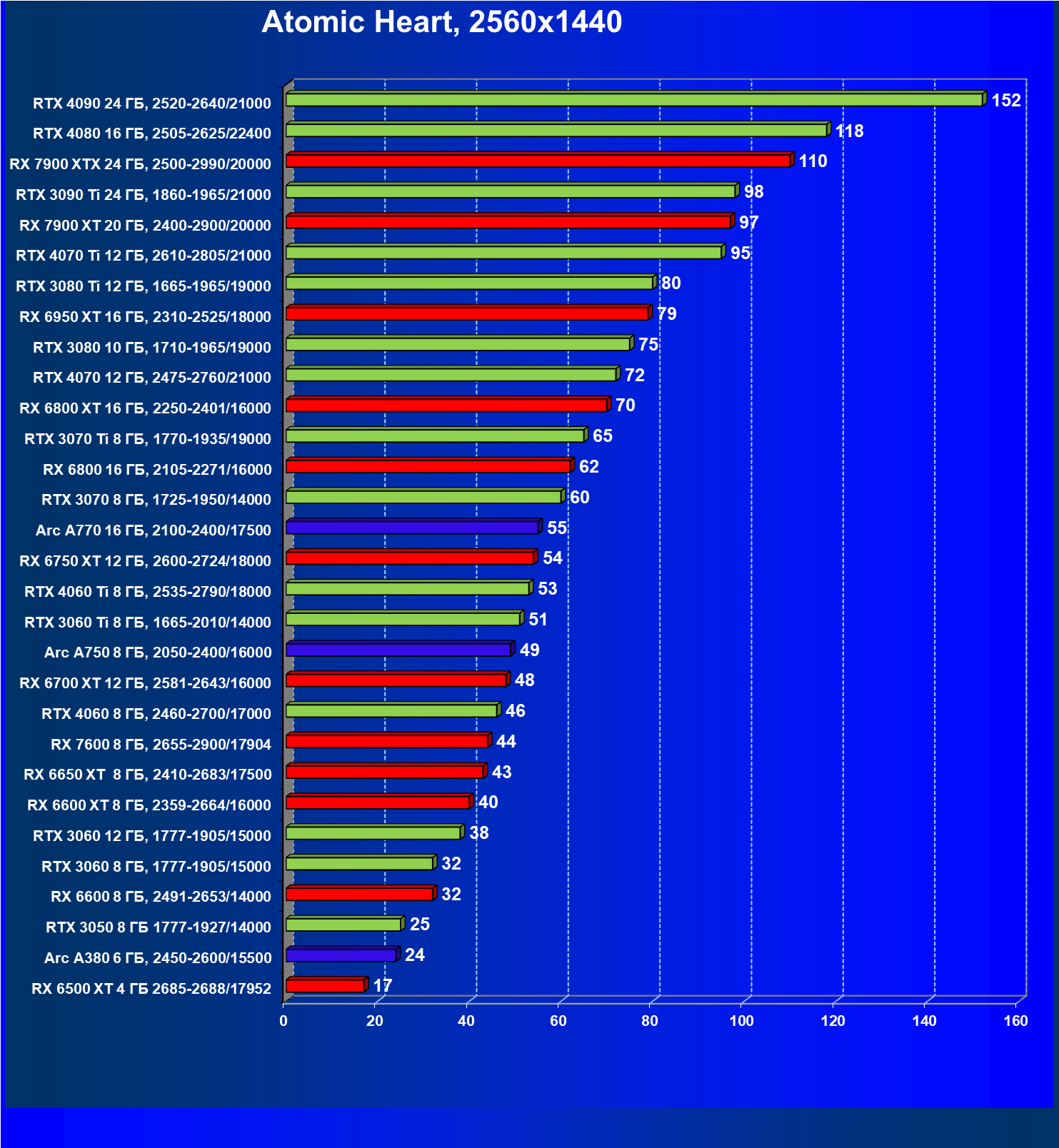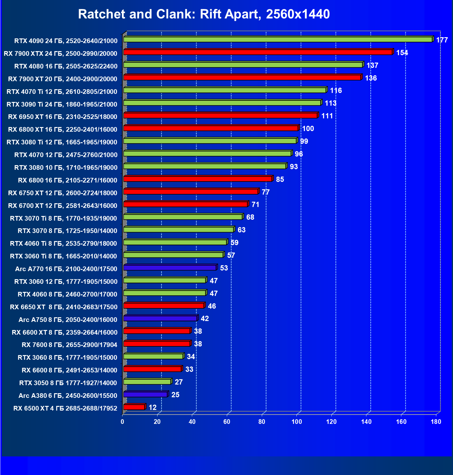 Перечисленные выше видеокарты логично справятся с более низким разрешением даже при включении трассировки лучей и уже не потребуют включения DLSS/FSR/XeSS. Для игр без RT, но с максимальным качеством графики в современных играх в таком разрешении хорошо подойдут GeForce RTX 3070, GeForce RTX 4060 Ti, GeForce RTX 3060 Ti, GeForce RTX 4060, Radeon RX 6750 XT, Radeon RX 6700 XT, Radeon RX 6650 XT, Radeon RX 7600 и Intel Arc A770.