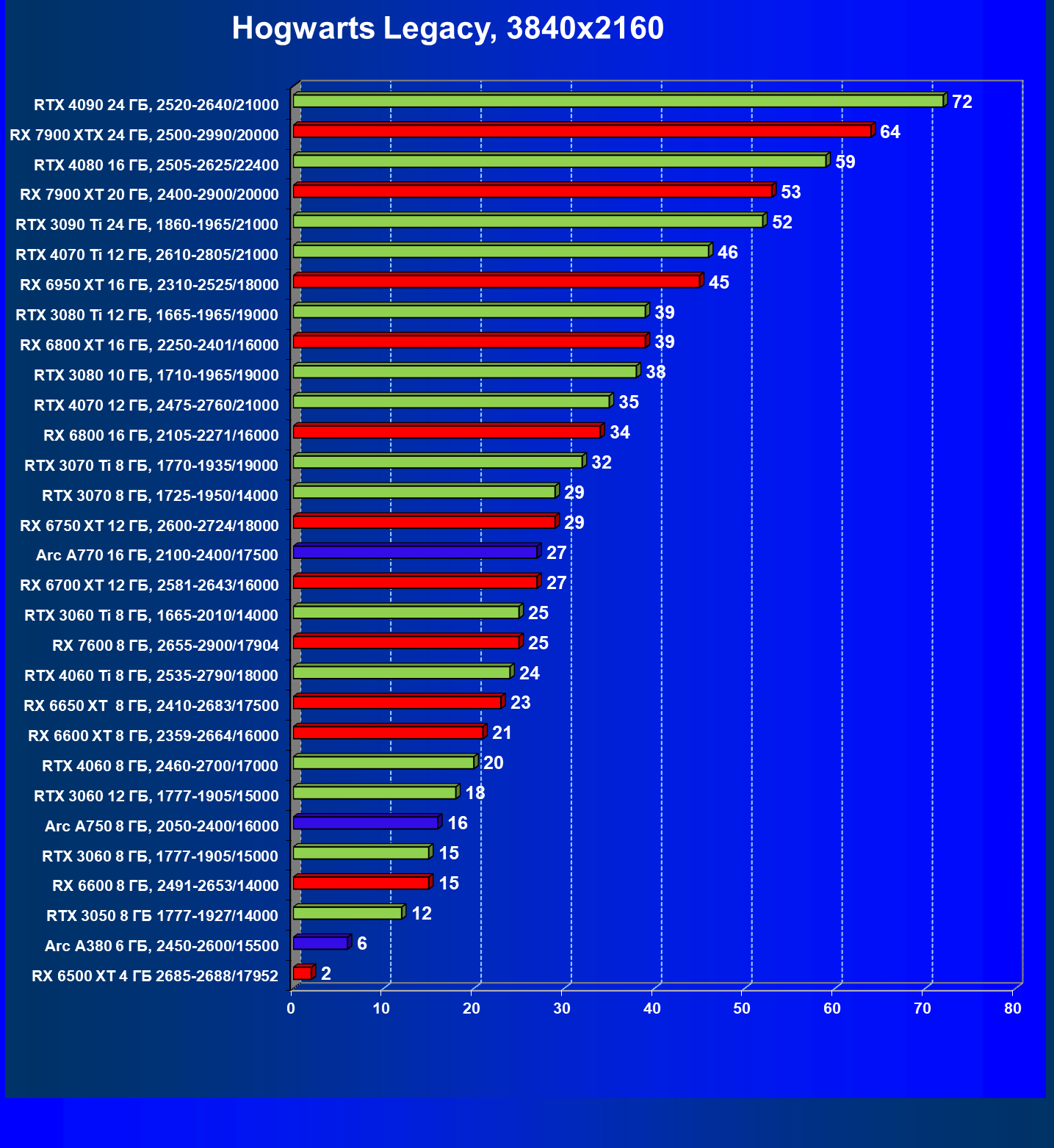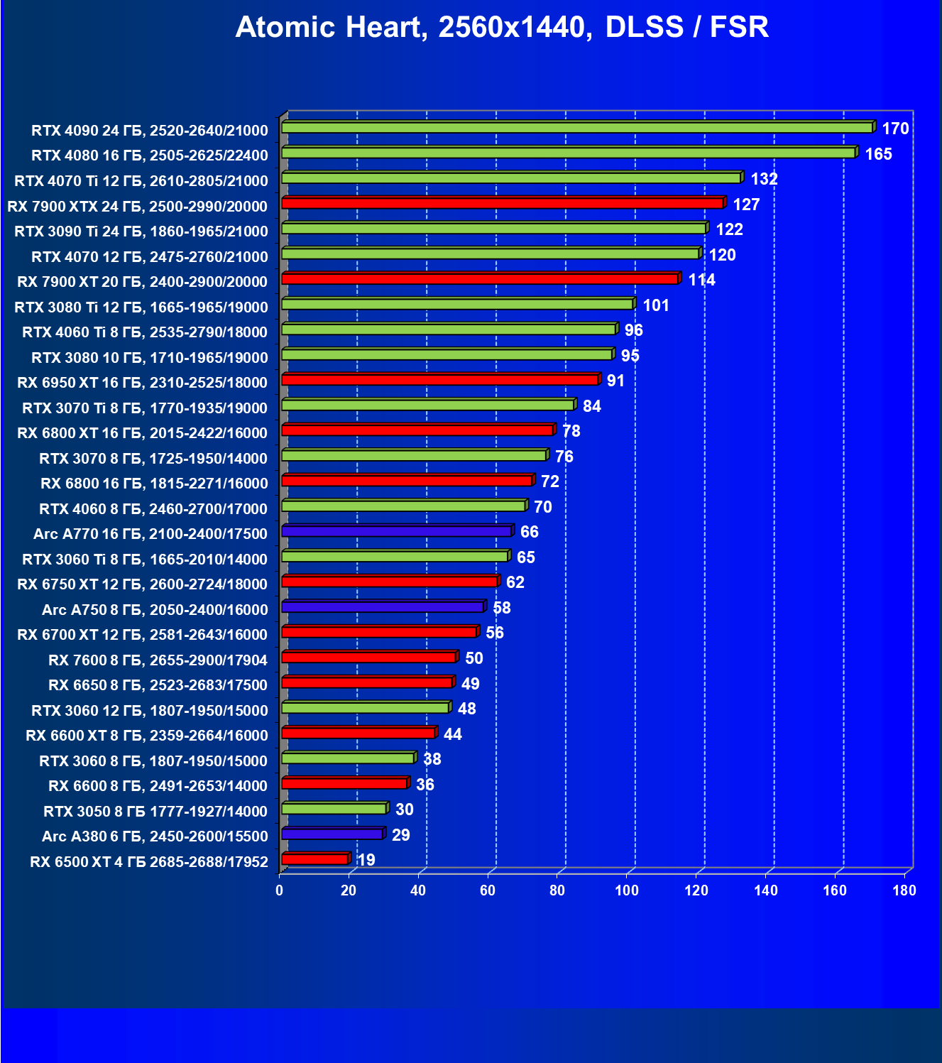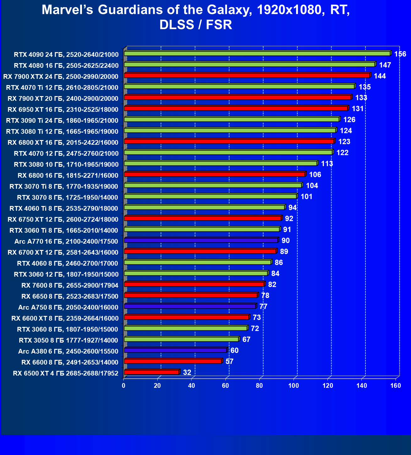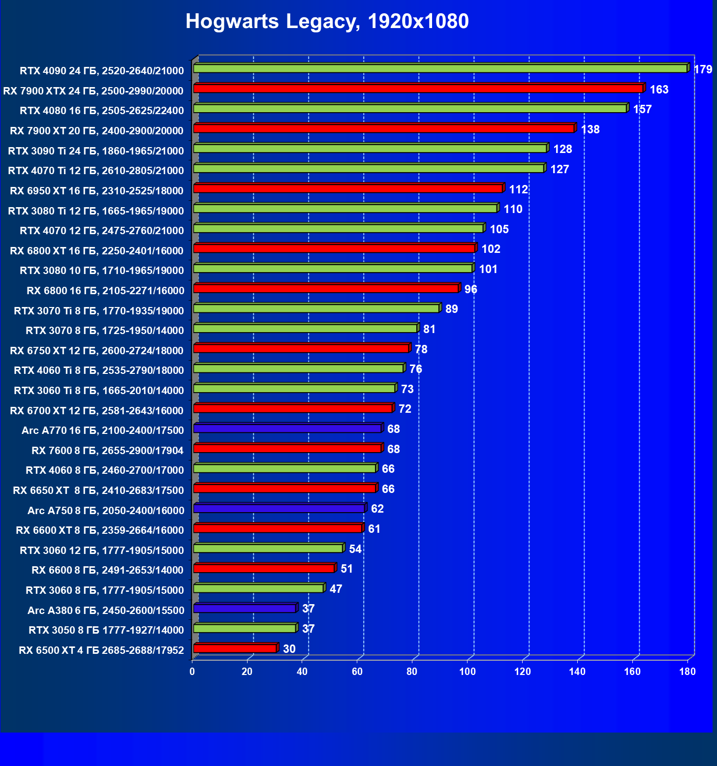 Перечисленные выше видеокарты логично справятся с более низким разрешением даже при включении трассировки лучей и уже не потребуют включения DLSS/FSR/XeSS. Для игр без RT, но с максимальным качеством графики в современных играх в таком разрешении хорошо подойдут GeForce RTX 3070, GeForce RTX 4060 Ti, GeForce RTX 3060 Ti, GeForce RTX 4060, Radeon RX 6750 XT, Radeon RX 6700 XT, Radeon RX 6650 XT, Radeon RX 7600 и Intel Arc A770.