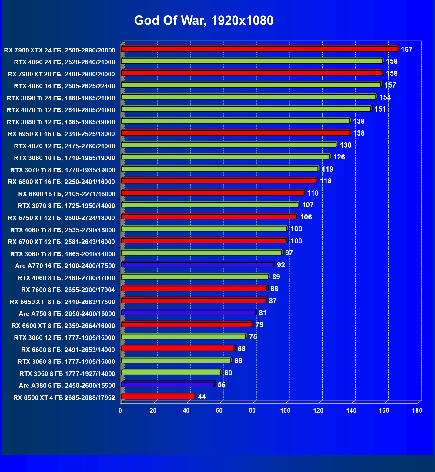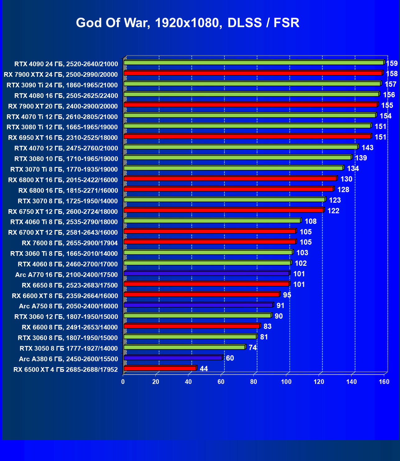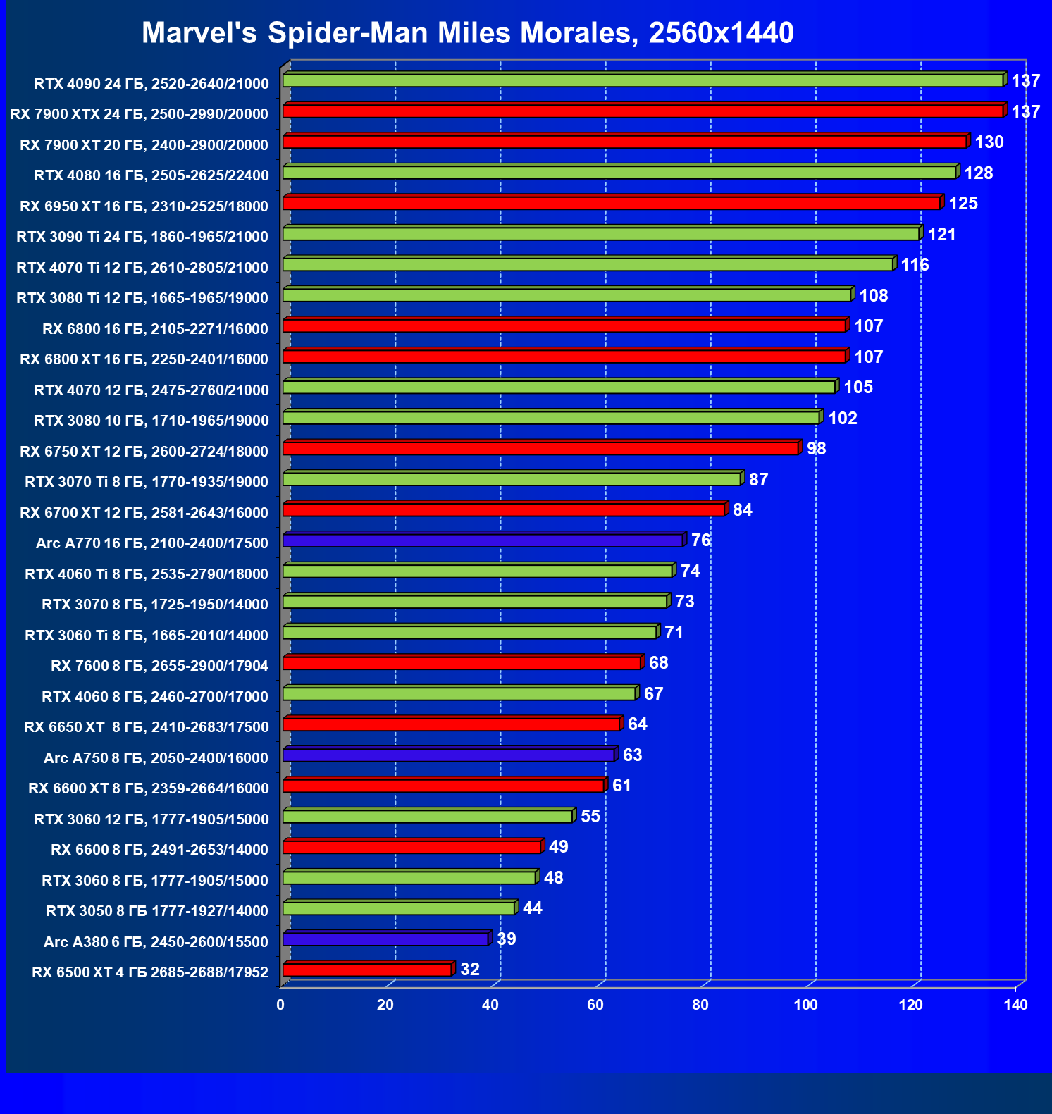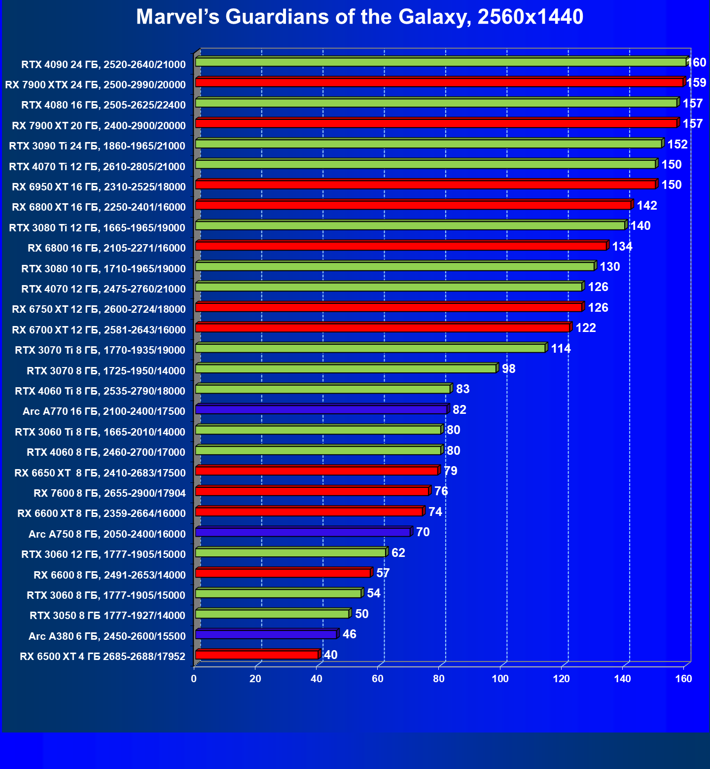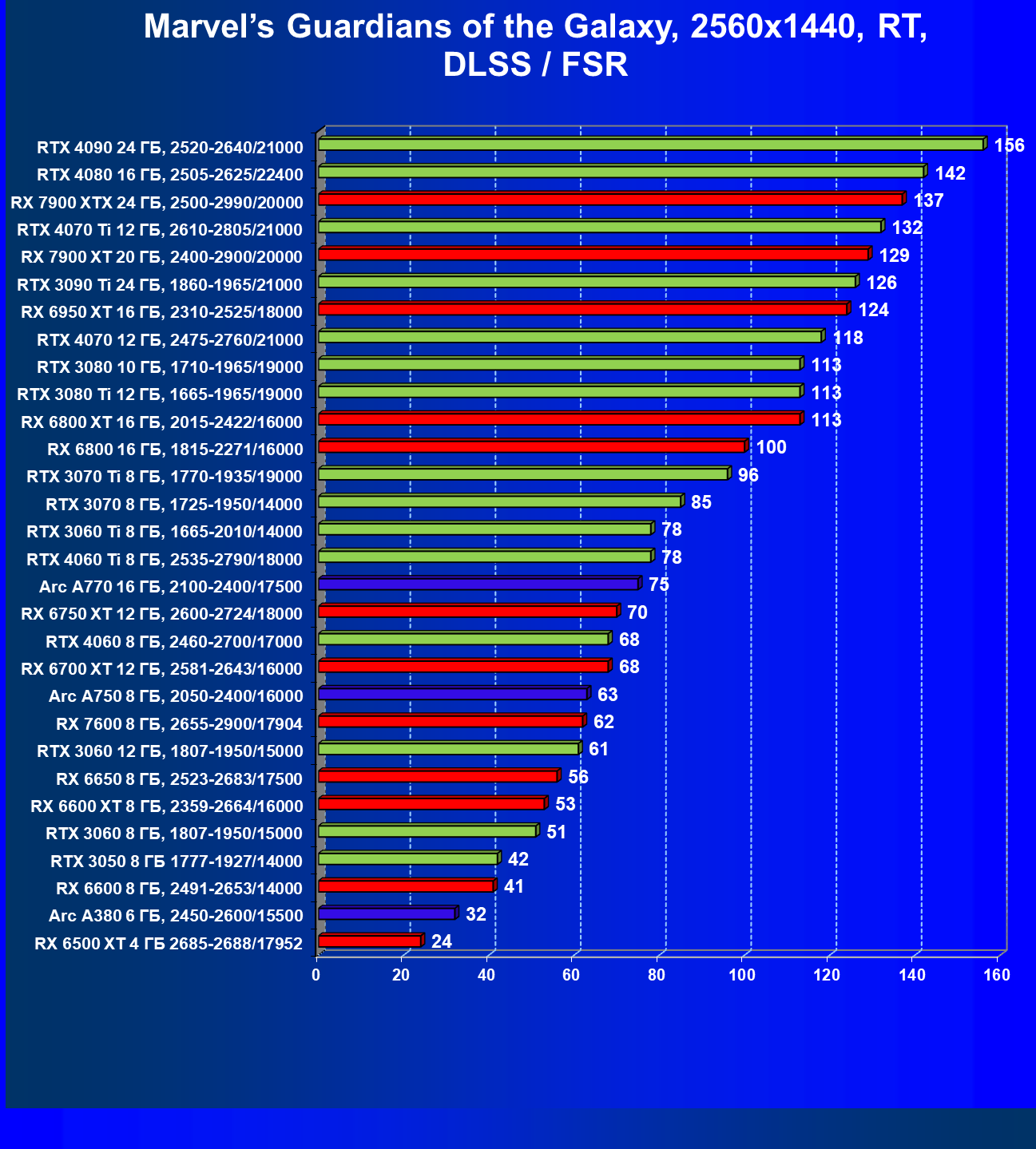 Перечисленные выше видеокарты логично справятся с более низким разрешением даже при включении трассировки лучей и уже не потребуют включения DLSS/FSR/XeSS. Для игр без RT, но с максимальным качеством графики в современных играх в таком разрешении хорошо подойдут GeForce RTX 3070, GeForce RTX 4060 Ti, GeForce RTX 3060 Ti, GeForce RTX 4060, Radeon RX 6750 XT, Radeon RX 6700 XT, Radeon RX 6650 XT, Radeon RX 7600 и Intel Arc A770.