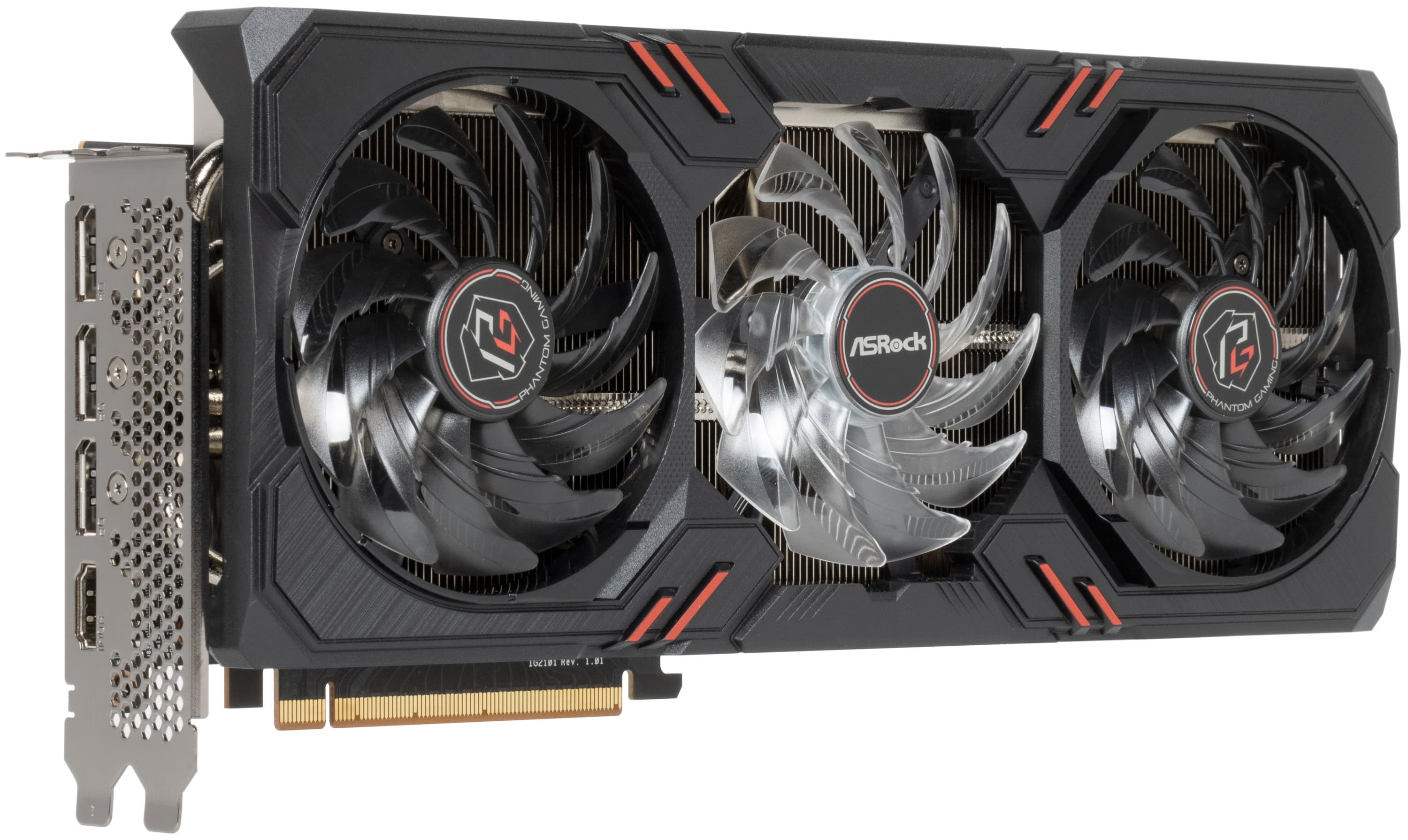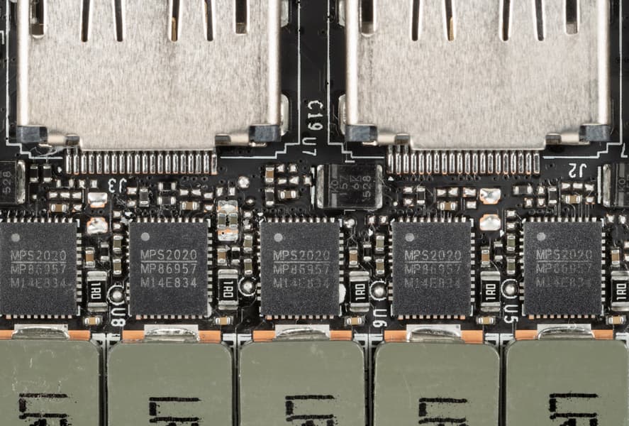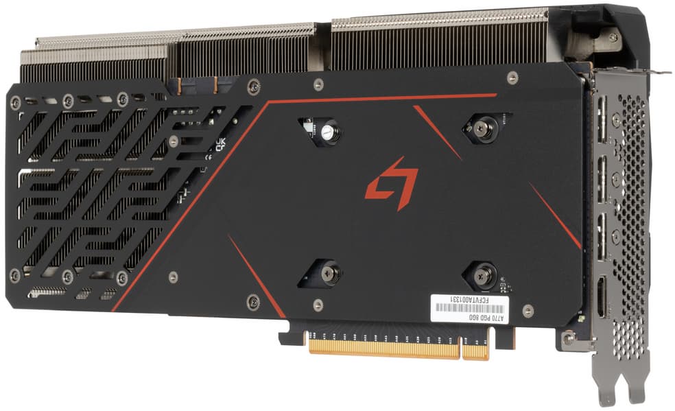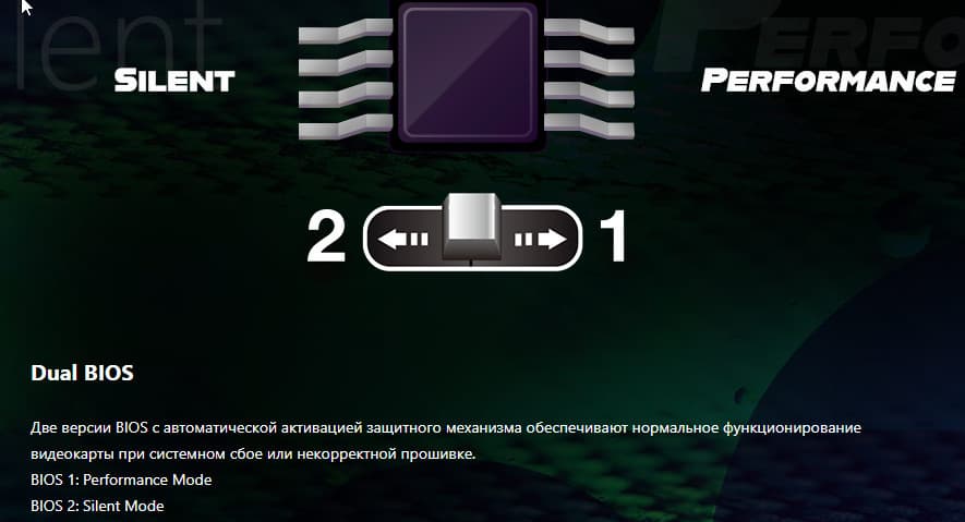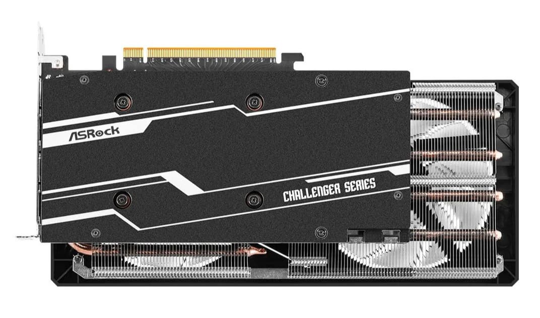 Выбранная нами карта ASRock имеет стандартные размеры, занимает 3 слота в системном блоке. Она имеет стандартный набор видеовыходов: 3 DP 2.0 и 1 HDMI 2.1. Карта ASRock имеет два 8-контактных разъема питания типа PCIe 2.0. Изюминкой этой карты является стильная подсветка.
