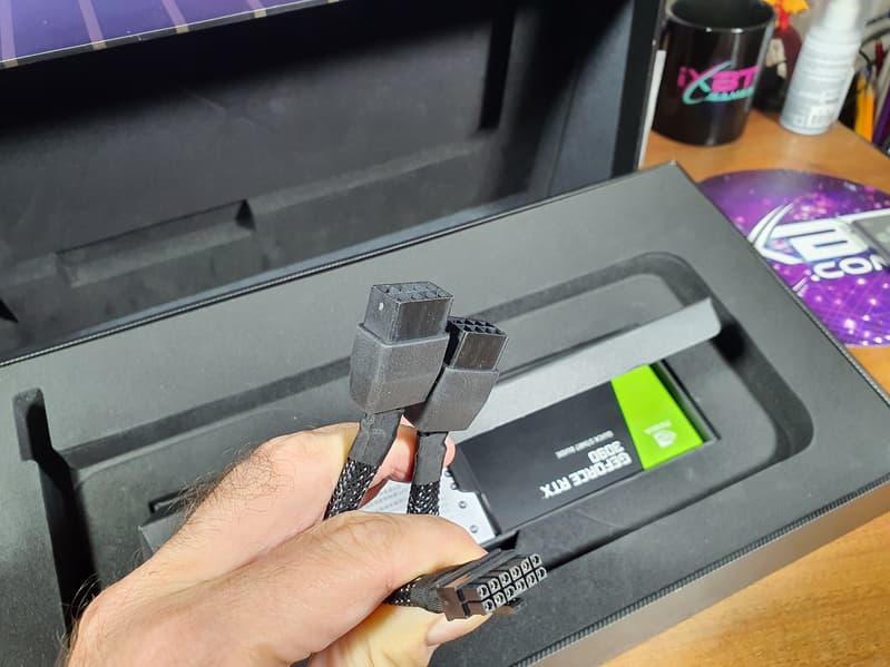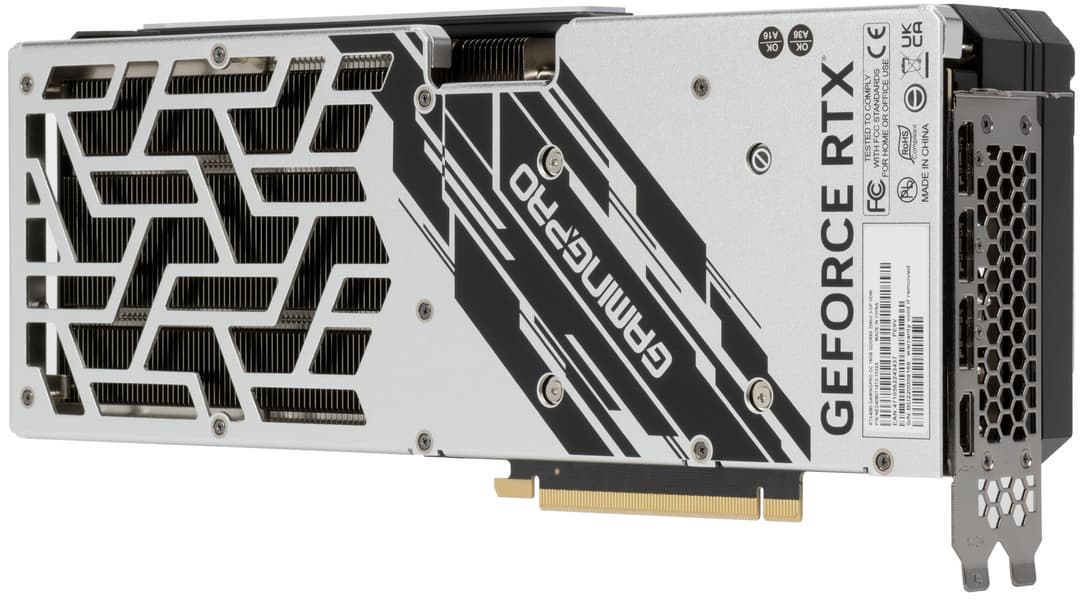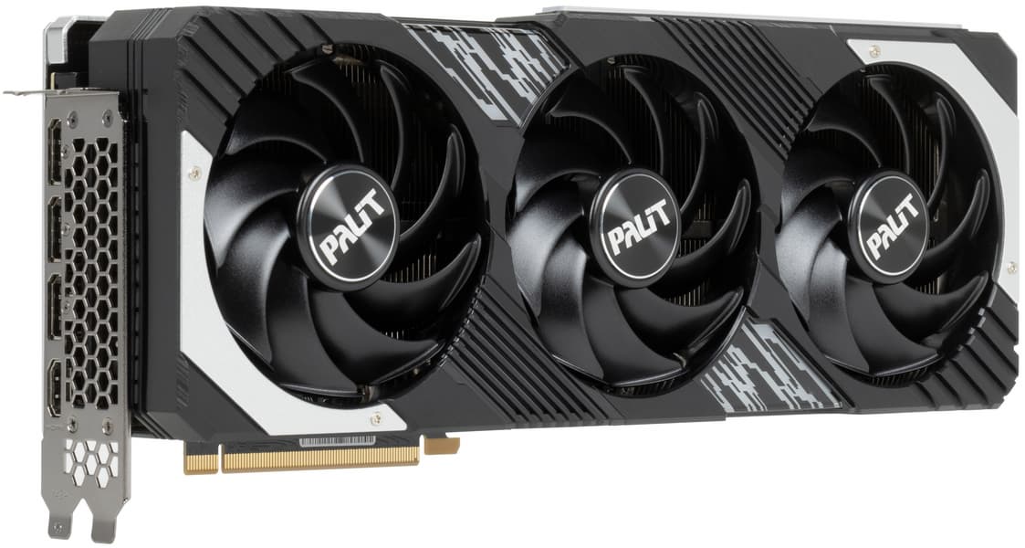 Выбранная карта Palit имеет, разумеется, внушительные габариты (330×133×63 мм), занимает 4 слота в системном блоке. Зато с таким огромным кулером карта работает достаточно тихо. Набор видеовыходов стандартный — 1×HDMI 2.1 и 3×DisplayPort 1.4a. Карта питается через 16-контактный разъем питания PCIe 5.0 (12VHPWR), при этом в комплекте поставки имеется переходник на такой разъем с двух обычных 8-контактных.