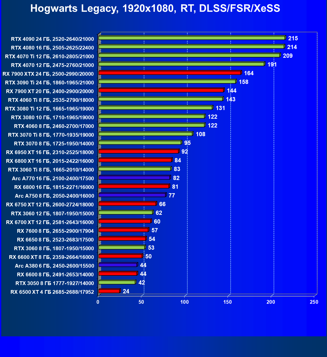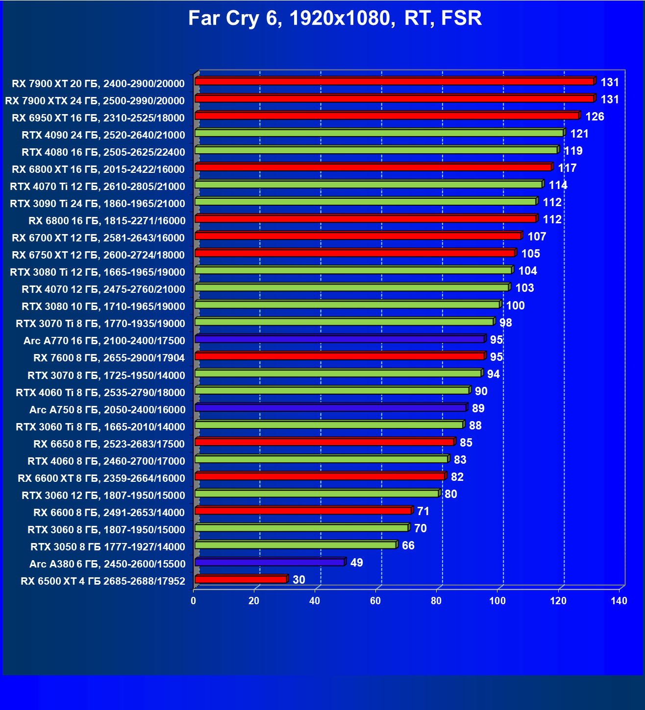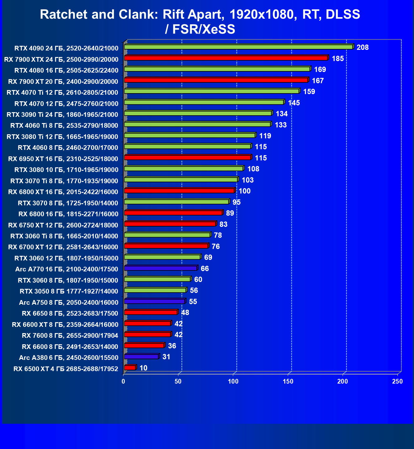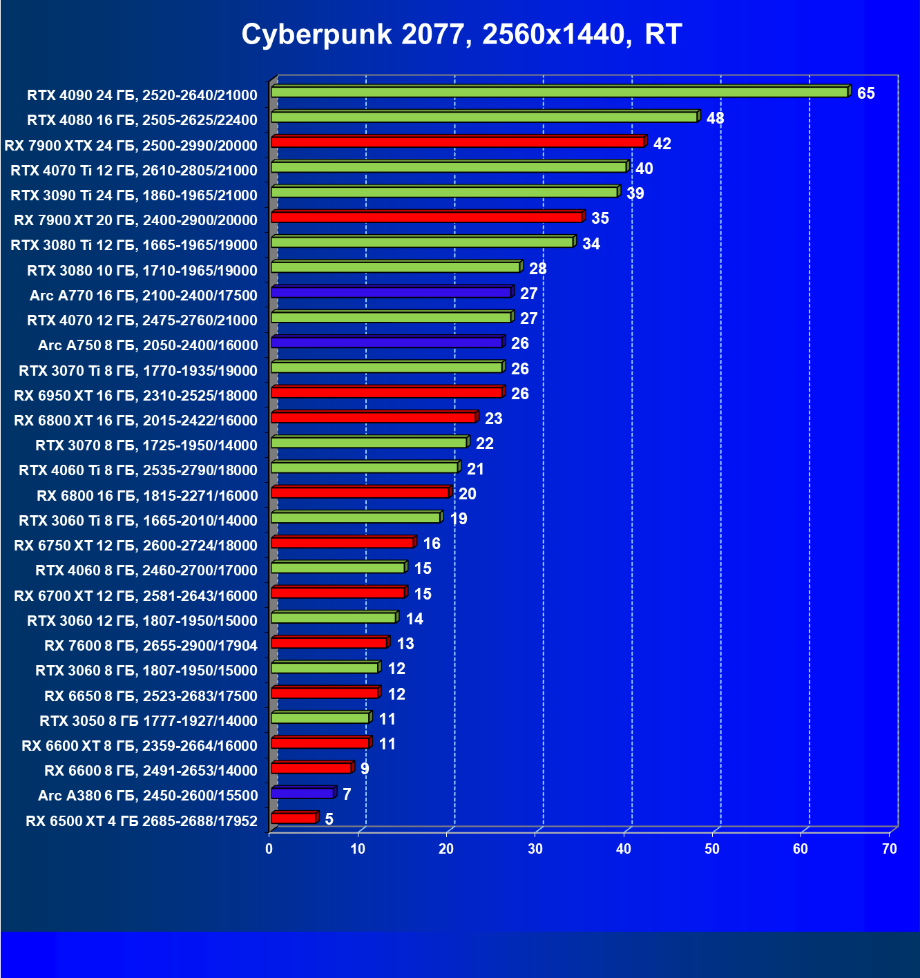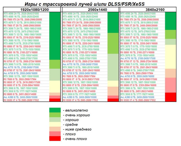Все упомянутые видеокарты подойдут и для игр на мониторах с более массовым разрешением Full HD. При включении трассировки лучей совместно с DLSS, FSR или XeSS полный комфорт обеспечивают карты уровня Radeon RX 6700 XT, GeForce RTX 4060 и GeForce RTX 3060, а также Intel Arc A770 или Radeon RX 7600. А вот Radeon RX 6500 XT включение RT просто не потянет.