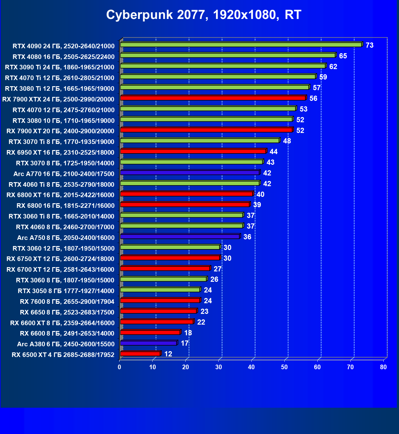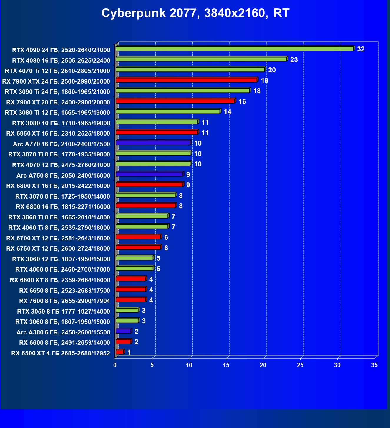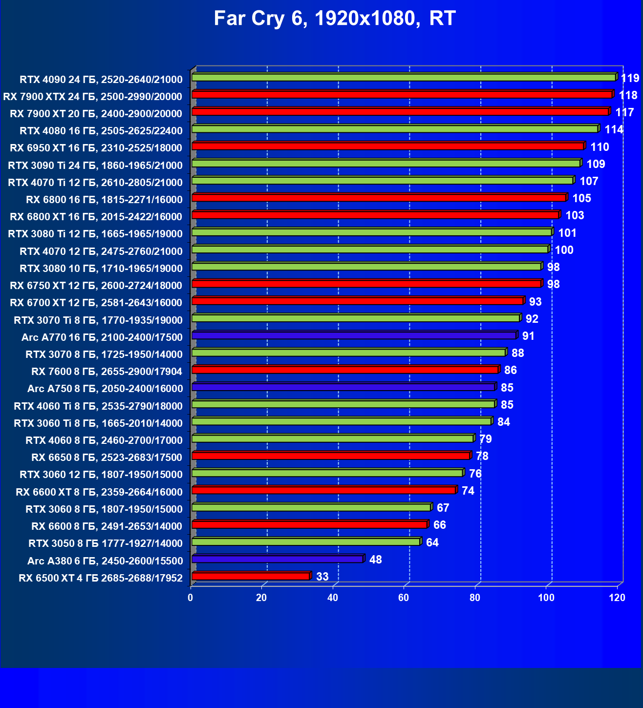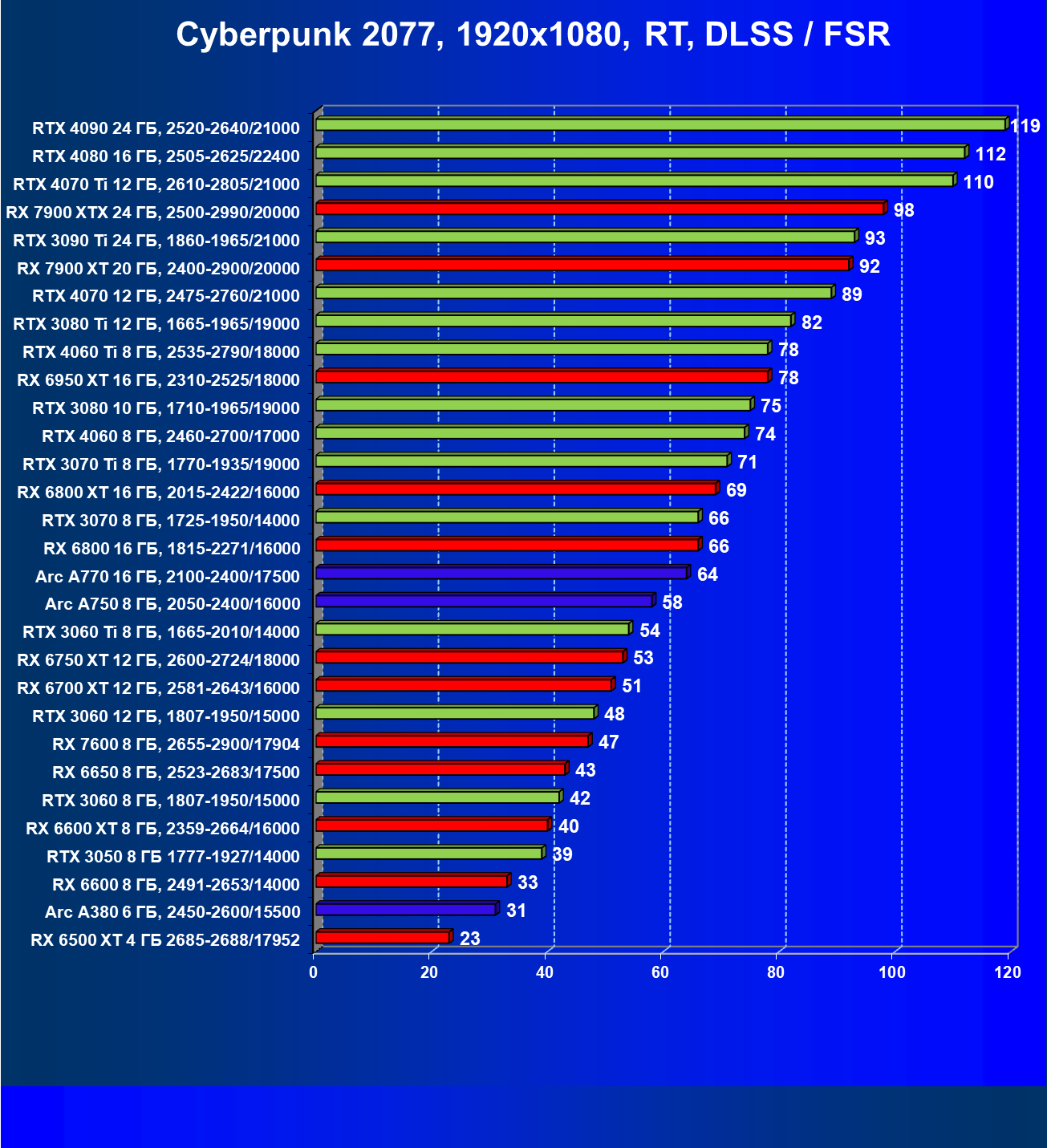 Все упомянутые видеокарты подойдут и для игр на мониторах с более массовым разрешением Full HD. При включении трассировки лучей совместно с DLSS, FSR или XeSS полный комфорт обеспечивают карты уровня Radeon RX 6700 XT, GeForce RTX 4060 и GeForce RTX 3060, а также Intel Arc A770 или Radeon RX 7600. А вот Radeon RX 6500 XT включение RT просто не потянет.