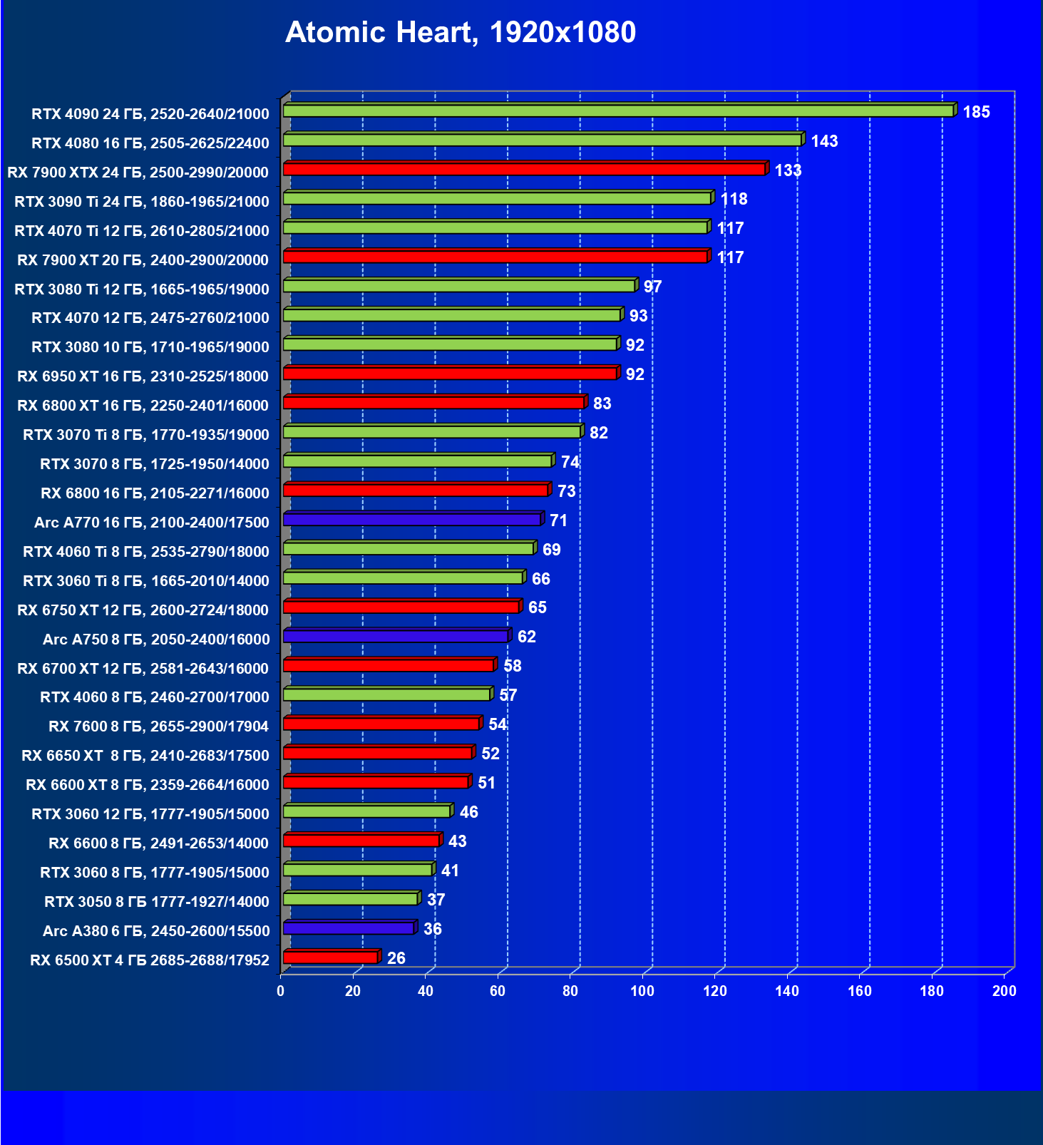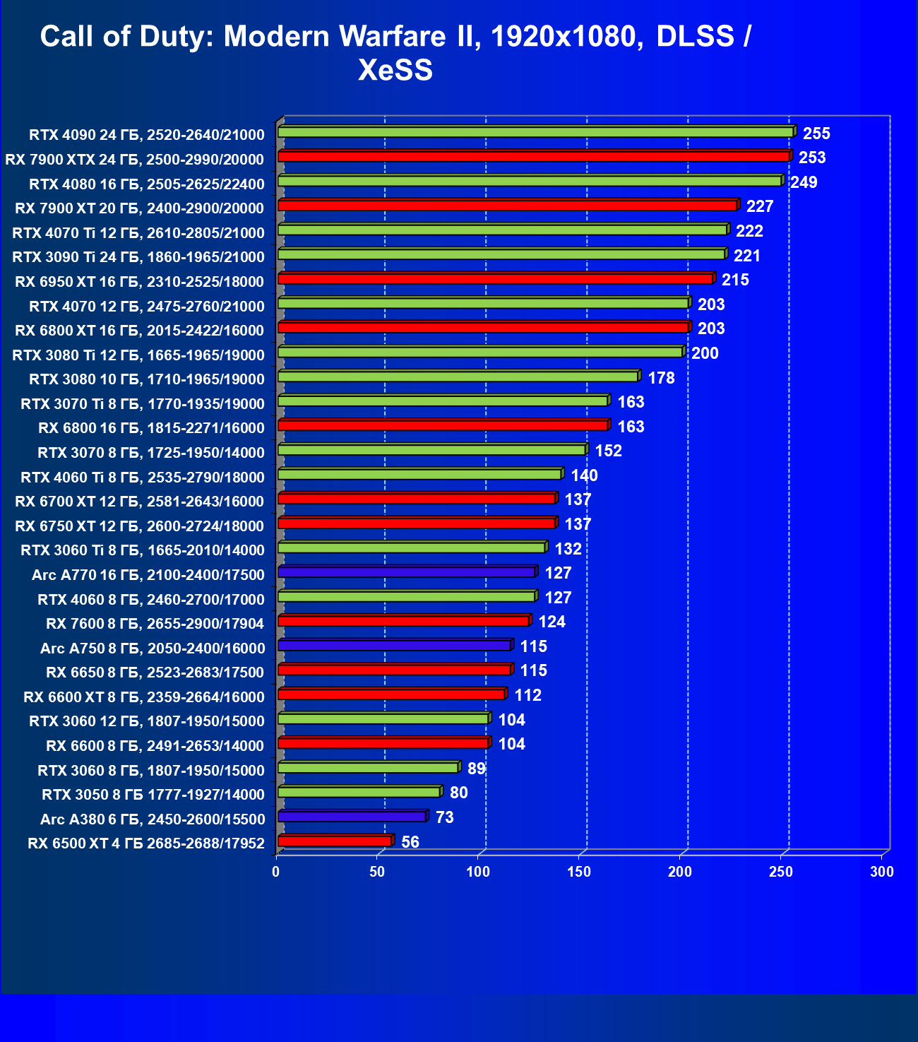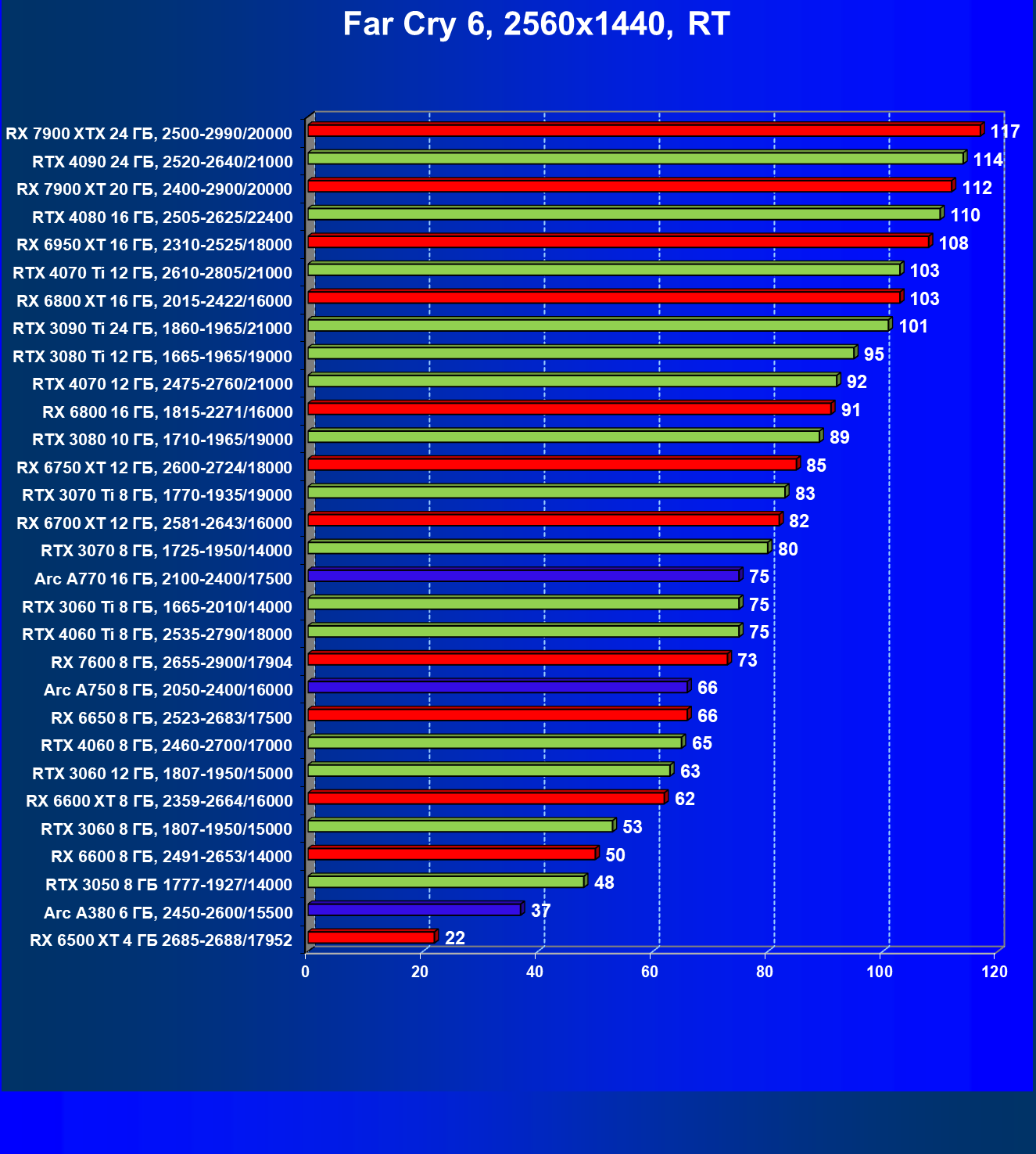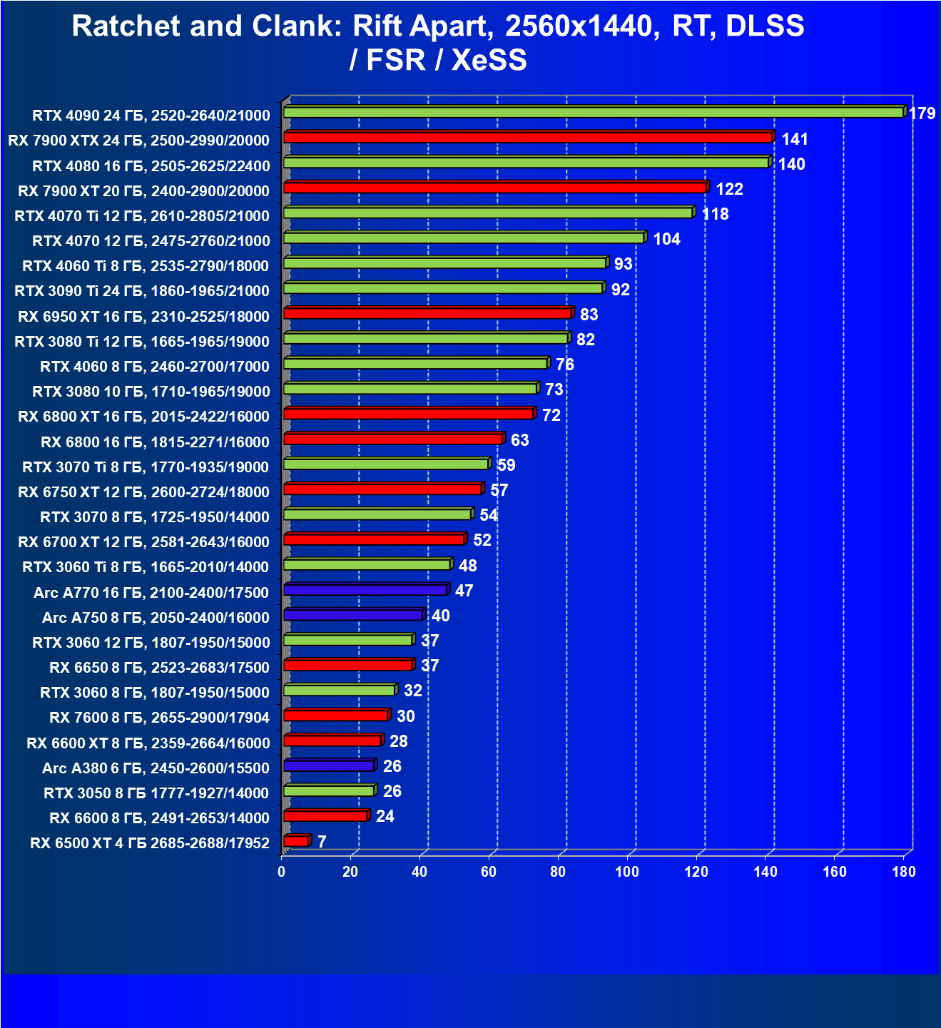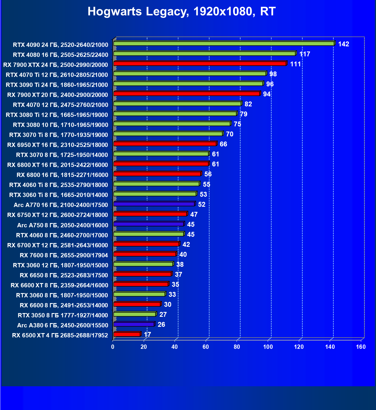 Все упомянутые видеокарты подойдут и для игр на мониторах с более массовым разрешением Full HD. При включении трассировки лучей совместно с DLSS, FSR или XeSS полный комфорт обеспечивают карты уровня Radeon RX 6700 XT, GeForce RTX 4060 и GeForce RTX 3060, а также Intel Arc A770 или Radeon RX 7600. А вот Radeon RX 6500 XT включение RT просто не потянет.