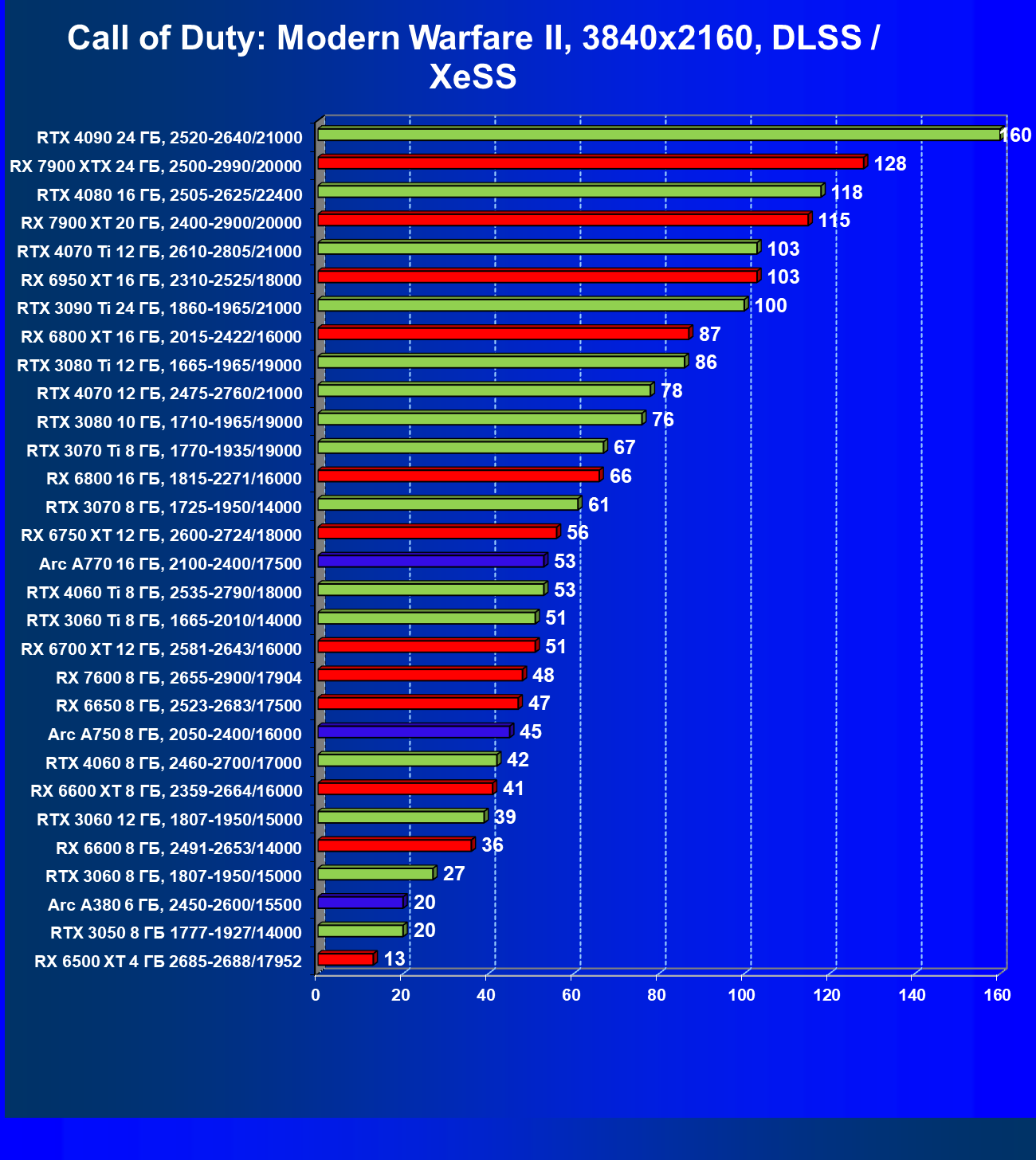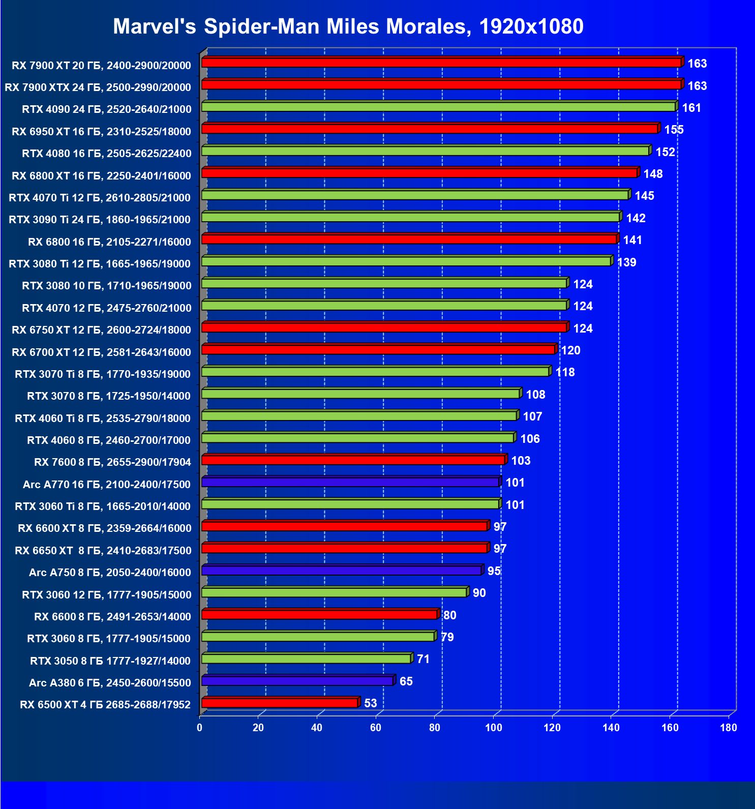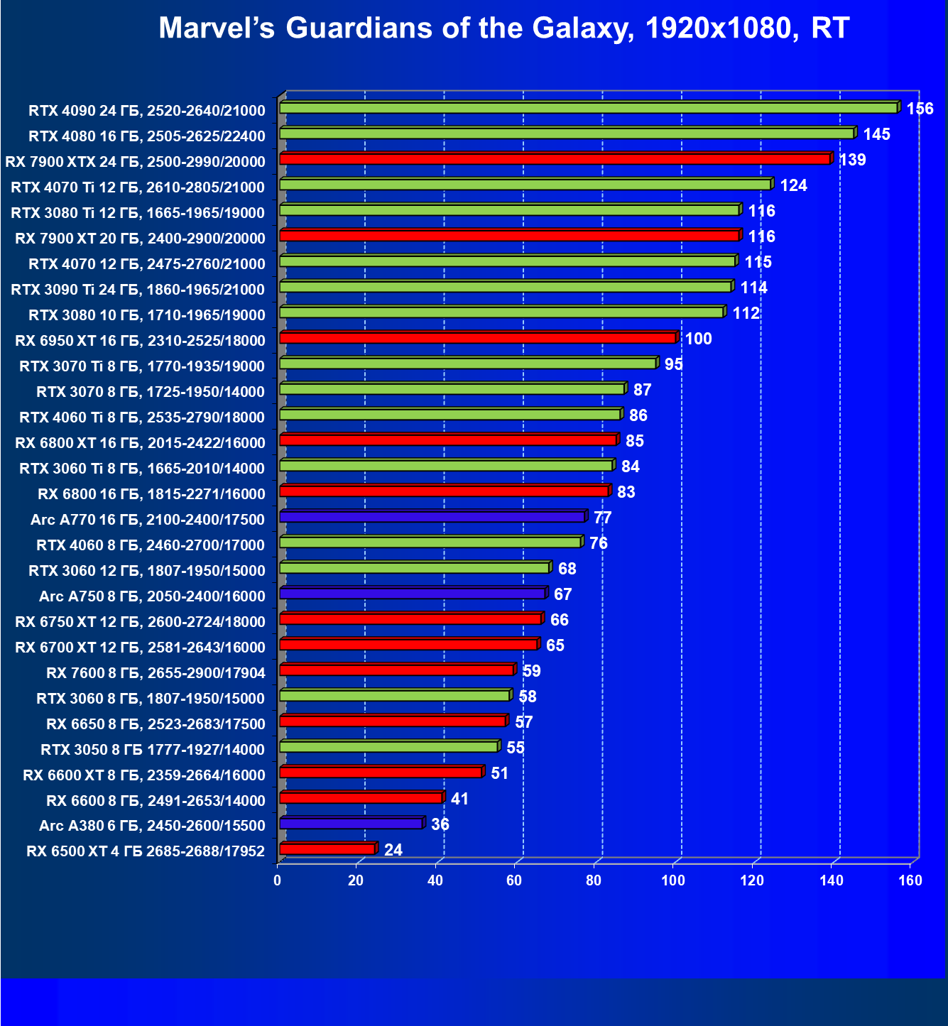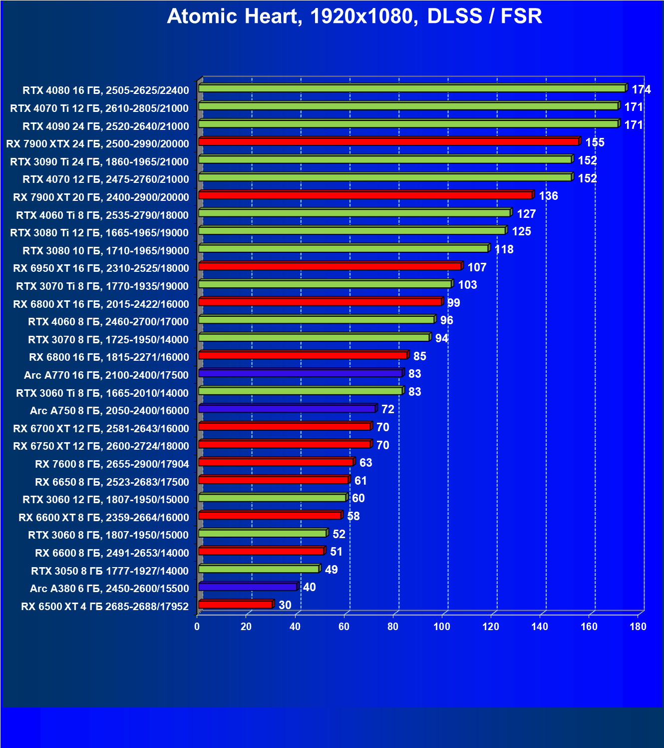 Все упомянутые видеокарты подойдут и для игр на мониторах с более массовым разрешением Full HD. При включении трассировки лучей совместно с DLSS, FSR или XeSS полный комфорт обеспечивают карты уровня Radeon RX 6700 XT, GeForce RTX 4060 и GeForce RTX 3060, а также Intel Arc A770 или Radeon RX 7600. А вот Radeon RX 6500 XT включение RT просто не потянет.