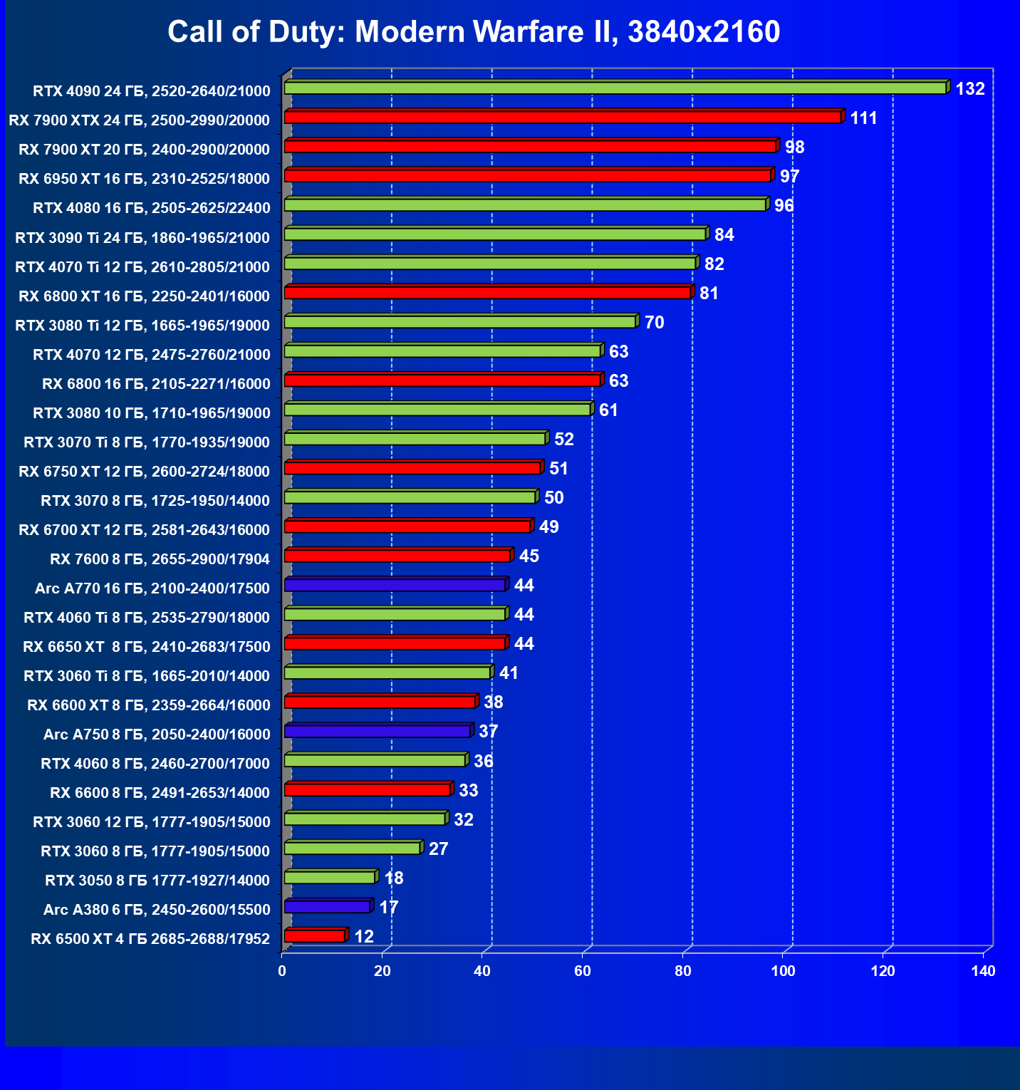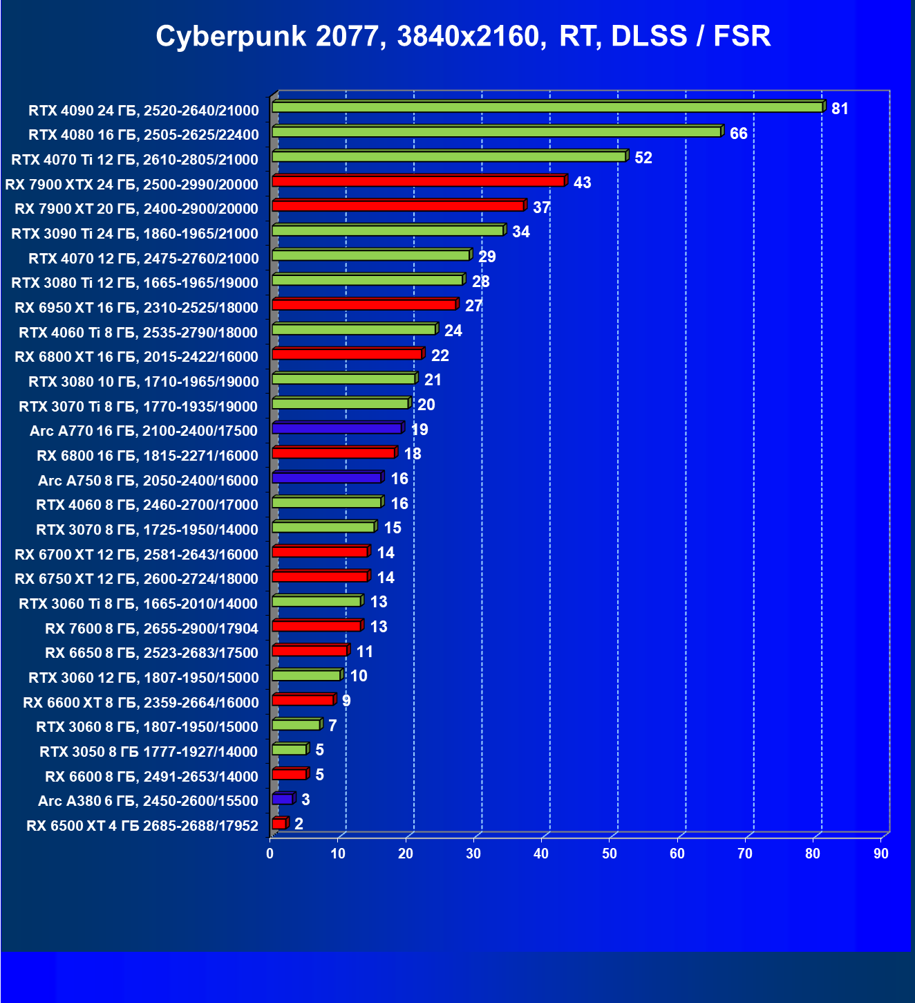 Максимальный комфорт в разрешении 4K при максимальном качестве графики с использованием трассировки лучей и DLSS/FSR/XeSS обеспечат GeForce RTX 4090, GeForce RTX 4080, GeForce RTX 4070 Ti и GeForce RTX 4070, Radeon RX 7900 XT и Radeon RX 7900 XTX. Также в таких условиях хорошо себя покажут модели предыдущего поколения GeForce RTX 3090 Ti и GeForce RTX 3080 Ti.
