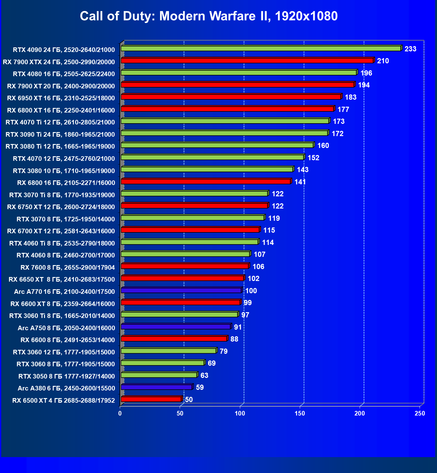 Radeon RX 6500 XT при максимальных настройках графики обеспечит достаточный комфорт не во всех играх, включение FSR обязательно. Для данного разрешения также неплохо подходит Intel Arc A750. Комфортную производительность в классических играх обеспечат и карты прошлых поколений — GeForce RTX 2060, GeForce RTX 2060 Super и Radeon RX 5600 XT. Приемлемо будут справляться Radeon RX 5500 XT и GeForce GTX 1660 Ti, которые потянут некоторые игры в Full HD на максимальных настройках. Менее производительные карты уже не тянут разрешение Full HD при максимальном качестве, а значит, придется снижать качество картинки или разрешение.