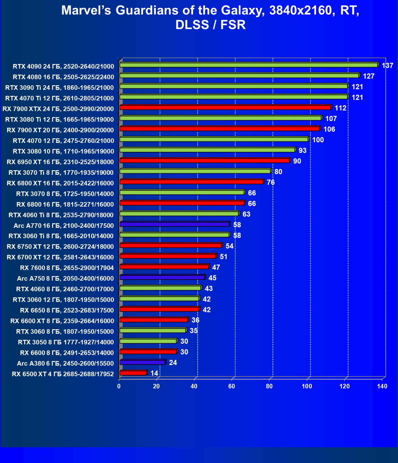 Intel Arc A770 также занимает лидирующие позиции в своей ценовой группе в обоих рейтингах (без RT и с RT+FSR/XeSS). Карты на базе A770 отлично подходит для игры в разрешении Full HD с максимальным качеством графики, но при включении трассировки лучей потребуется использовать FSR/XeSS, а в некоторых играх без RT можно получить приемлемый комфорт и в разрешении 2.5K. Также отметим поддержку стандарта HDMI 2.1, позволяющего выводить 4K-изображение со 120 FPS или 8K-разрешение при помощи одного кабеля, и стандарта DP 2.0, поддержку аппаратного декодирования и кодирования видеоданных в формате AV1. Эти видеокарты Intel очень сильно зависят от поддержки Resizable BAR (у AMD она носит маркетинговое наименование Smart Access Memory) — возможности PCI Express, позволяющей процессору получать доступ ко всей видеопамяти, а не только к ее маленькому кусочку. Технология поддерживается только относительно современными процессорами и системными платами (начиная с Intel Core 10-го поколения и AMD Ryzen 3000), потребуется обновление BIOS для старых системных плат.