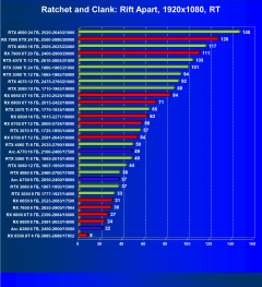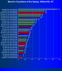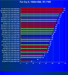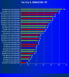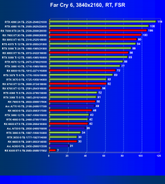 Ускорители семейства Radeon RX 6000 при включении RT в разрешении 4K смотрятся гораздо бледнее, обычно в их случае можно рассчитывать лишь на комфорт в разрешении 2.5K (да и то с включением FSR/XeSS). Даже Radeon RX 6950 XT с трудом справляется с играми в разрешении 4K с трассировкой лучей, его спасает только поддержка в игре технологий FSR/XeSS.