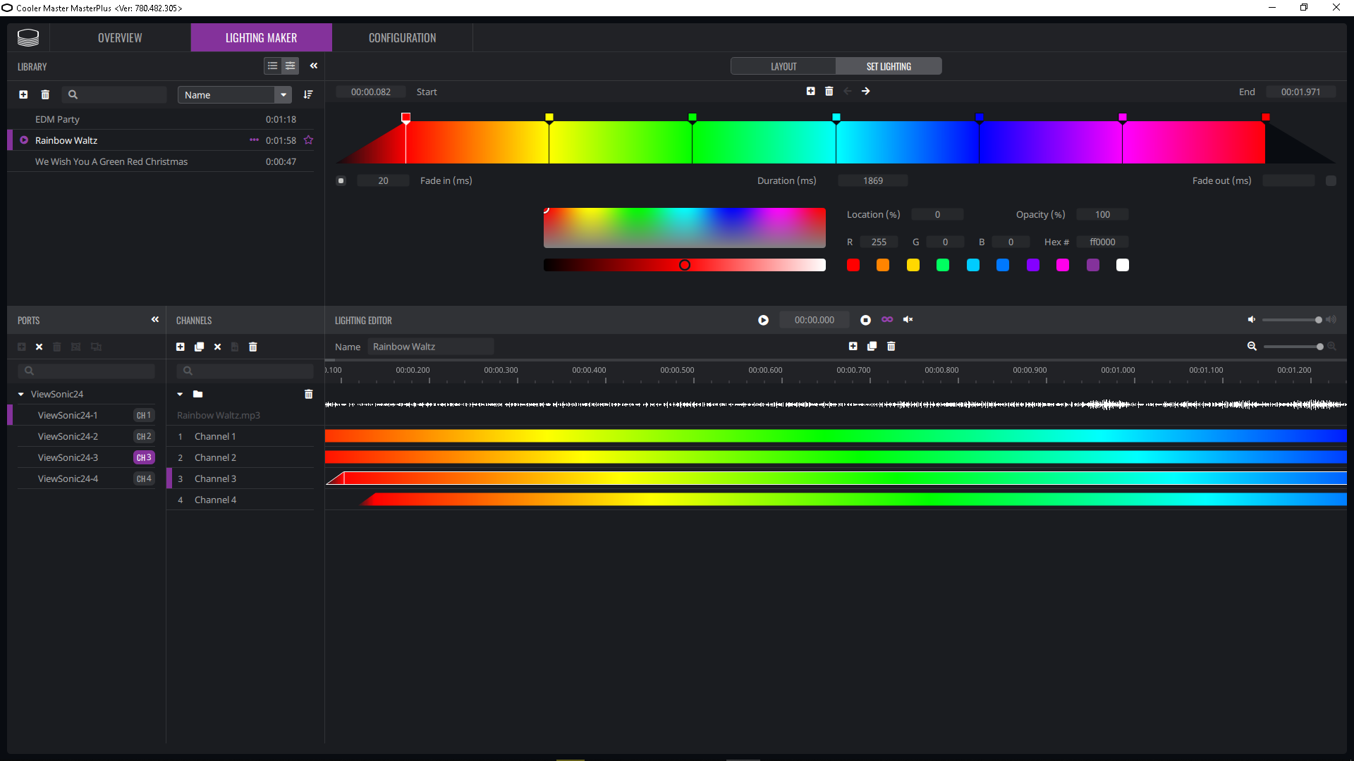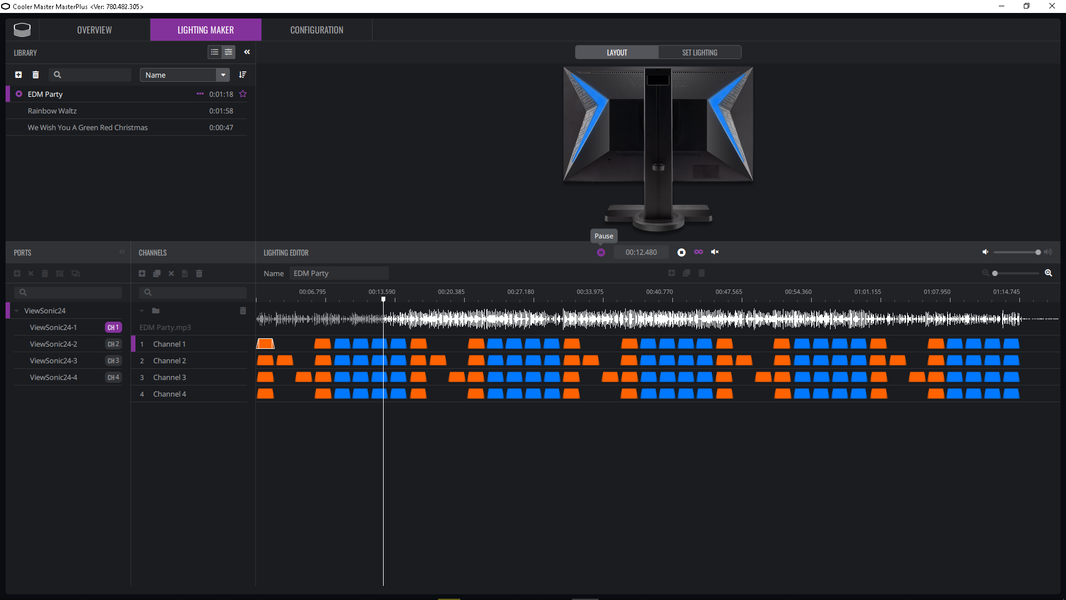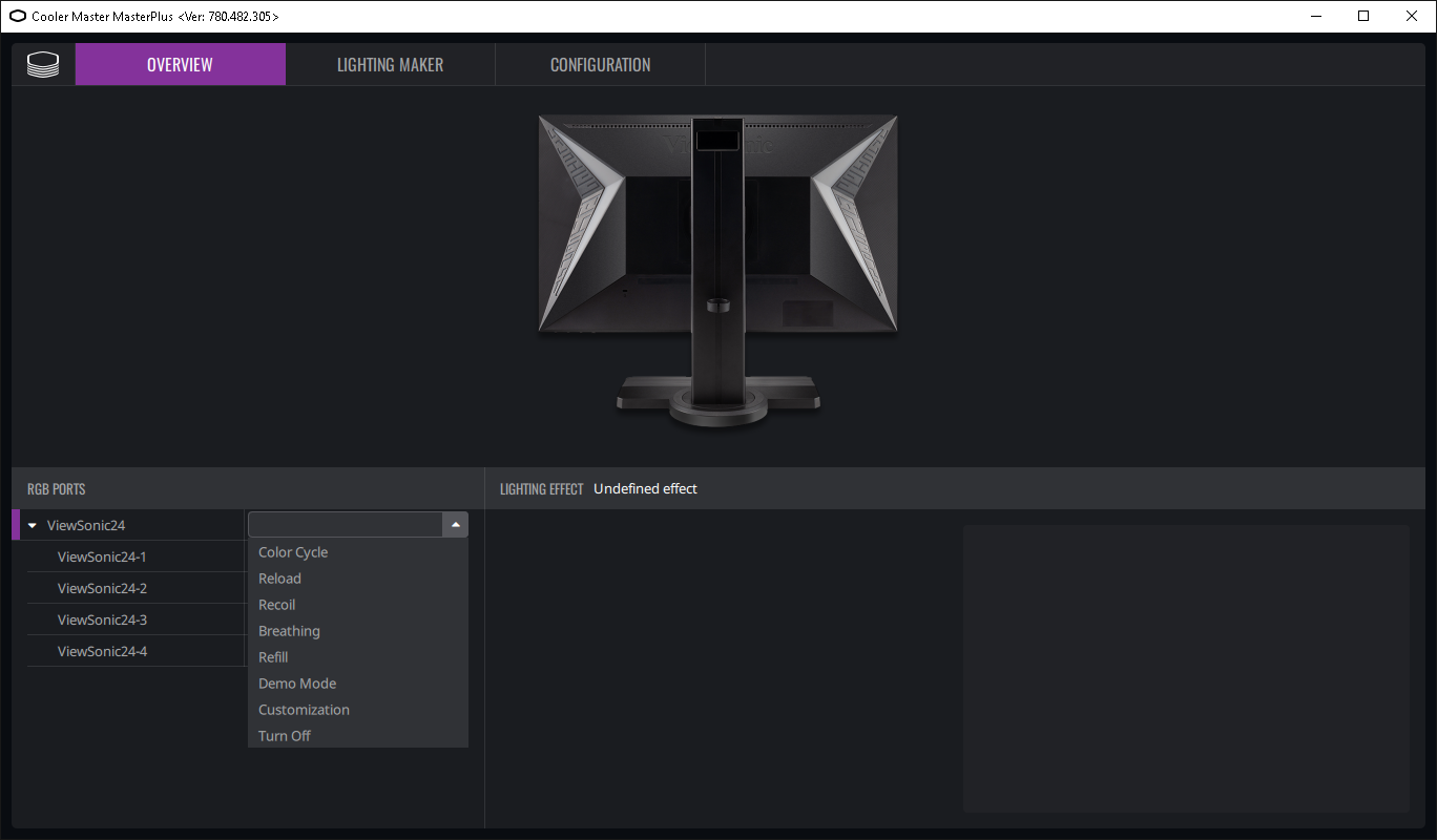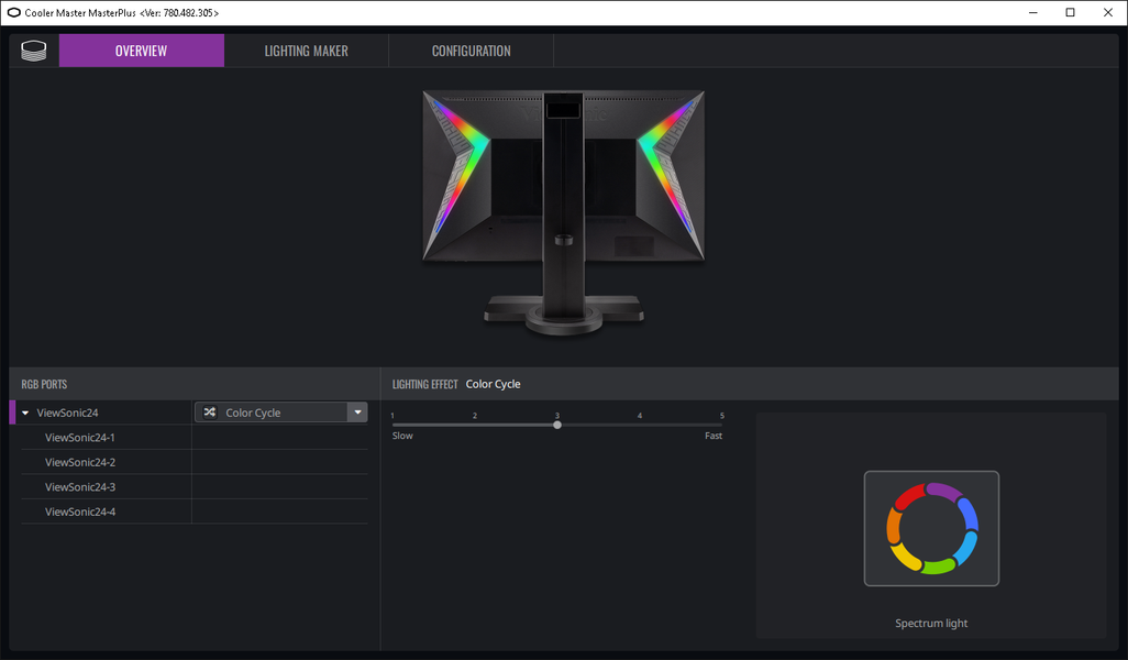 Тонко настраивать работу подсветки можно с ПК при подключении монитора к компьютеру по USB. Производитель предлагает использовать сторонние программы и преподносит это как преимущество, избавляя пользователя от необходимости устанавливать лишнее ПО. Есть совместимость с ПО Razer Chroma, Thermaltake RGB Plus и Cooler Master MasterPlus. По факту, чтобы использовать первые два, нужно иметь хотя бы одно подключенное устройство с управляемой подсветкой от данных производителей, и только в случае Cooler Master MasterPlus достаточно только этого монитора. В данном ПО можно выбрать один из предустановленных динамических режимов и настроить его работу.