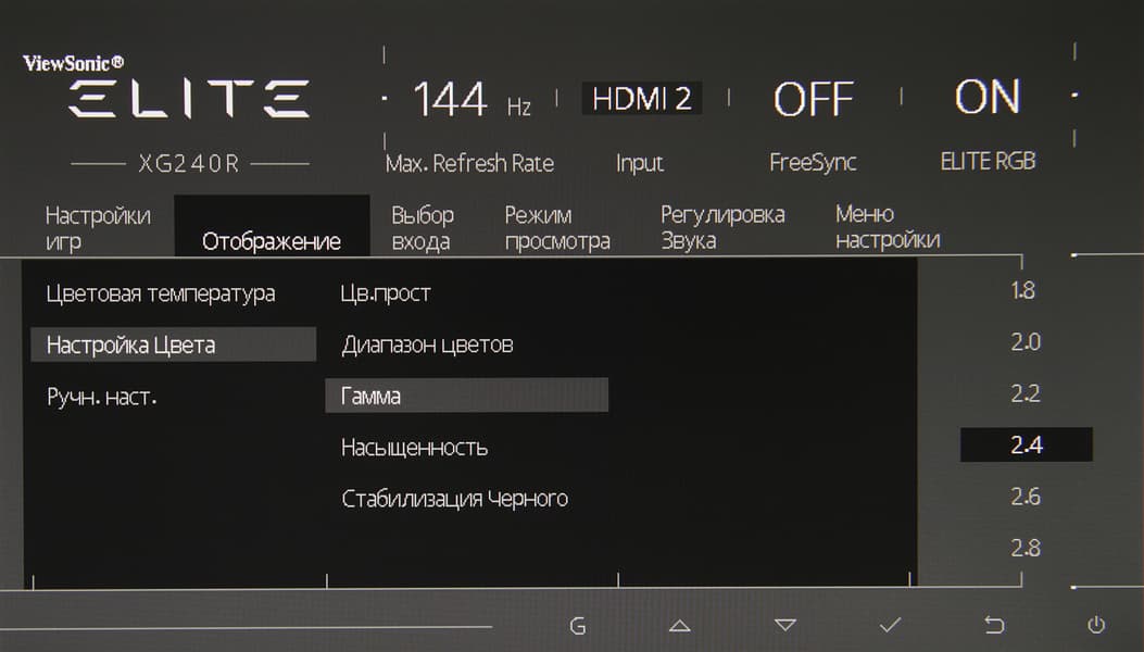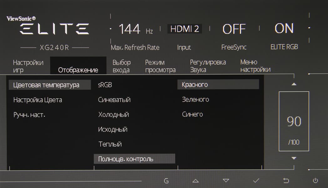 Настроек не очень много, есть регулировки яркости, контрастности и насыщенности, а также выбор профиля цветовой температуры из пяти предустановленных или пользовательского, в котором цветовой баланс можно подправить регулировками интенсивности трех основных цветов. Можно выбирать профиль гамма-коррекции, есть отдельная настройка, регулирующая интенсивность синей компоненты и т. д.