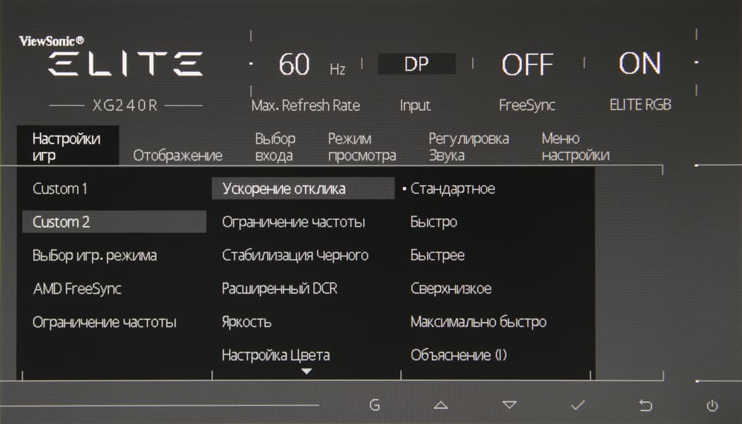 Дополнительно есть возможность управлять разгоном матрицы, ограничивать максимальную кадровую частоту, выбирать профиль коррекции темного участка гамма-кривой и включать/выключать поддержку AMD FreeSync.