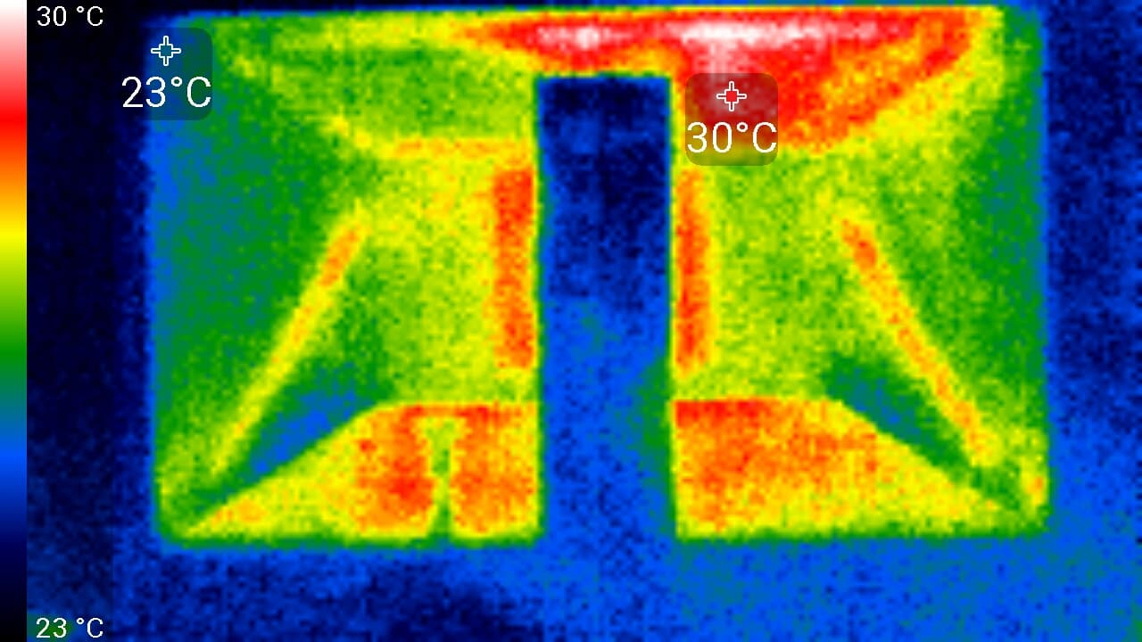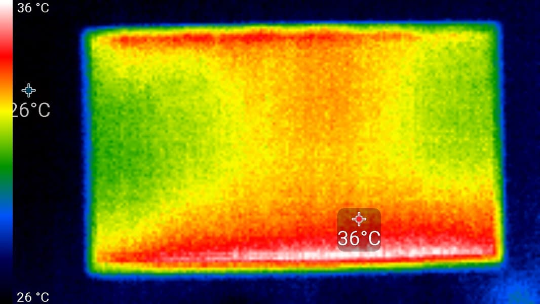 Снимки с более близкого расстояния показали, что задняя панель нагревается до 33 °C максимум (в районе верхней решетки), тогда как нижний край экрана нагрелся до 39 °C максимум. Видимо, внизу находится светодиодная линейка подсветки экрана.