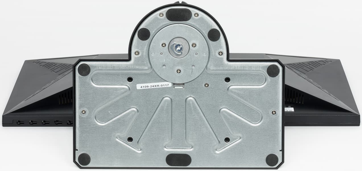На задней панели монитора есть две симметричные вставки из белого полупрозрачного пластика. За ними находятся адресуемые RGB-светодиоды: по 5 штук в верхних лучах и по 10 штук в нижних. В меню монитора подсветку можно включить, выключить и сбросить режим работы на вариант по умолчанию.