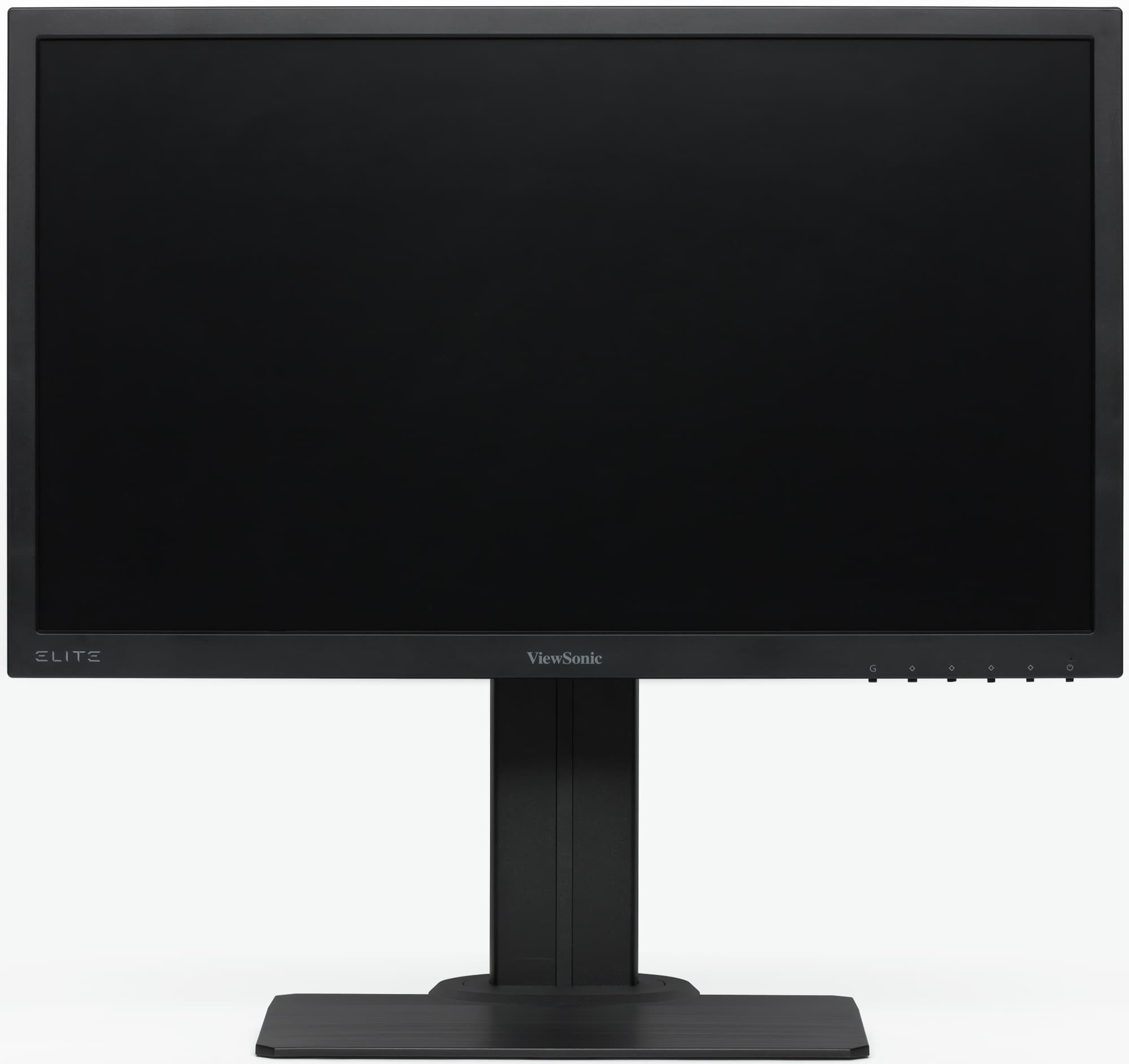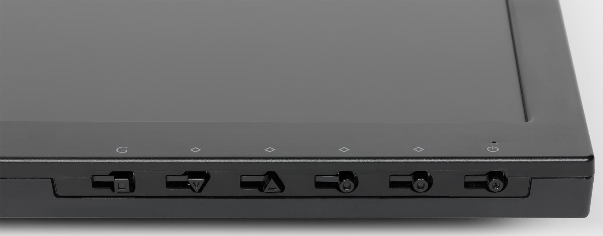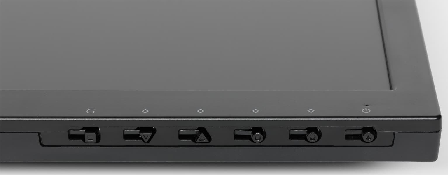 Панели монитора и кожухи подставки изготовлены из черного пластика, в основном просто матового и гладкого, но местами с фактурой, геометрическим узором и зеркально-гладкими участками. Внешняя поверхность матрицы черная, полуматовая, и по ощущениям внешний слой матрицы жесткий. Справа внизу на фронтальной рамке блока экрана нанесены контрастные значки кнопок. Сами кнопки механические и расположены под метками на нижнем торце. Геометрия кнопок различается, но на практике на ощупь отличить одну кнопку от другой невозможно.