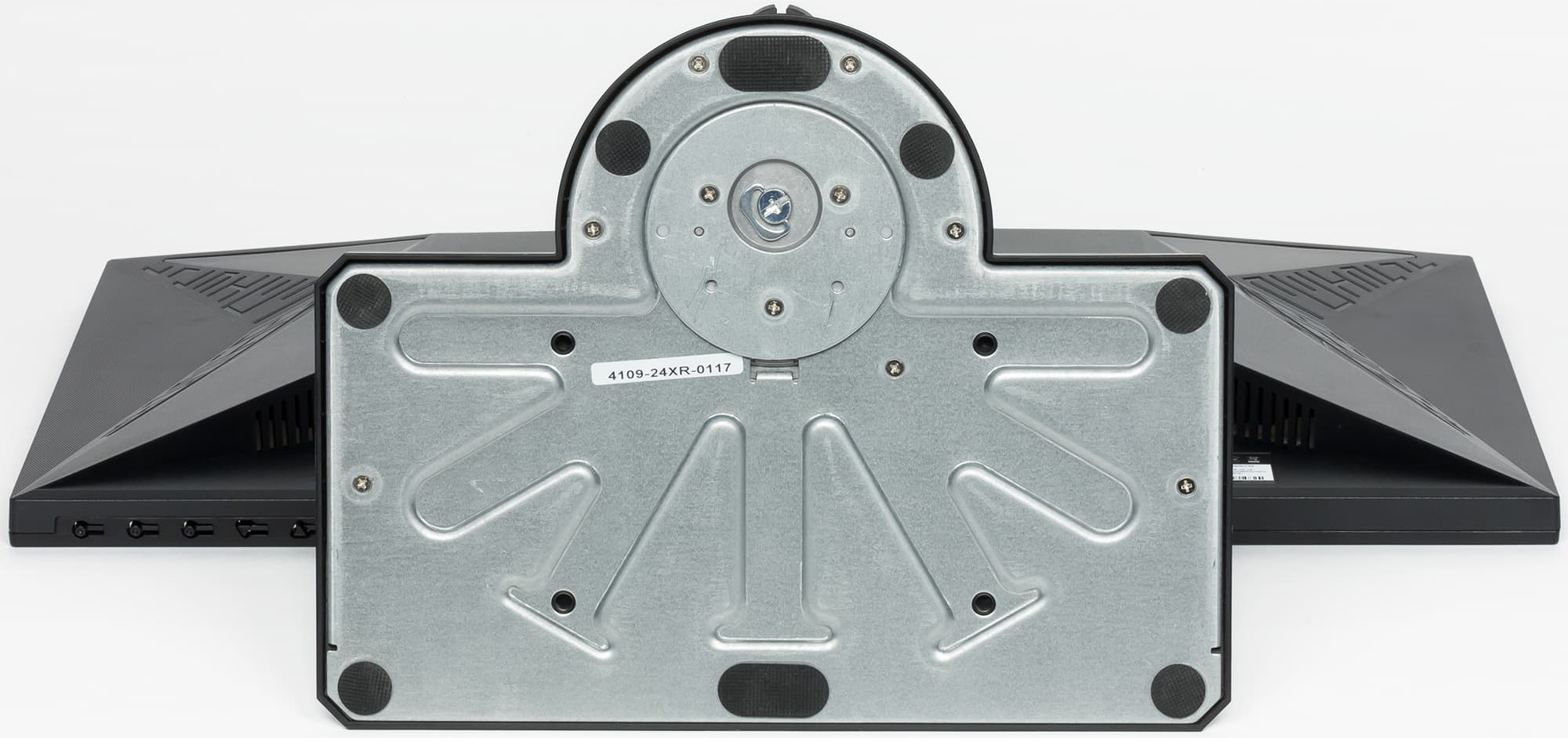 Вентиляционные решетки находятся на панели с разъемами, сзади вверху и на скошенных обращенных вниз гранях на задней панели. За последними можно разглядеть небольшие громкоговорители с круглыми диффузорами. Громкоговорители установлены в индивидуальные корпуса, закрепленные на резиновых демпфирующих стойках. Монитор оснащен встроенным блоком питания. Стойка имеет фиксированную высоту, но подпираемый пружиной механизм со стальным рельсовым шариковым подшипником обеспечивает вертикальное перемещение шарнира, на который крепится блок экрана. Ниша в верхней части стойки формирует удобную ручку для переноски монитора в сборе, а еще выше, на торце стойки есть выдвижной крючок для наушников.