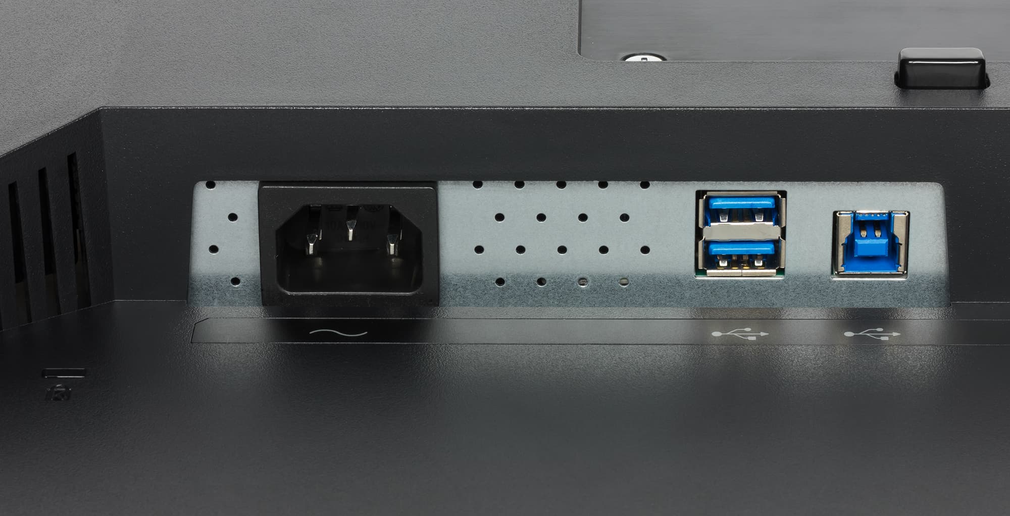 Видеовходов три — два HDMI версии 1.4 и один DisplayPort версии 1.2. Входы выбираются в меню, также есть автоматический выбор входа, на котором сигнал появился при отсутствии сигнала на текущем входе. HDMI и DisplayPort способны принимать цифровые аудиосигналы (только PCM стерео), которые выводятся после преобразования в аналоговый вид на встроенные громкоговорители и через гнездо миниджек 3,5 мм. К аналоговому аудиовыходу можно подключить внешнюю активную акустическую систему или наушники. Встроенные громкоговорители звучат согласно их размерам и акустическому окружению — не очень громко, без низких частот вообще, с выраженным «пластиковым» призвуком, со слабым стереофоническим эффектом и сильными искажениями громких звуков. Мощности выхода хватило, чтобы в 32-омных наушниках с чувствительностью 112 дБ был небольшой запас по громкости. Качество звука в наушниках плохое — низких частот все также нет, звук плоский и невыразительный. В монитор встроен концентратор USB (3.0) с одним входом и двумя выходами.