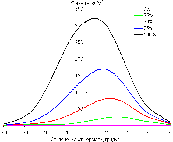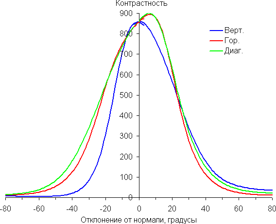 Отметим плавное уменьшение яркости при отклонении от перпендикуляра к экрану в горизонтальном направлении, при этом графики не пересекаются во всем диапазоне измеряемых углов. При отклонении вниз темные оттенки инвертируются, при отклонении вверх инвертируются светлые. Контрастность в диапазоне углов ±82° опускается ниже отметки 10:1 при отклонении вниз по диагонали более чем на 58°. Углы обзора, как это и ожидаемо для матрицы TN, плохие, но все же не самые плохие для данного типа матриц.