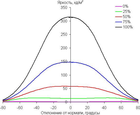 Чтобы выяснить, как меняется яркость экрана при отклонении от перпендикуляра к экрану, мы провели серию измерений яркости черного, белого и оттенков серого в центре экрана в широком диапазоне углов, отклоняя ось датчика в вертикальном, горизонтальном и диагональном направлениях.