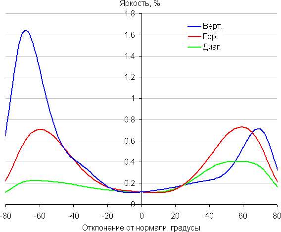 Из графиков следует, что только при отклонении вверх хотя бы основные цвета не сильно изменяются в оттенке. Вообще, значительный сдвиг большинства оттенков является, наряду с инвертированием яркости полутонов, характерной особенностью матриц типа TN и основным недостатком.