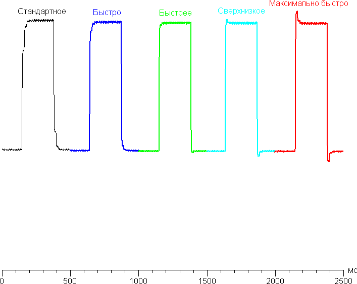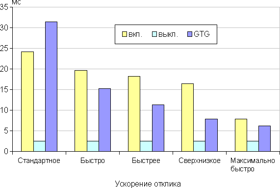 Время отклика зависит от значения настройки «Ускорение отклика», которая управляет разгоном матрицы. График ниже показывает, как меняется время включения и выключения при переходе черный-белый-черный (столбики вкл. и выкл.), а также среднее суммарное время для переходов между полутонами (столбики GTG) в зависимости от значения настройки «Ускорение отклика»: