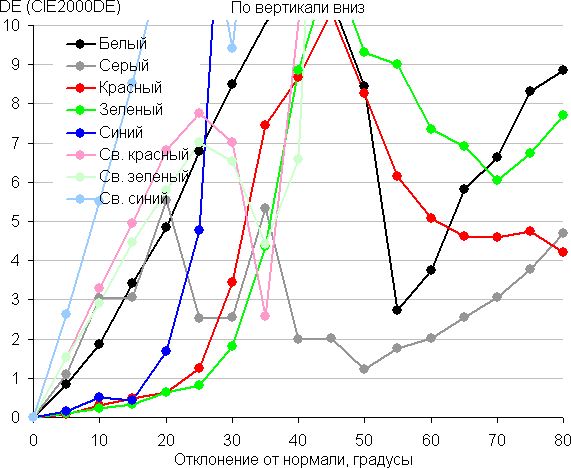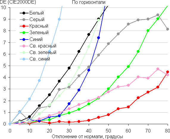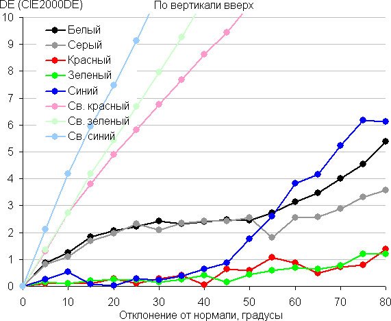 Для количественной характеристики изменения цветопередачи мы провели колориметрические измерения для белого, серого (127, 127, 127), красного, зеленого и синего, а также светло-красного, светло-зеленого и светло-синего полей во весь экран с использованием установки, подобной той, что применялась в предыдущем тесте. Измерения проводились в диапазоне углов от 0° (датчик направлен перпендикулярно к экрану) до 80° с шагом в 5°. Полученные значения интенсивностей были пересчитаны в ΔE относительно замера каждого поля при перпендикулярном положении датчика относительно экрана. Результаты представлены ниже: