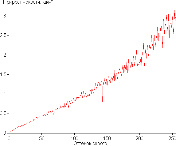 Таким образом, увеличение данного параметра повышает различимость деталей в тенях. При Стабилизация черного = 16 значения Гамма и реального показателя близки. Далее мы измерили яркость 256 оттенков серого (от 0, 0, 0 до 255, 255, 255) при Стабилизация черного = 16 и Гамма = 2.2. График ниже показывает прирост (не абсолютное значение!) яркости между соседними полутонами: