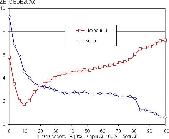Цветовой баланс при выборе профиля Исходный близок к стандартному, но все равно мы попытались вручную скорректировать цвета, регулируя усиление трех основных цветов. Графики ниже показывают цветовую температуру на различных участках шкалы серого и отклонение от спектра абсолютно черного тела (параметр ΔE) в случае профиля Исходный и после ручной коррекции (96/91/86 для значений R/G/B):