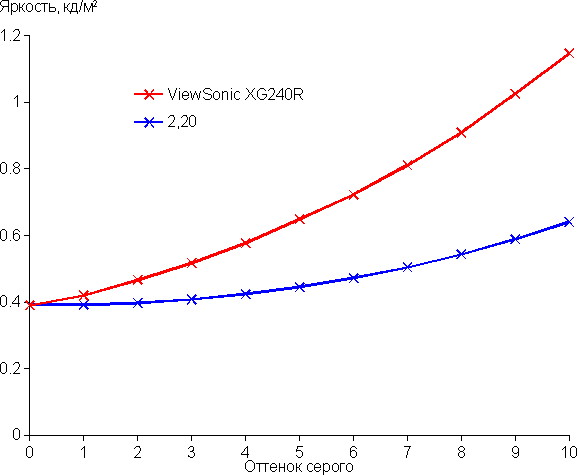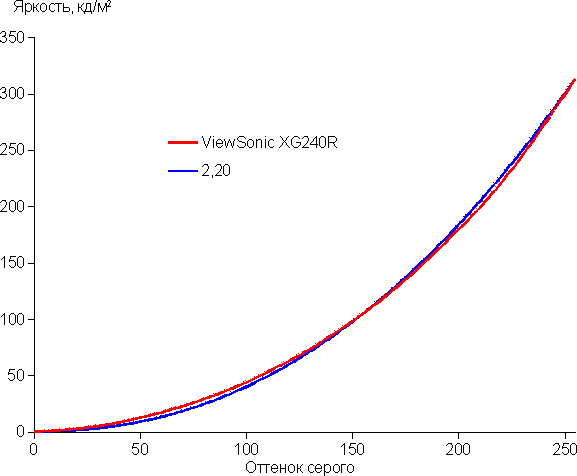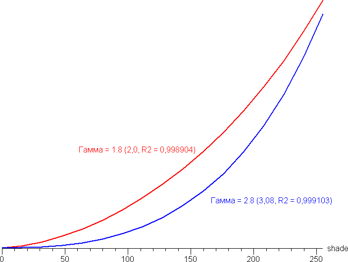 Аппроксимация полученной гамма-кривой дала показатель 2,20, что равно стандартному значению 2,2. При этом аппроксимирующая степенная функция слегка отклоняется от реальной гамма-кривой: