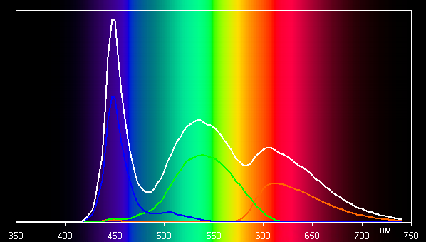 Такой спектр с относительно узким пиком синего и с широкими горбами зеленого и красного цветов характерен для мониторов, в которых используется белая светодиодная подсветка с синим излучателем и желтым люминофором.