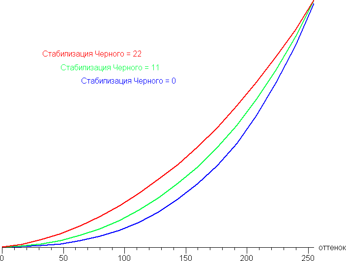 При увеличении параметра Стабилизация черного изображение светлеет и реальное значение показателя уменьшается, при уменьшении — изображение темнеет и реальное значение показателя растет: