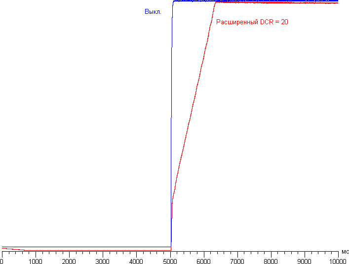При включении режима с динамическим управлением яркости установившаяся контрастность формально возрастает, но не до бесконечности, так как даже на черном поле во весь экран подсветка совсем не выключается. График ниже показывает, как увеличивается яркость (вертикальная ось) при переключении с черного поля (после пяти секунд вывода) на белое при выключенной и включенной динамической подстройке яркости:
