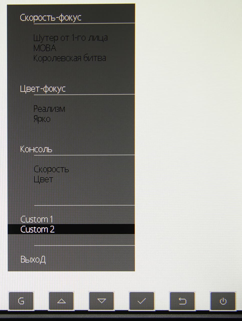 Индикатор питания при работе светится синим (можно отключить в меню), в режиме ожидания — оранжевым и не горит, если монитор условно выключен. Когда монитор включен и на экране нет меню, то при первом нажатии на любую кнопку, кроме кнопок G и питания, на экран выводится меню с настройками.