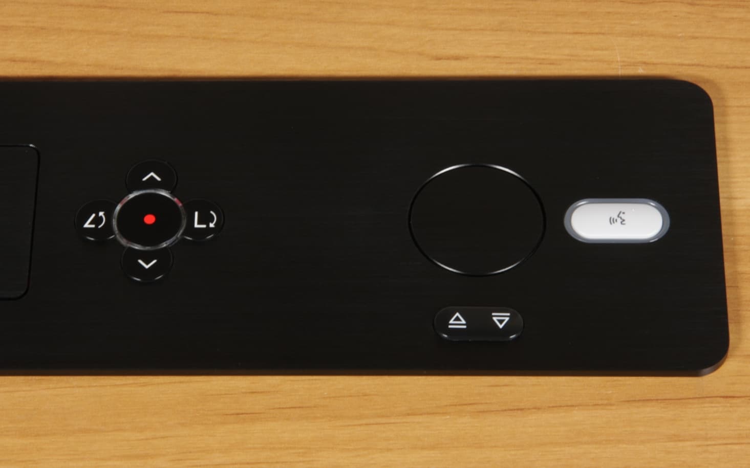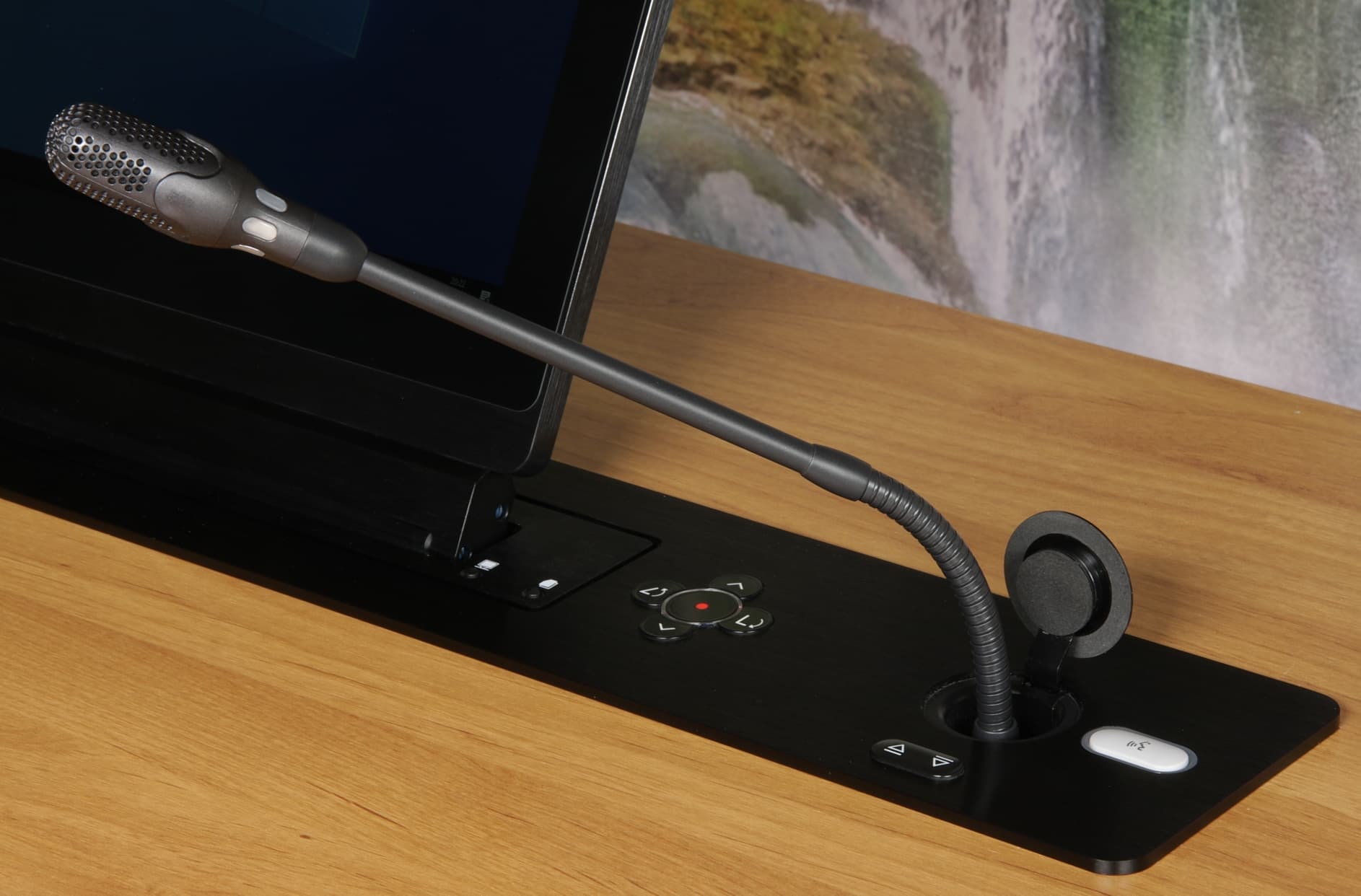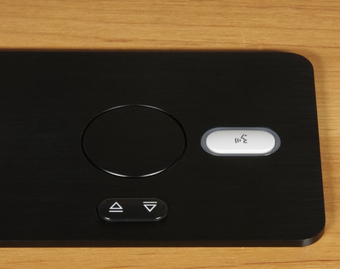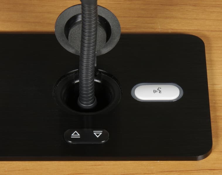 Лифт микрофона управляется отдельными кнопками независимо от лифта монитора. При нажатии на левую часть сдвоенной кнопки открывается лючок и микрофон выдвигается до крайнего верхнего положения, а при нажатии на правую часть — задвигается внутрь и лючок закрывается. Большая белая кнопка — это кнопка делегата, которая включает/выключает микрофон. Когда микрофон включен, ободок вокруг кнопки подсвечивается красным. Эта кнопка является оригинальной частью многомодульной конгресс-системы Bosch DCN. Также микрофоном можно управлять дистанционно с помощью систем управления.