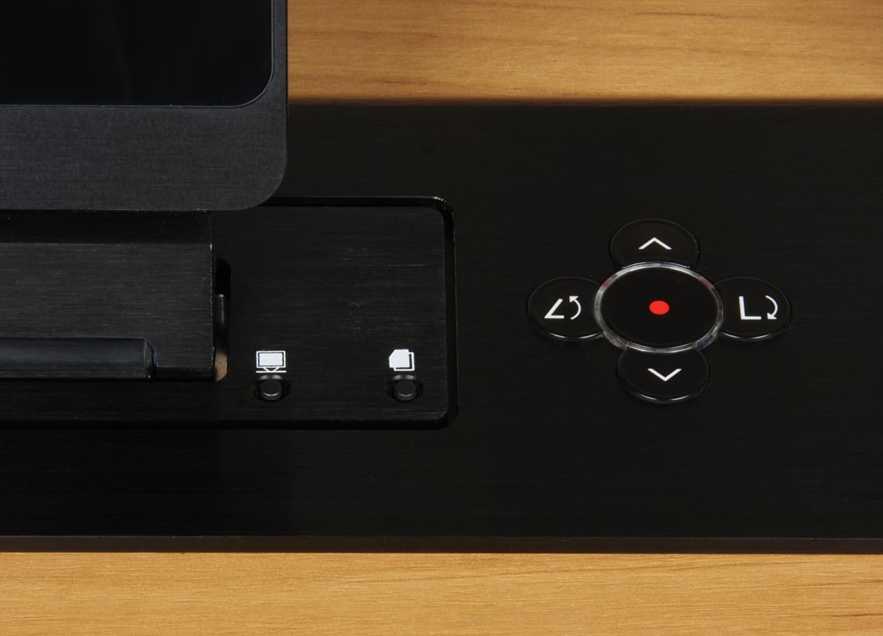 При нажатии на кнопку вверх монитор сначала поднимается, а потом отклоняется назад на максимальный угол, а при нажатии на кнопку вниз — монитор переводится в вертикальное положение и убирается внутрь. Правой кнопкой монитор отклоняется вперед, а левой — назад. При этом во время изменения угла наклона или подъема/опускания монитора пользователь может нажать на центральную кнопку, выключив привод монитора и зафиксировав текущий угол наклона или высоту. Второе, конечно, имеет смысл делать только в каких-то экстренных случаях.