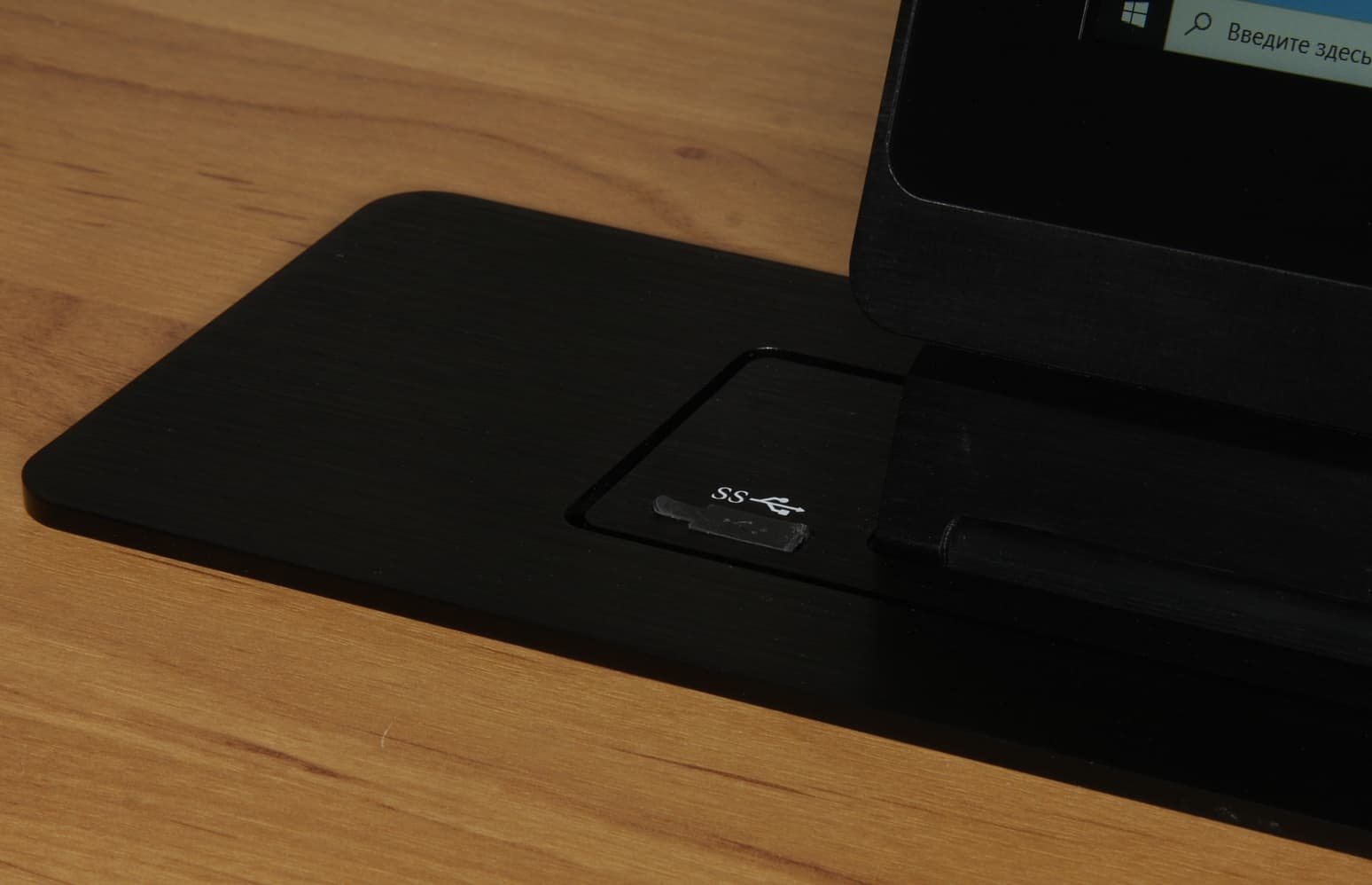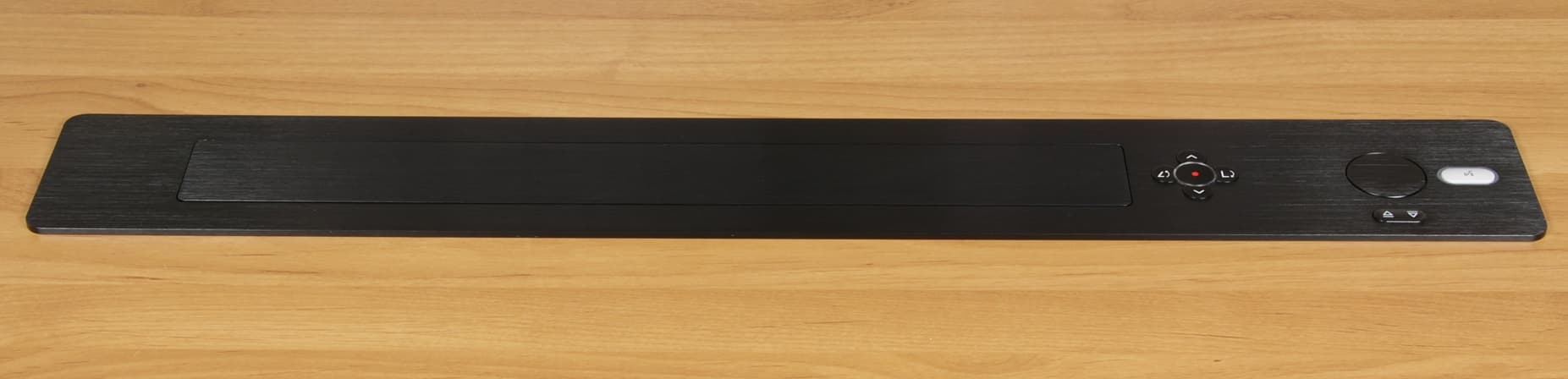 Верхняя панель толщиной 4 мм, которая выступает над столешницей и на которой держится вся лифтовая система, изготовлена из алюминиевого сплава. Панель можно утопить в столешницу, чтобы поверхность стола стала ровной, но для этого придется сделать двухуровневое отверстие и точно подогнать углубление под верхнюю панель, что на порядок сложнее, чем выпилить прямоугольное отверстие с довольно большими допусками. Поверхность верхней панели шлифована, но не полирована, анодирована и покрашена в черный цвет. Заявлено, что также доступны варианты с серебристым и коричневым цветом.