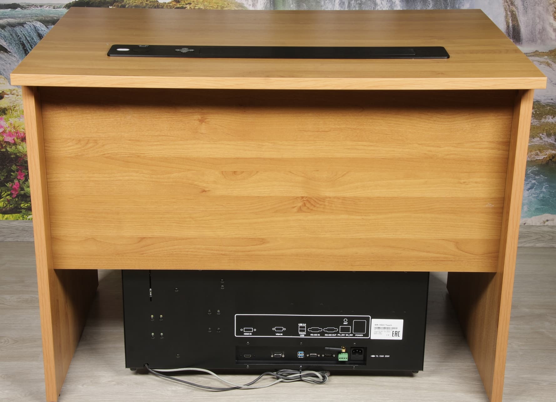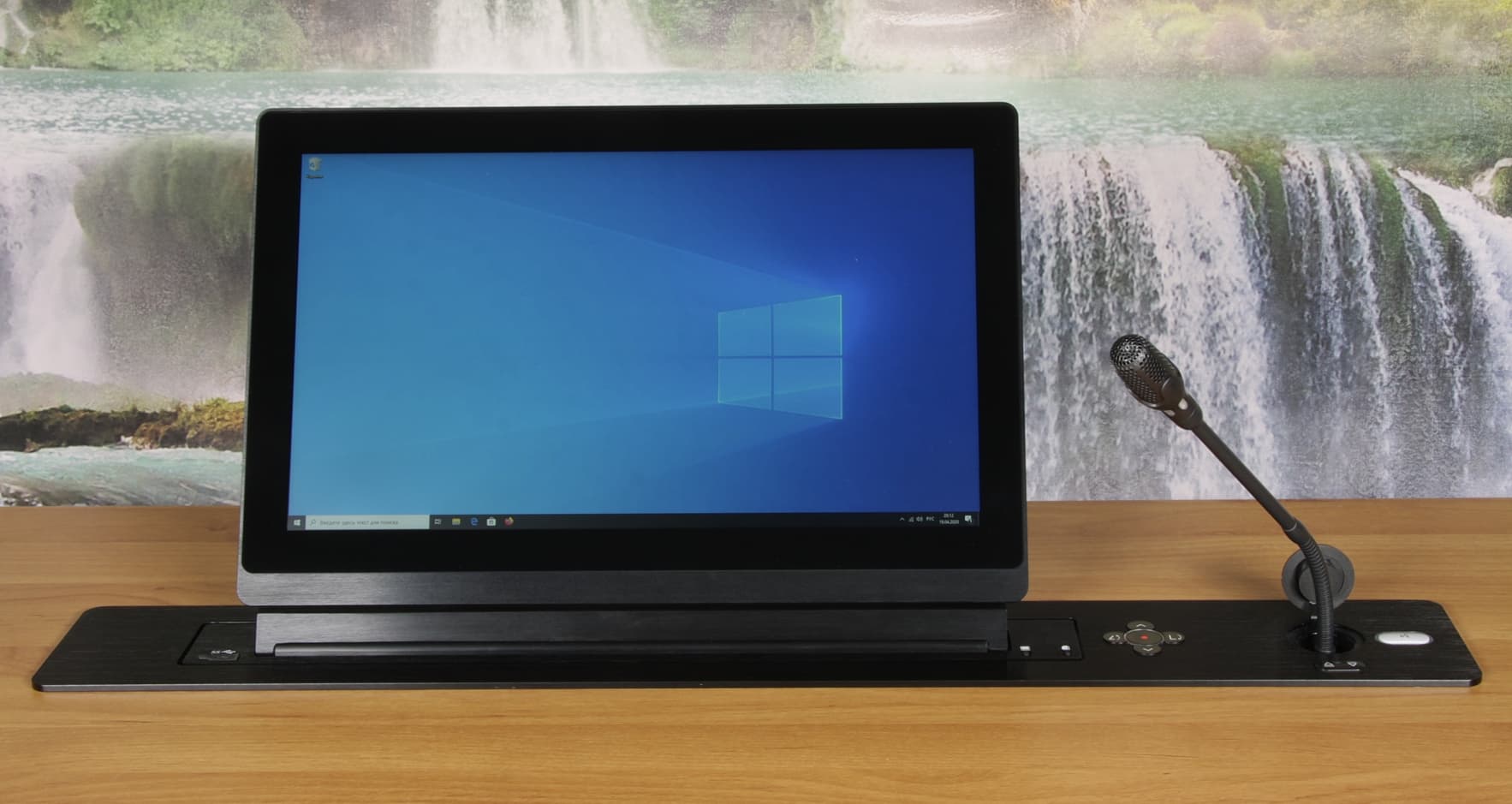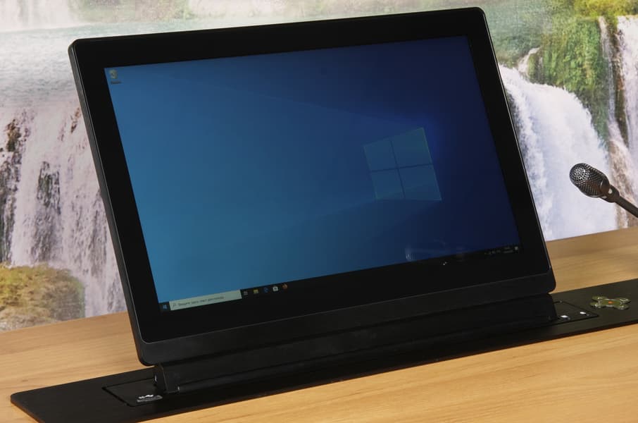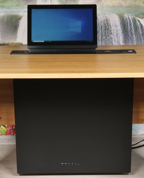 Лифтовая система Wize WR-15GV Touch оснащена выдвижным сенсорным экраном с диагональю 15,6 дюймов и лифтом для микрофона на гибкой стойке. Когда микрофон и монитор убраны, пользователю доступна практически вся площадь стола, так как верхняя панель системы плоская, узкая и выступает всего на 4 мм, а при необходимости панель может быть полностью утоплена в столешницу. Wize WR-15GV Touch отличается строгим дизайном и простотой установки. Она имеет хорошие возможности по удаленному управлению с помощью проводного и беспроводного интерфейсов. Подъем монитора и микрофона достаточно быстрый, что очень удобно. Уровень шума от лифтов монитора и микрофона невысокий, не мешает обсуждению при переговорах. По современным меркам параметры монитора средние, но в данном случае это не принципиально, с задачей вывода нужной пользователю информации он справится. Этот выдвижной монитор можно использовать, например, для оснащения стойки докладчика и мест зрителей в конференц-зале или для установки на места пользователей за столом для проведения совещаний, в кабинетах руководителей, в учебных аудиториях и т. д.